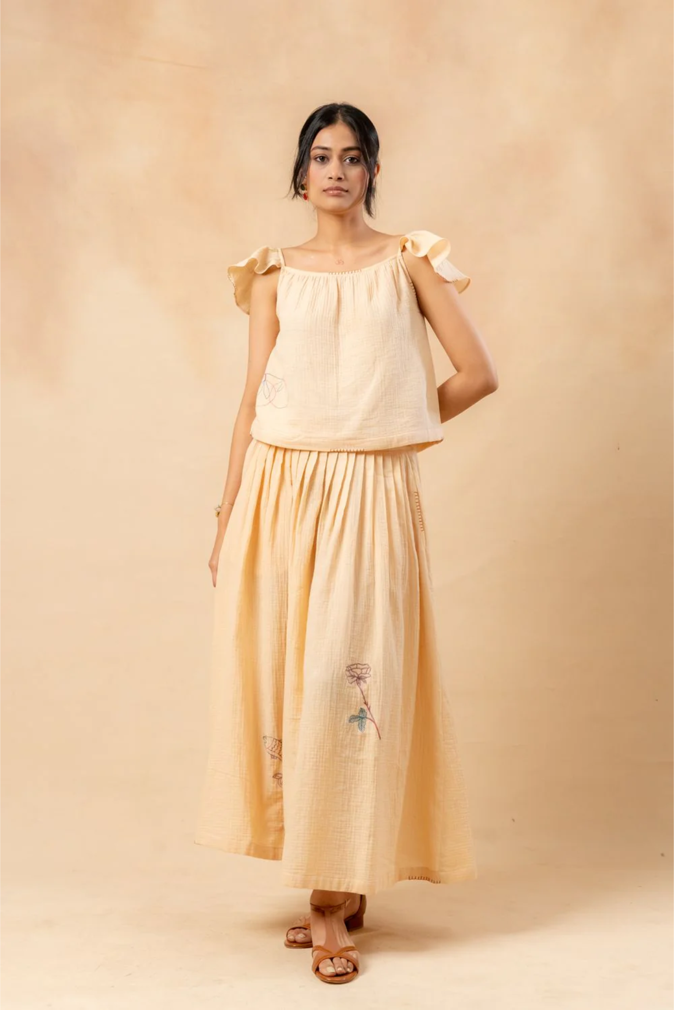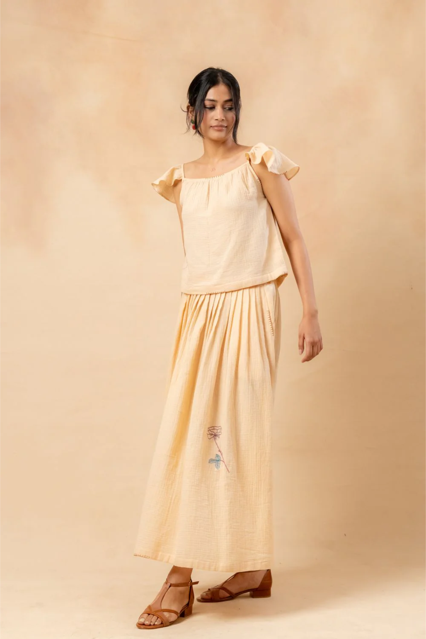 Short mega sleeve, can be styled with off shoulder, summer crop top with randomly placed doodle embroidery. Made in hand dyes azo-free colors with organic cotton material.