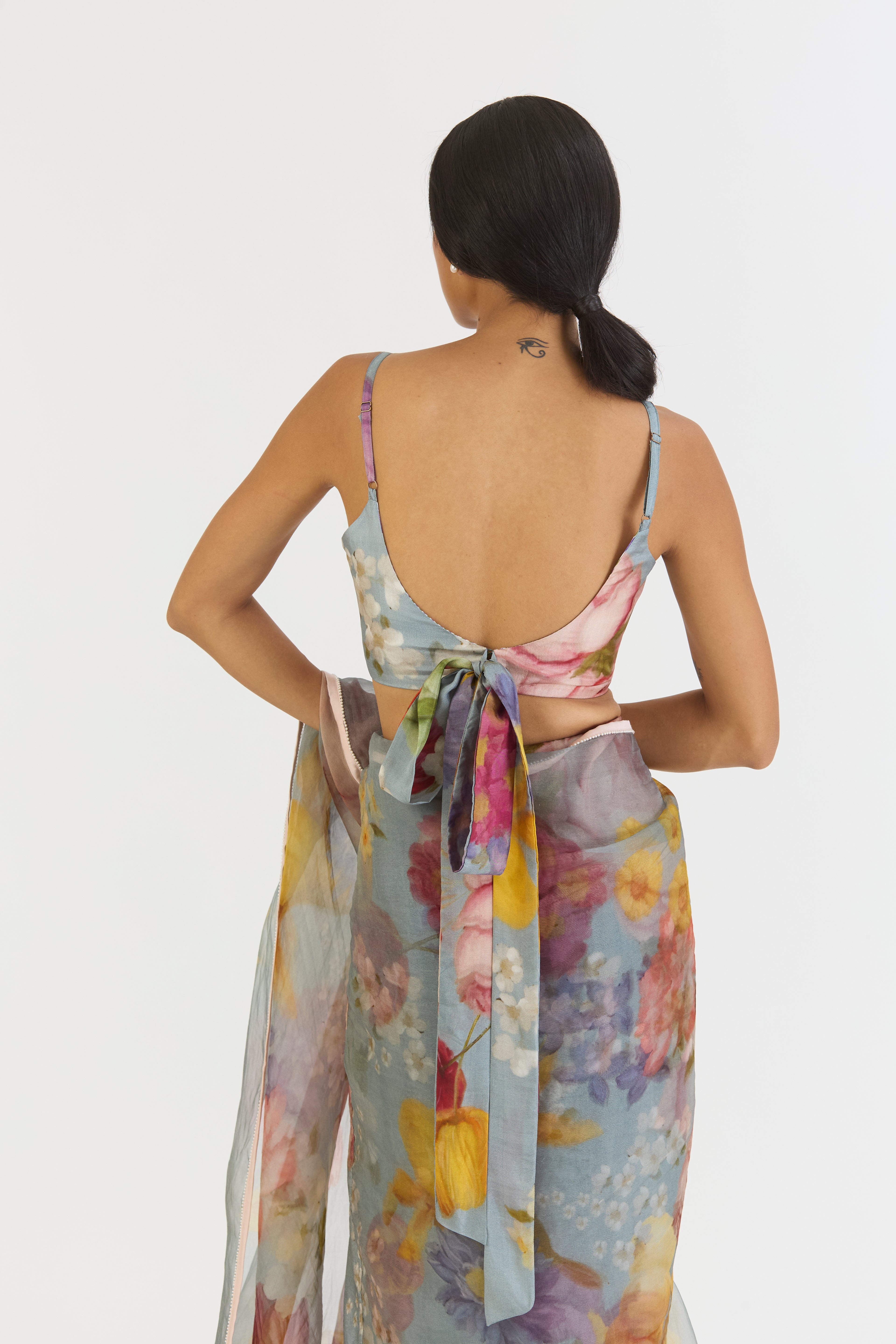 An extravagant artwork intertwining luscious fruits like peaches and cherries with opulent floral elements like peonies and roses, creating a rich tapestry of vibrant colors and textures fit for royalty. The Indigo Rose Blouse, meticulously crafted from pure silk for a luxurious feel. This blouse features a subtle U neckline at the front, enhanced by a princess panel for a flattering fit. At the back, hooks and a tie-up detail ensure a perfect fit, while adjustable straps provide added comfort and customization.