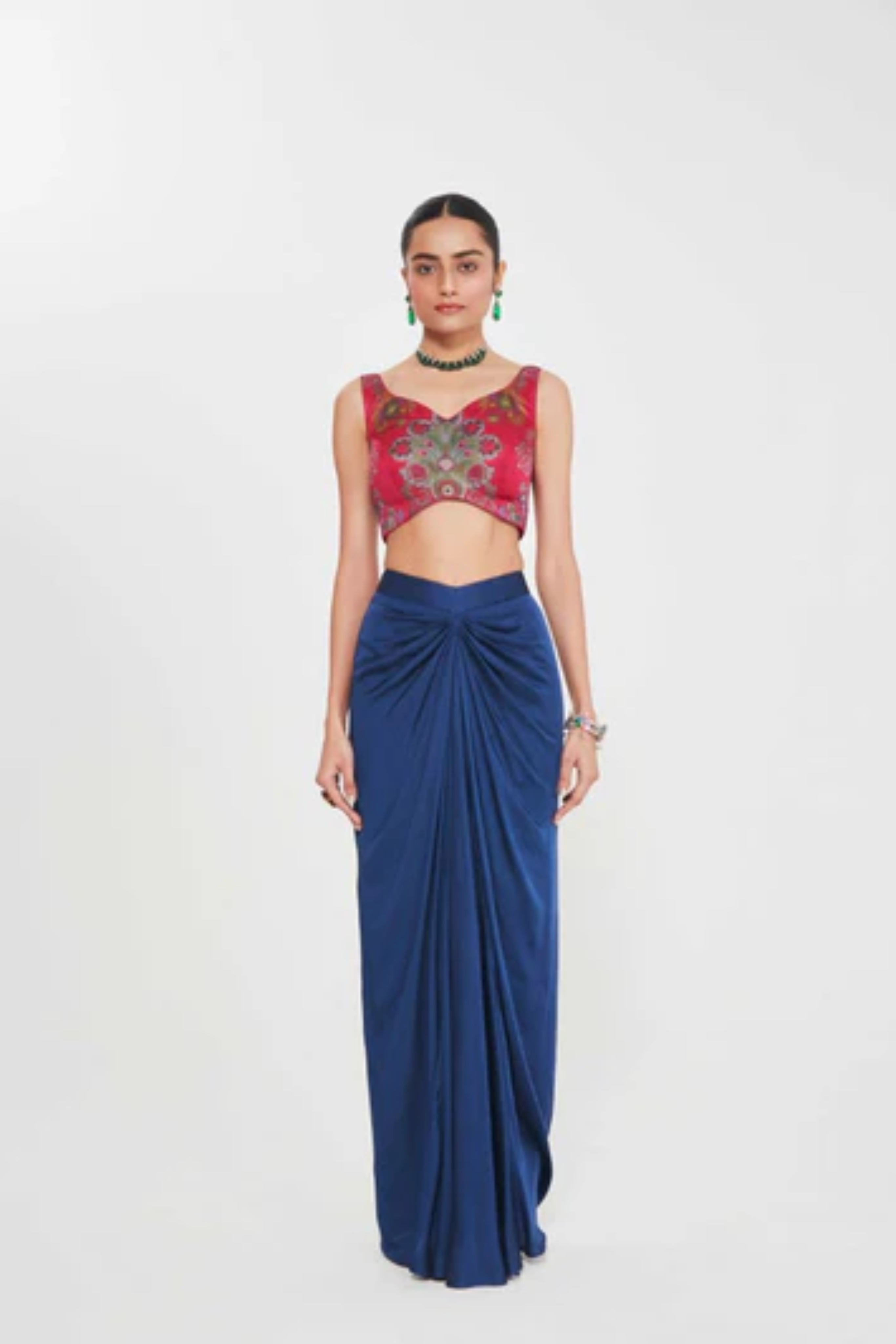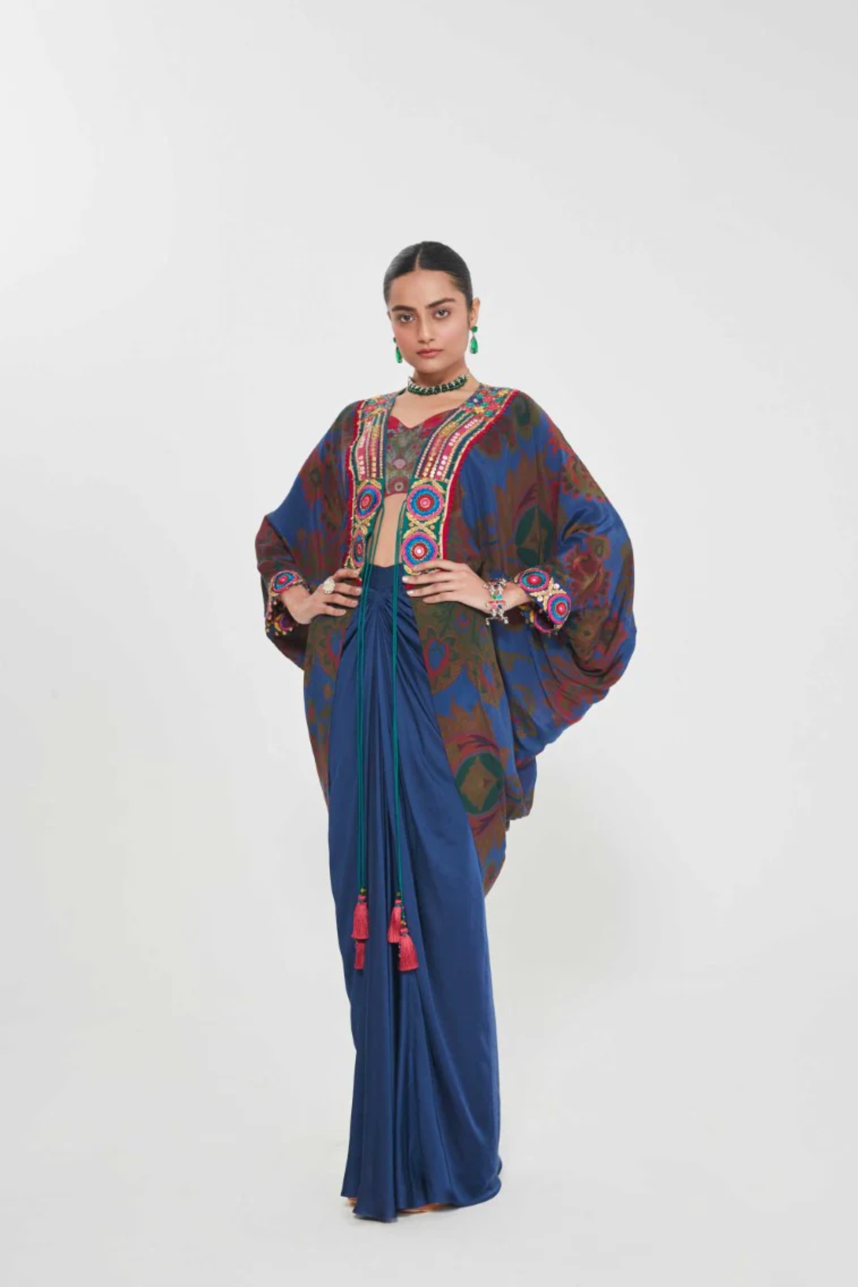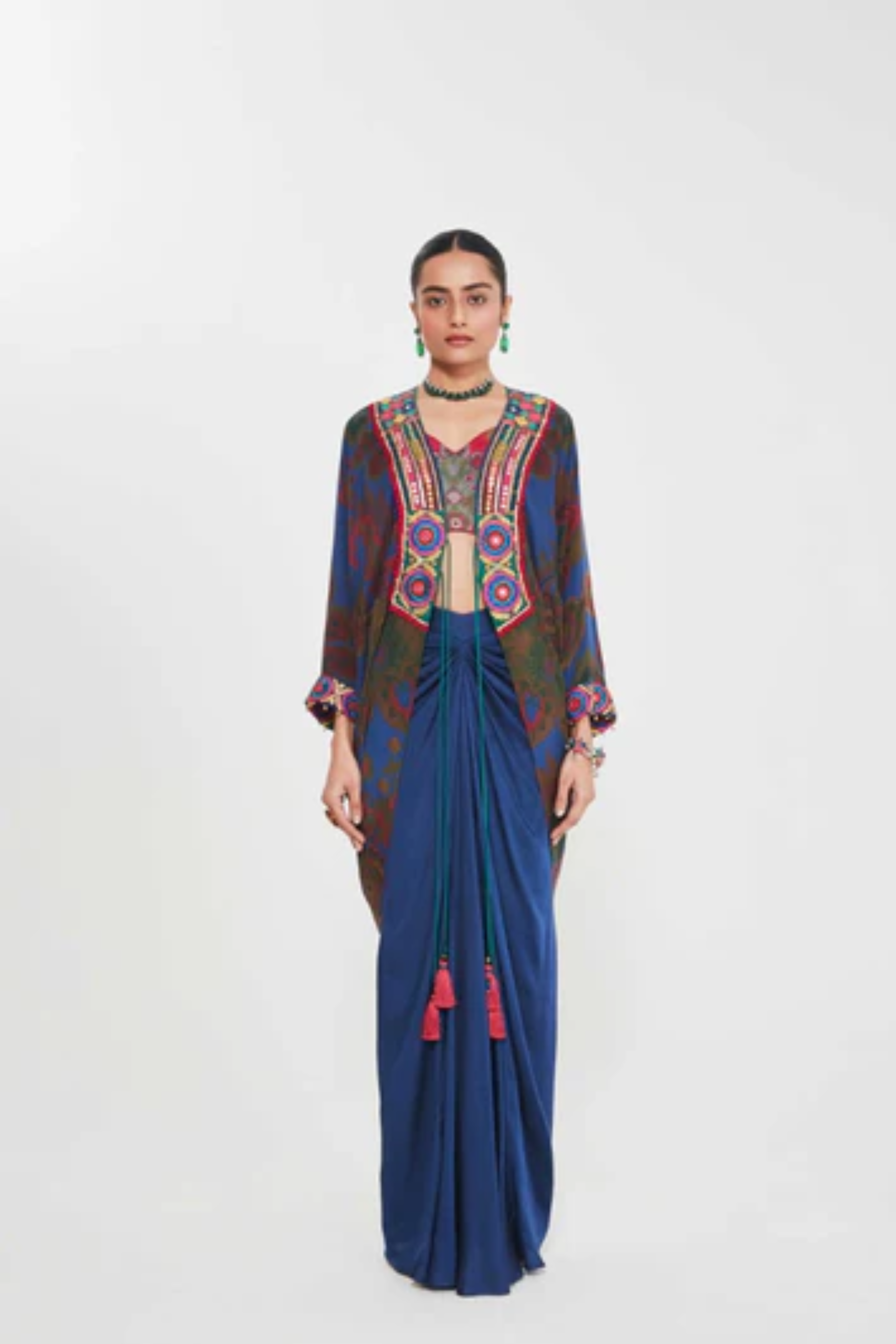 Description Sb Signature Midnight Blue Shrug Set With Intricate Hand Embellished Border Paired With Printed Blouse And Drape Skirt. Product Code