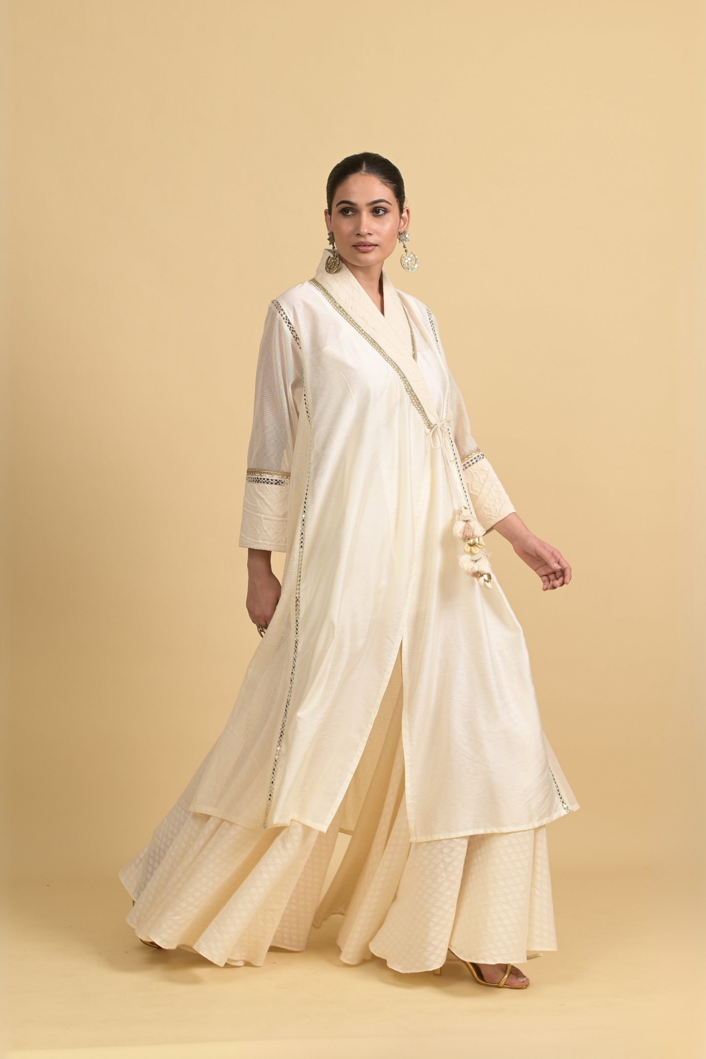 Fabric: Egyptian Cotton & Chanderi Silk Main Color: Ivory Design Elements: Delicate mirror-trim detailing Includes: Flair pants & Angrakha