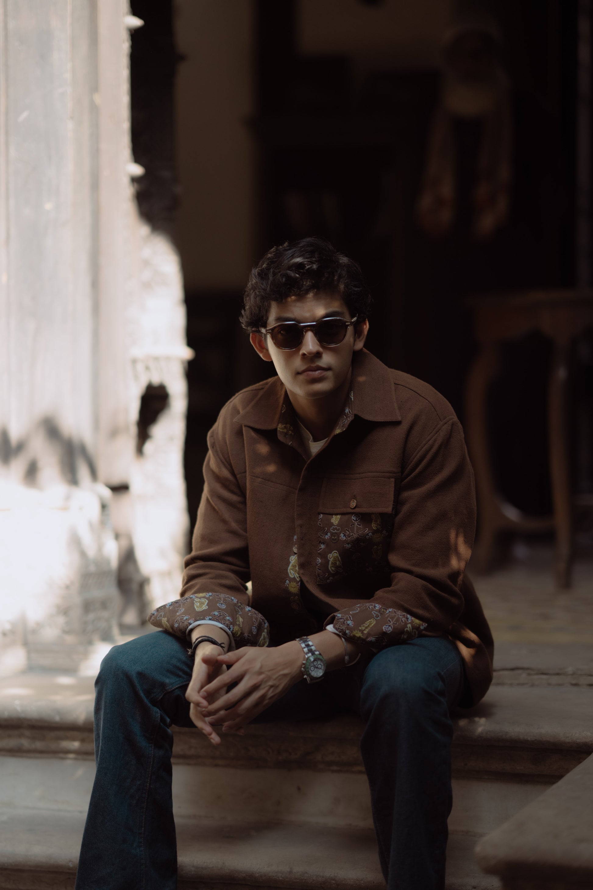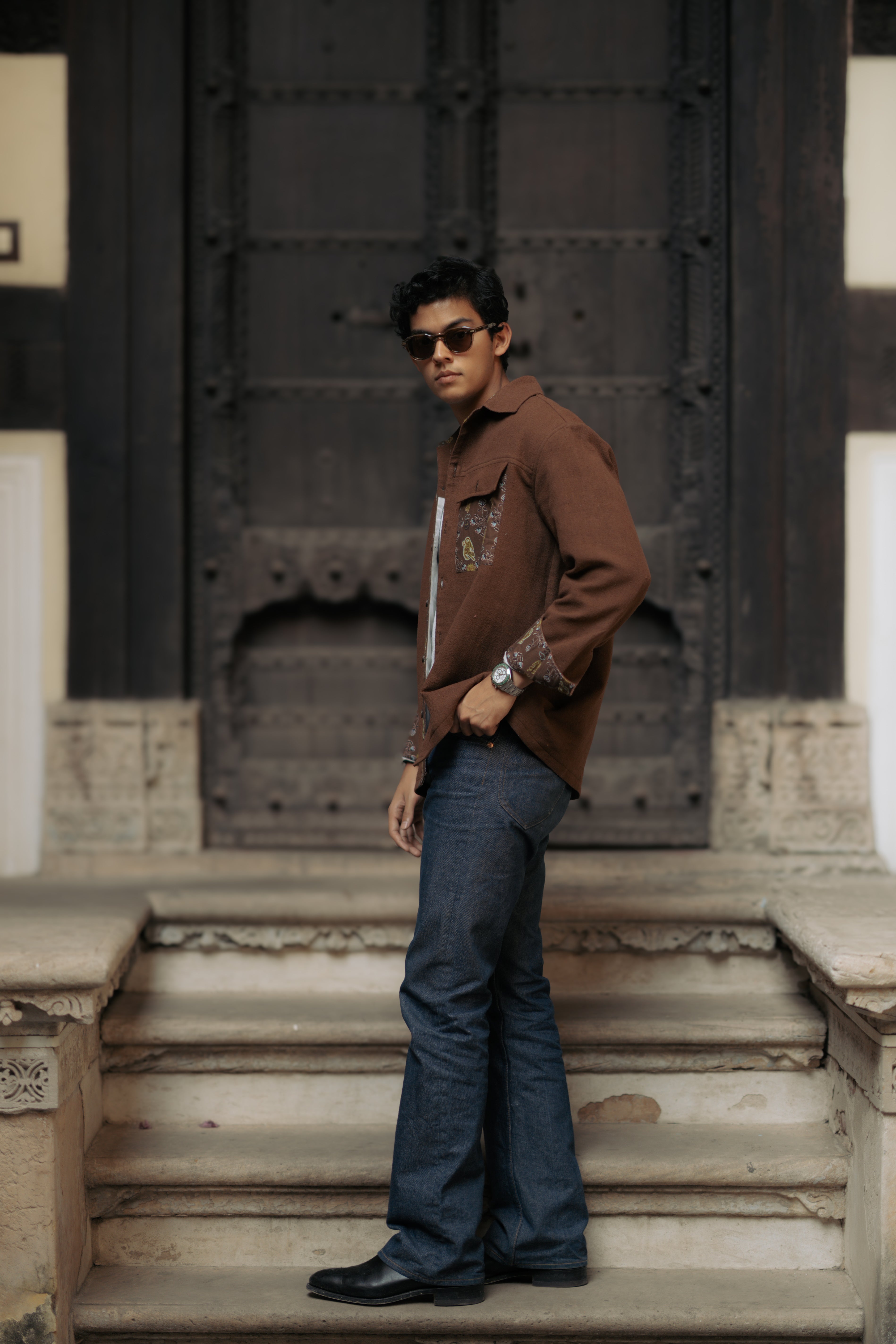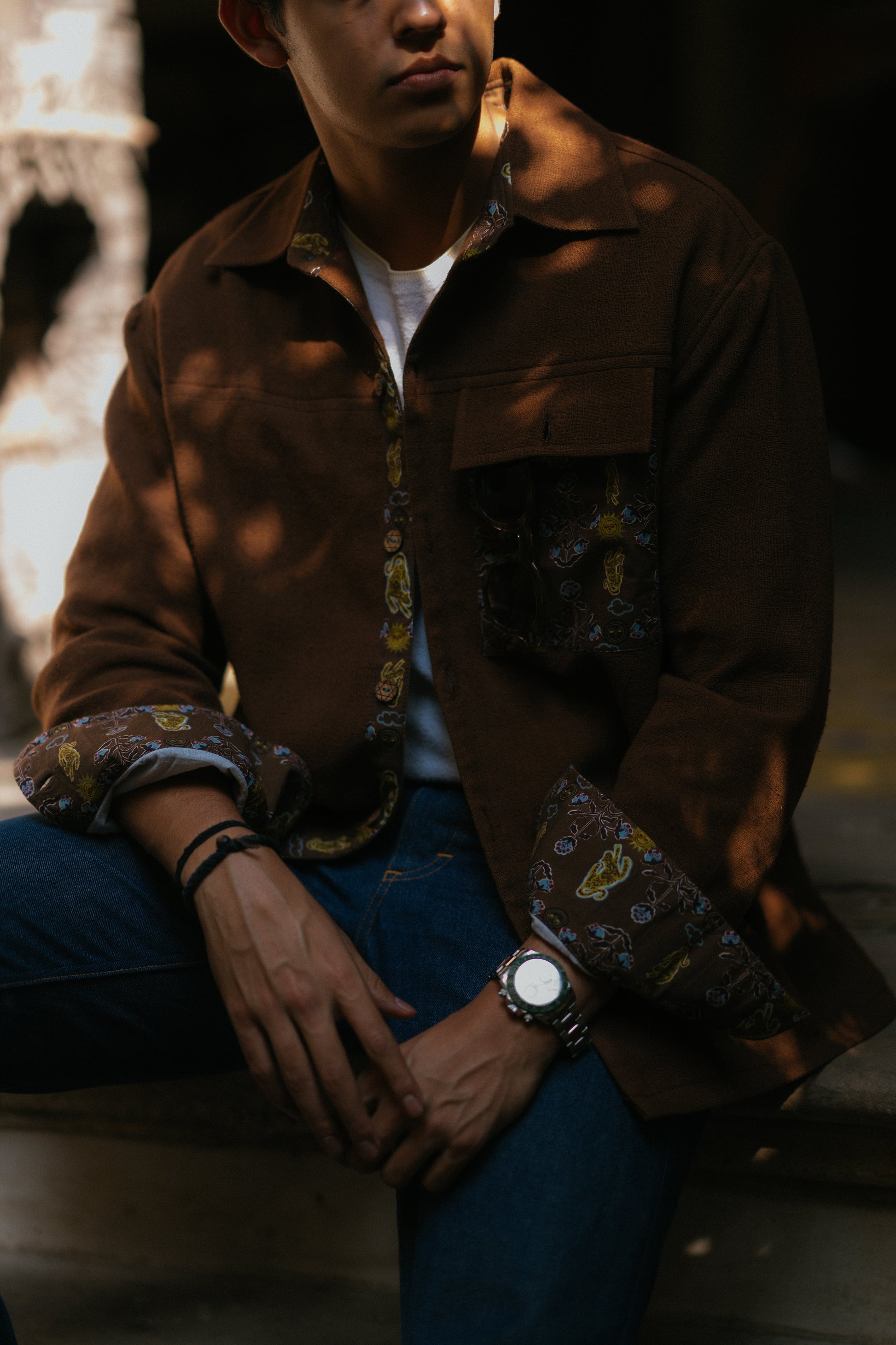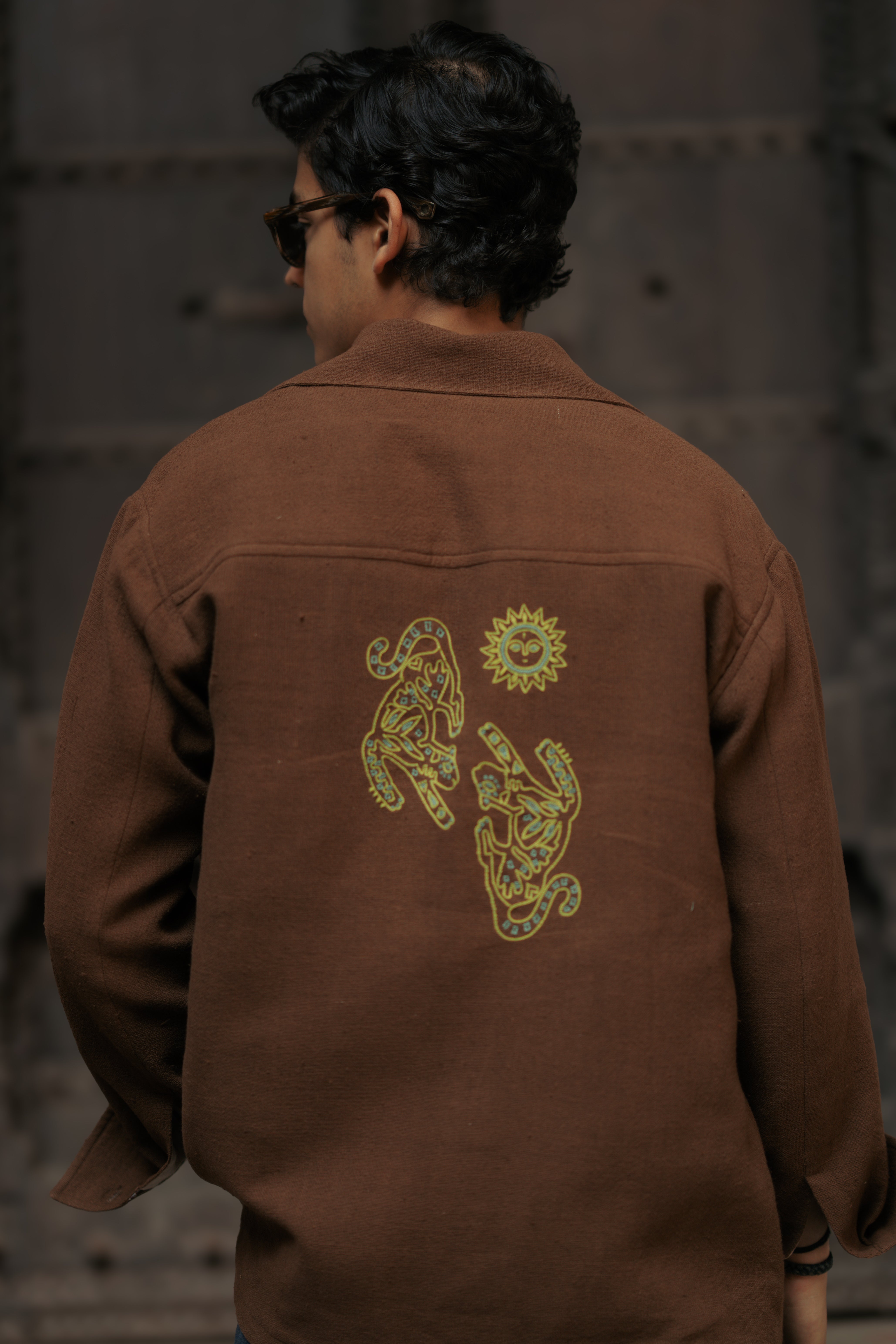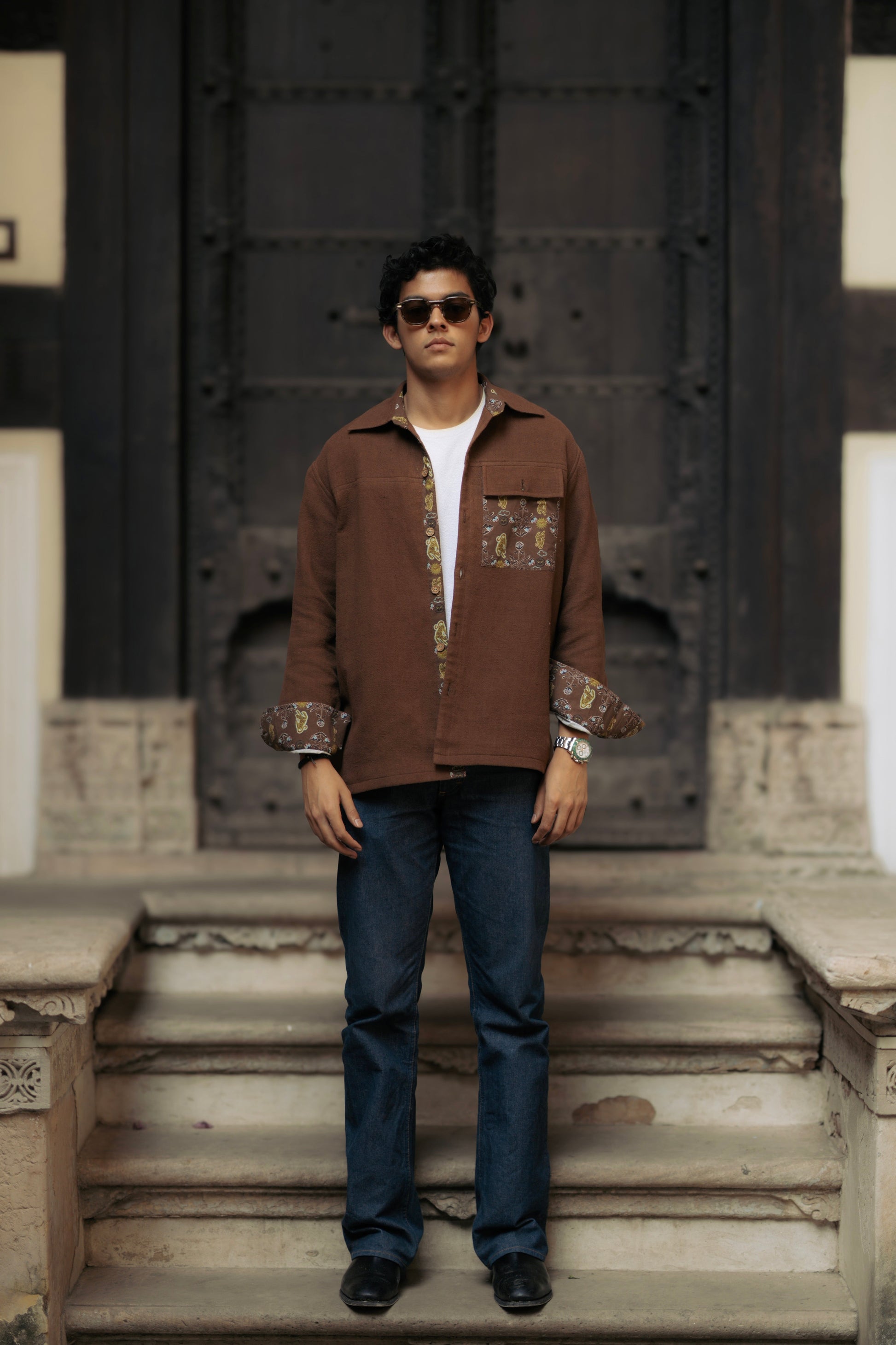 This Shacket is an exquisitely crafted piece designed for men seeking to elevate their everyday ensembles, it is lined with cotton on the inside. Featuring intricate Jaipuri Jade print detailing on the cuffs, it exudes a distinctive charm. The bold Jodhpuri buttons add a refined touch, further enhancing its sophisticated appeal. What truly sets this shacket apart is the elaborate animal embroidery on the back, making it an impeccable choice for any special occasions.