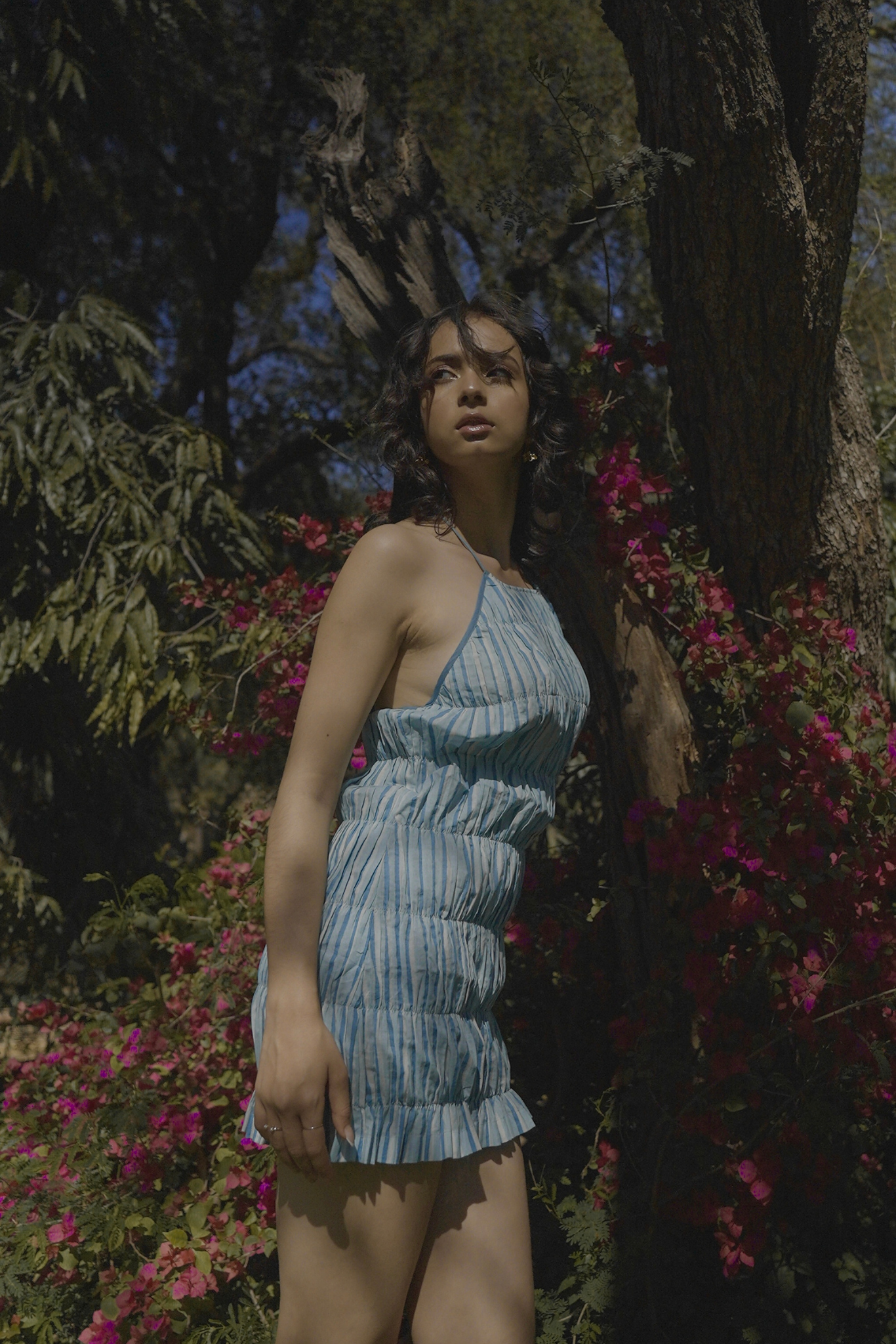This halter-neck striped mini dress is defined by its shirring, creating a textured, form-fitting look that enhances movement while ensuring a comfortable fit. The open-back design adds an element of allure, elegantly showcasing the shoulders and upper back.