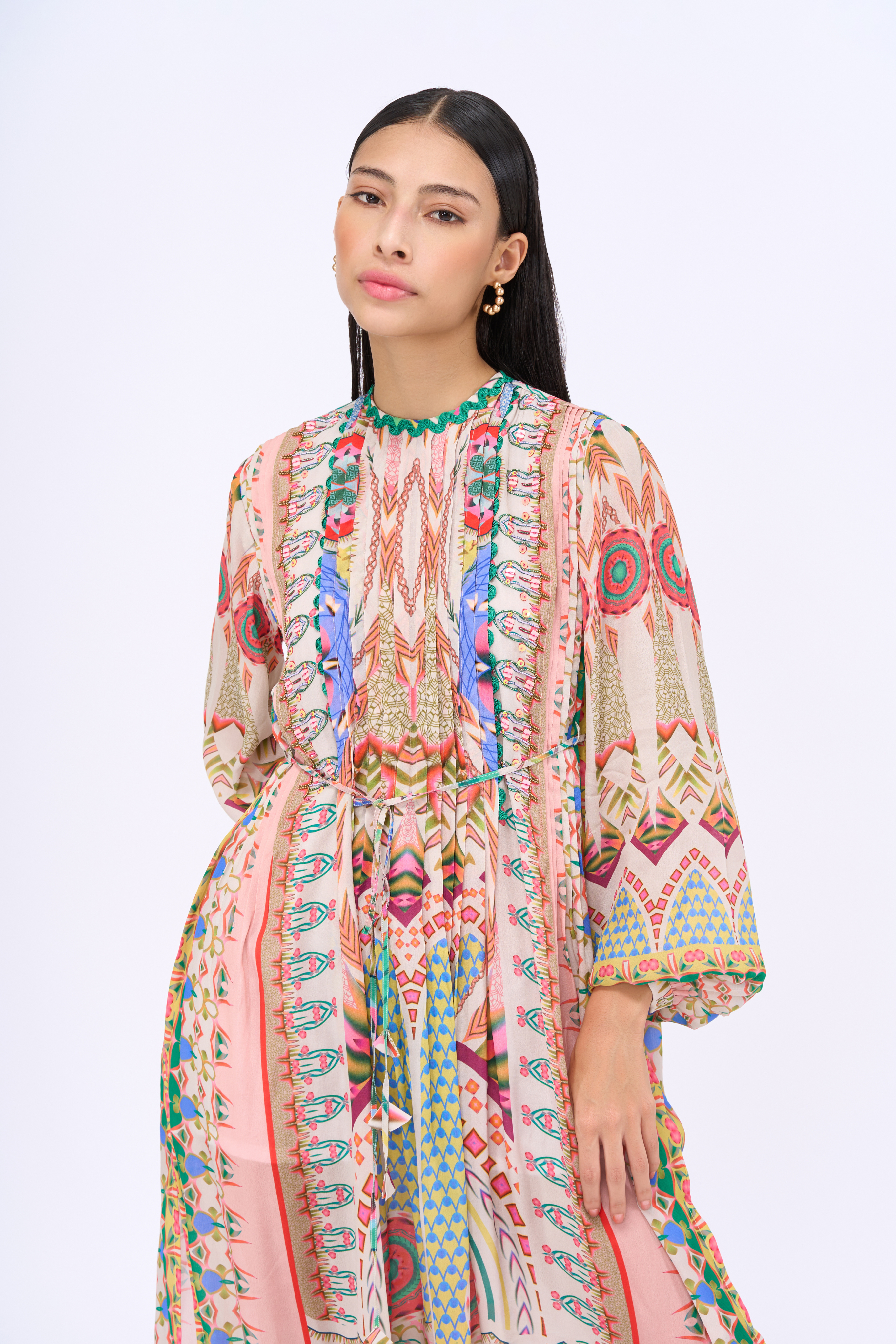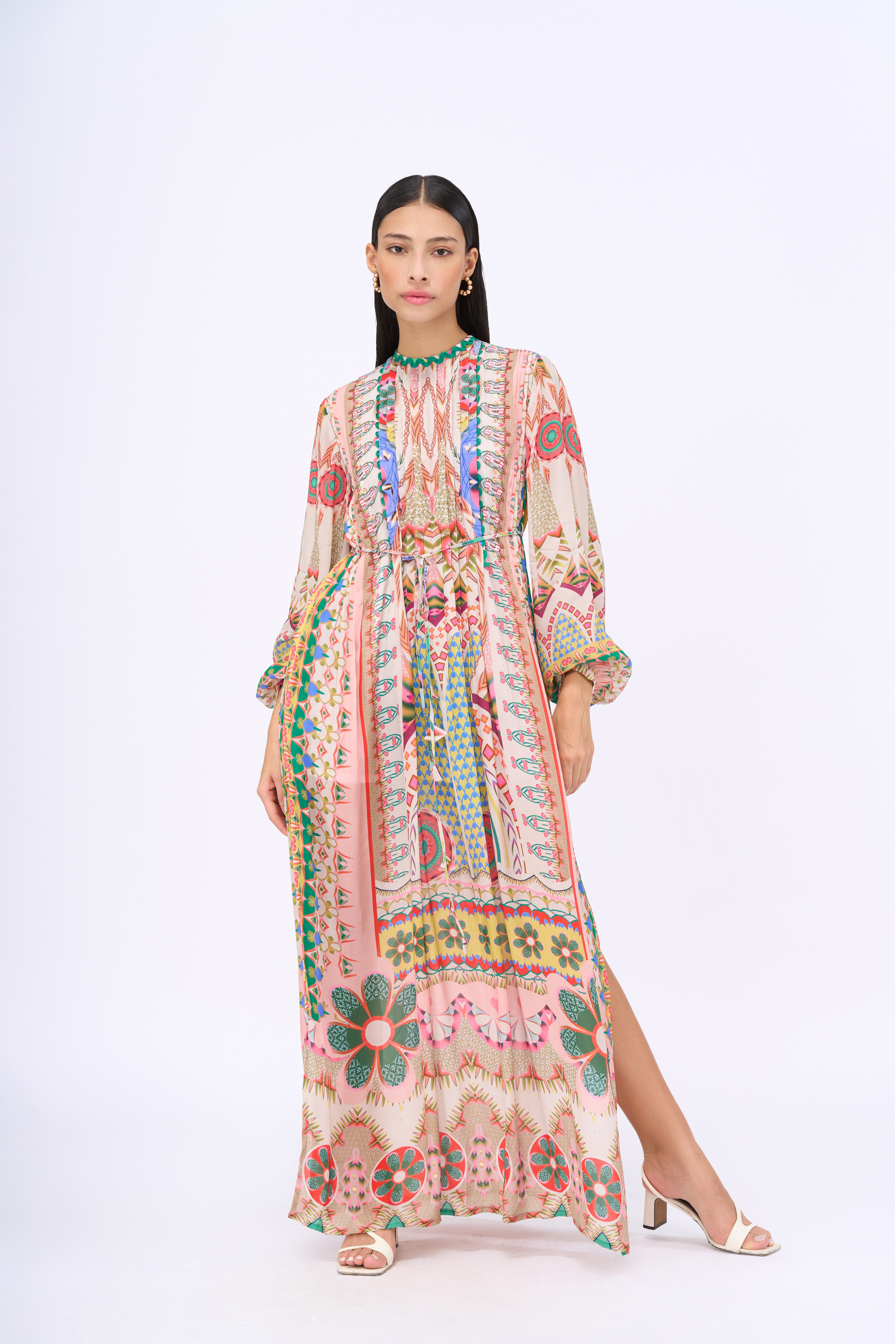 Kaleidoscopic print kaftan dress with pin tucks, hand embroidery detailing and side slit.
