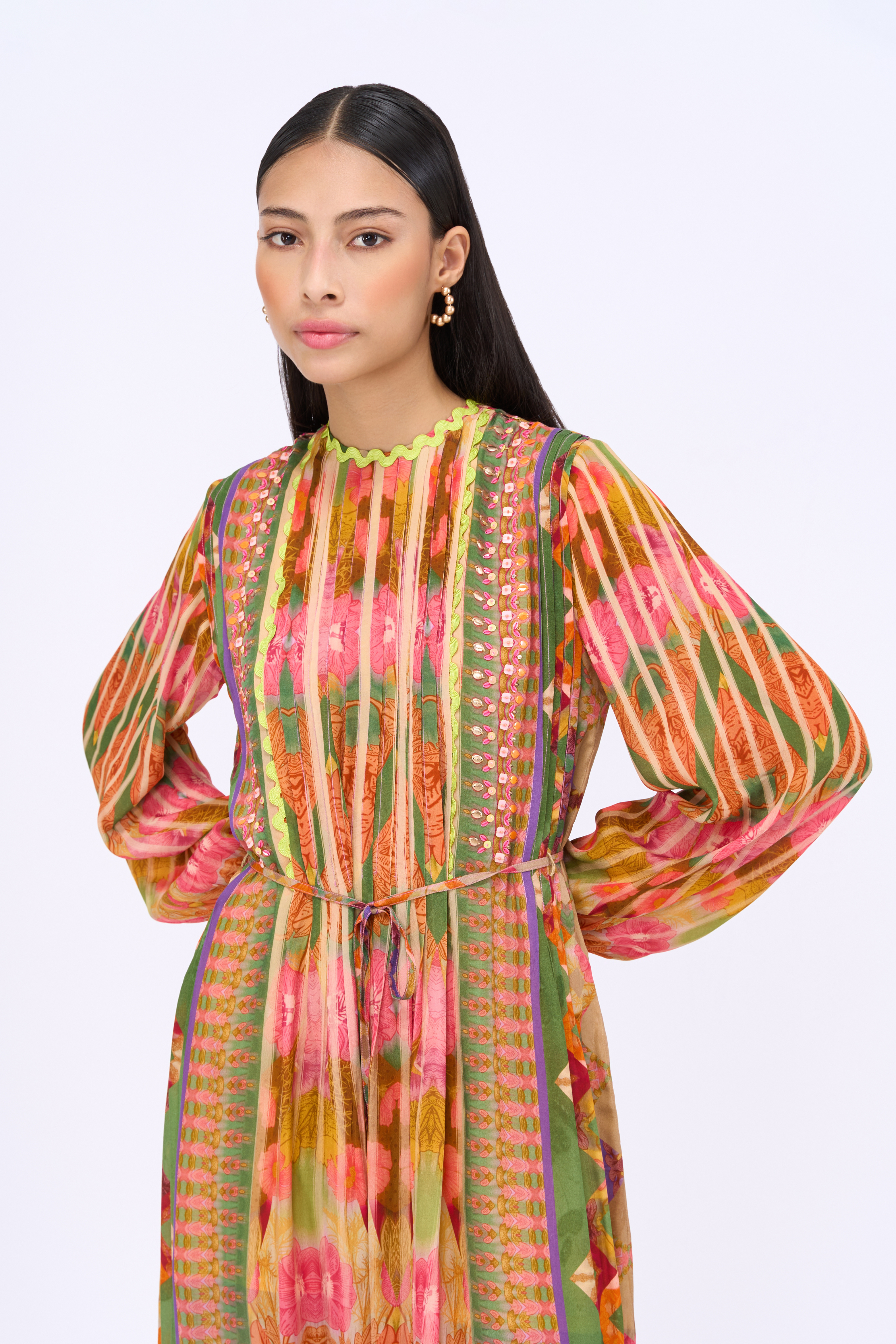 Product Description Kaftan dress with pin tucks and hand embroidery with engineered placement print and side slit with belt.