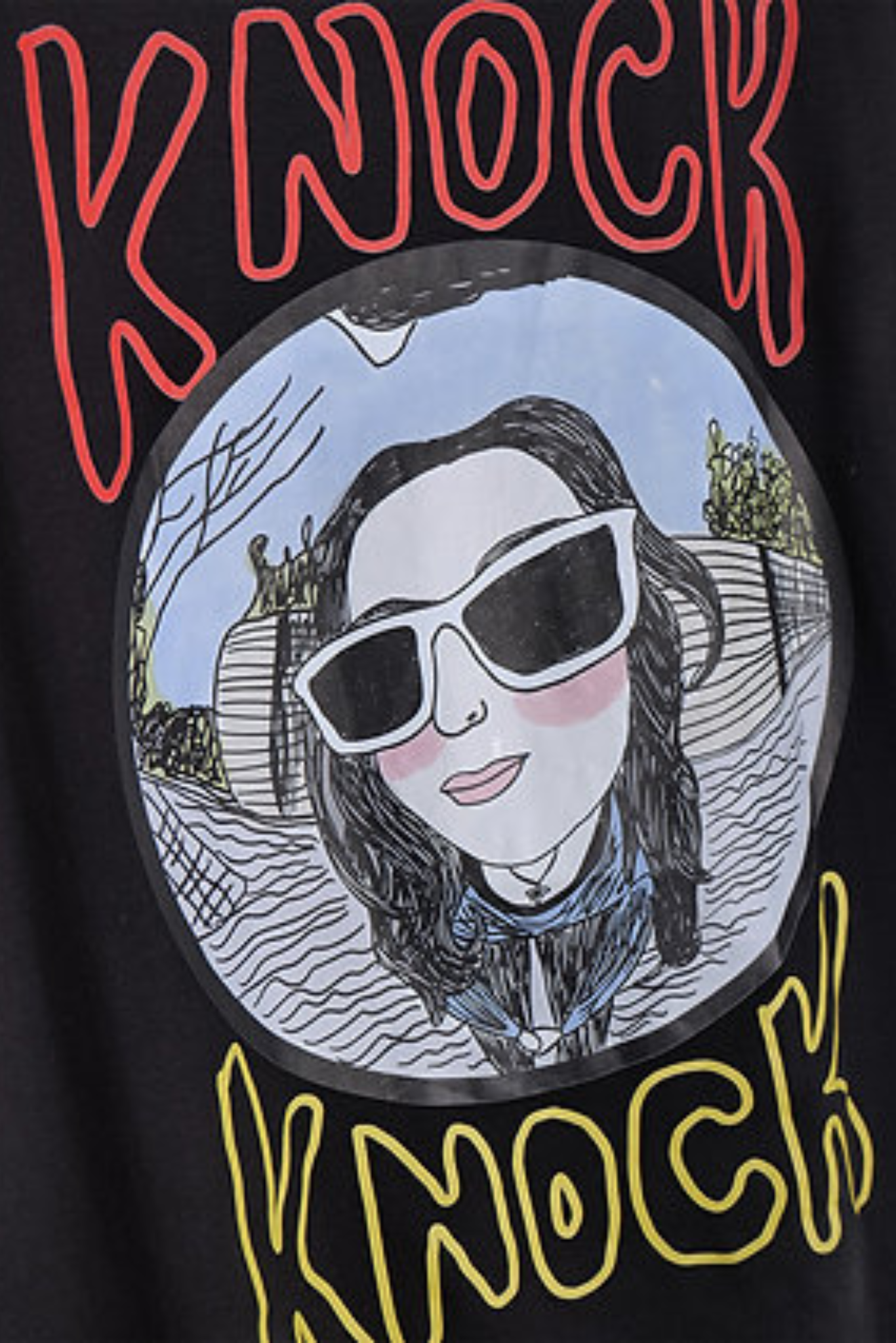 Black Unisex Oversized T with original illustration supporting mental health. “Knock Knock!” This knock is a call for attention, to wake up from your comfort zone, and to open doors to conversations, understanding, and fairness, reminding us to listen to those on the other side of the door, and take action.
