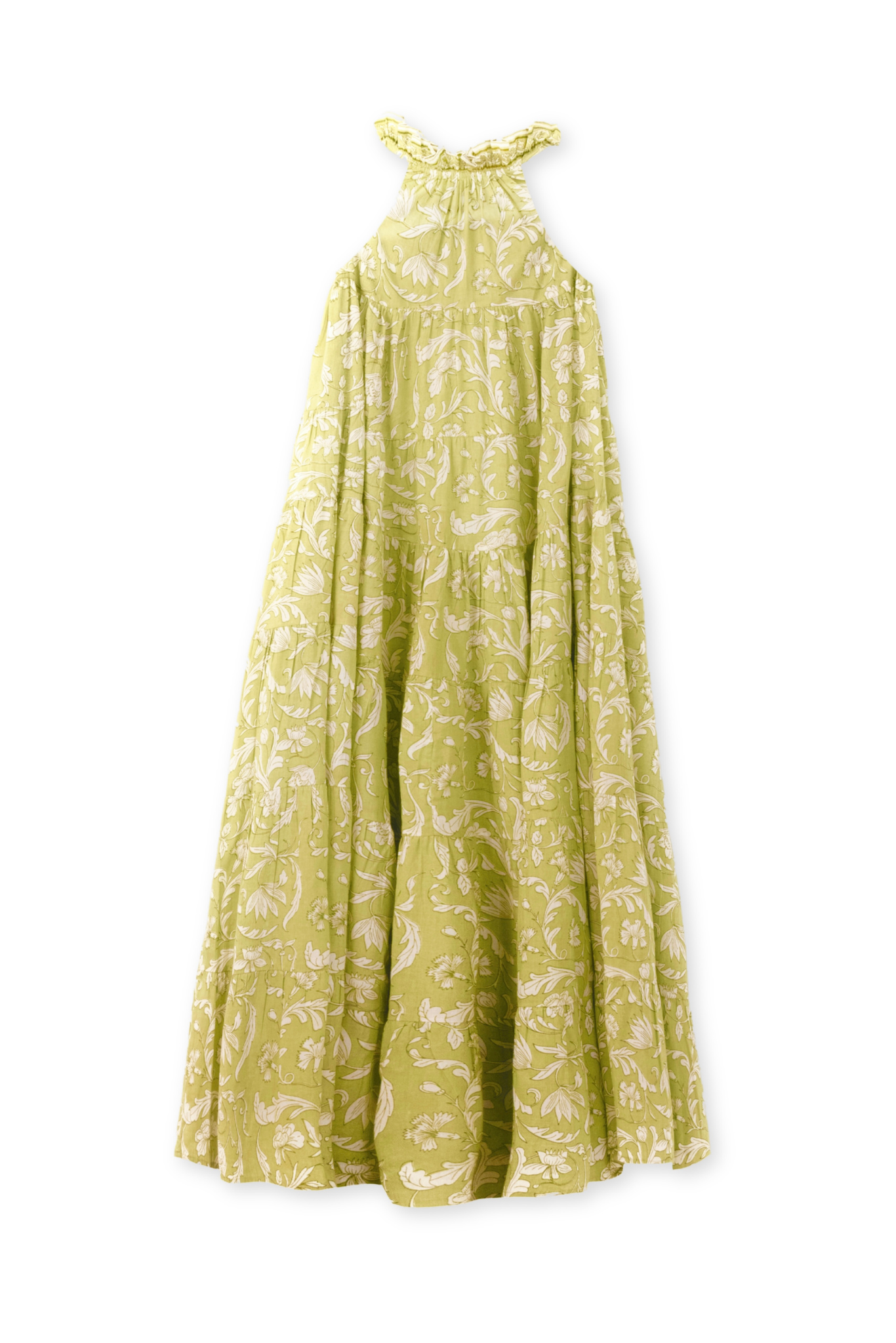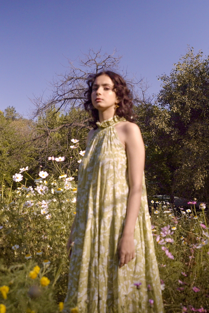 Designed for movement and ease, this halter-neck maxi dress embraces a free-spirited aesthetic with its gathered neckline and fluid silhouette. Crafted from soft cotton, it offers both comfort and breathability, making it perfect for sun-drenched days. The muted green hue, paired with a delicate floral pattern, enhances its natural and feminine appeal.
