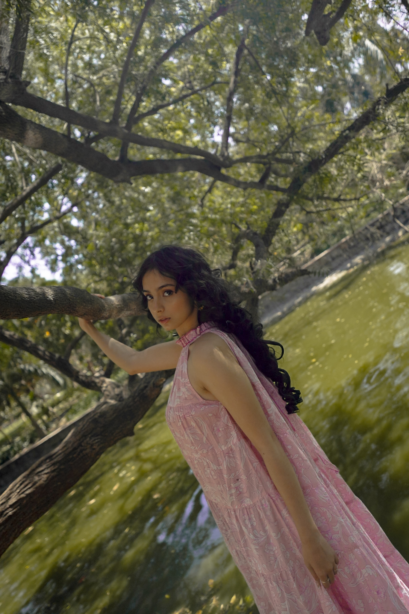 Designed for movement and ease, this halter-neck maxi dress embraces a free-spirited aesthetic with its gathered neckline and fluid silhouette. Crafted from soft cotton, it offers both comfort and breathability, making it perfect for sun-drenched days. The muted pink hue, paired with a delicate floral pattern, enhances its natural and feminine appeal.