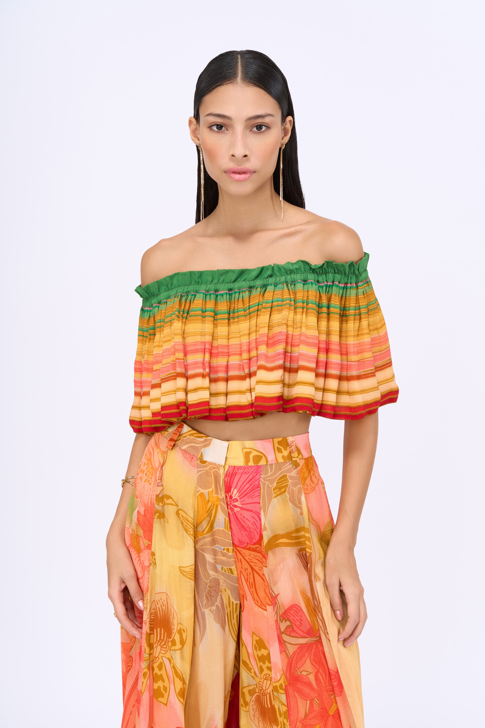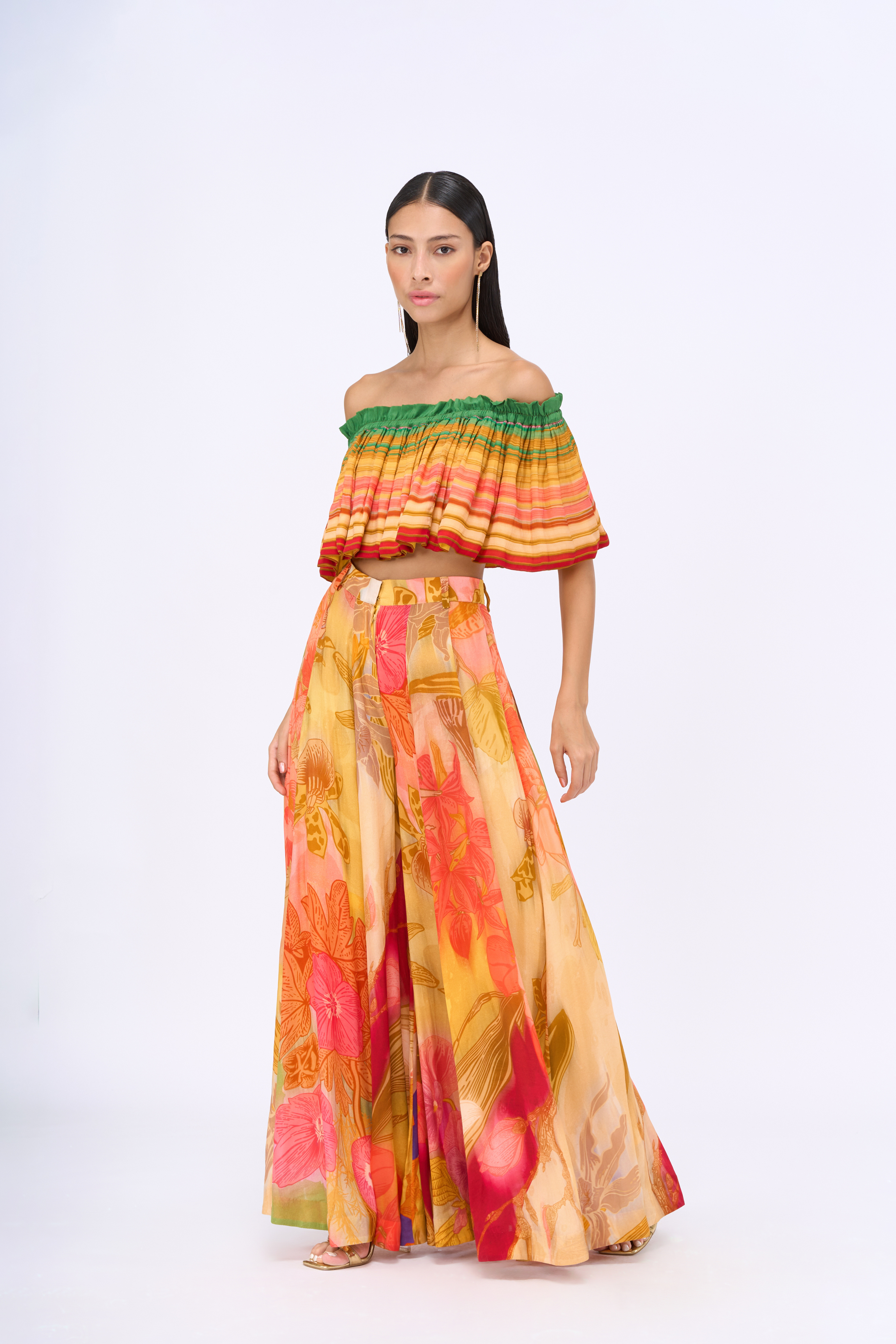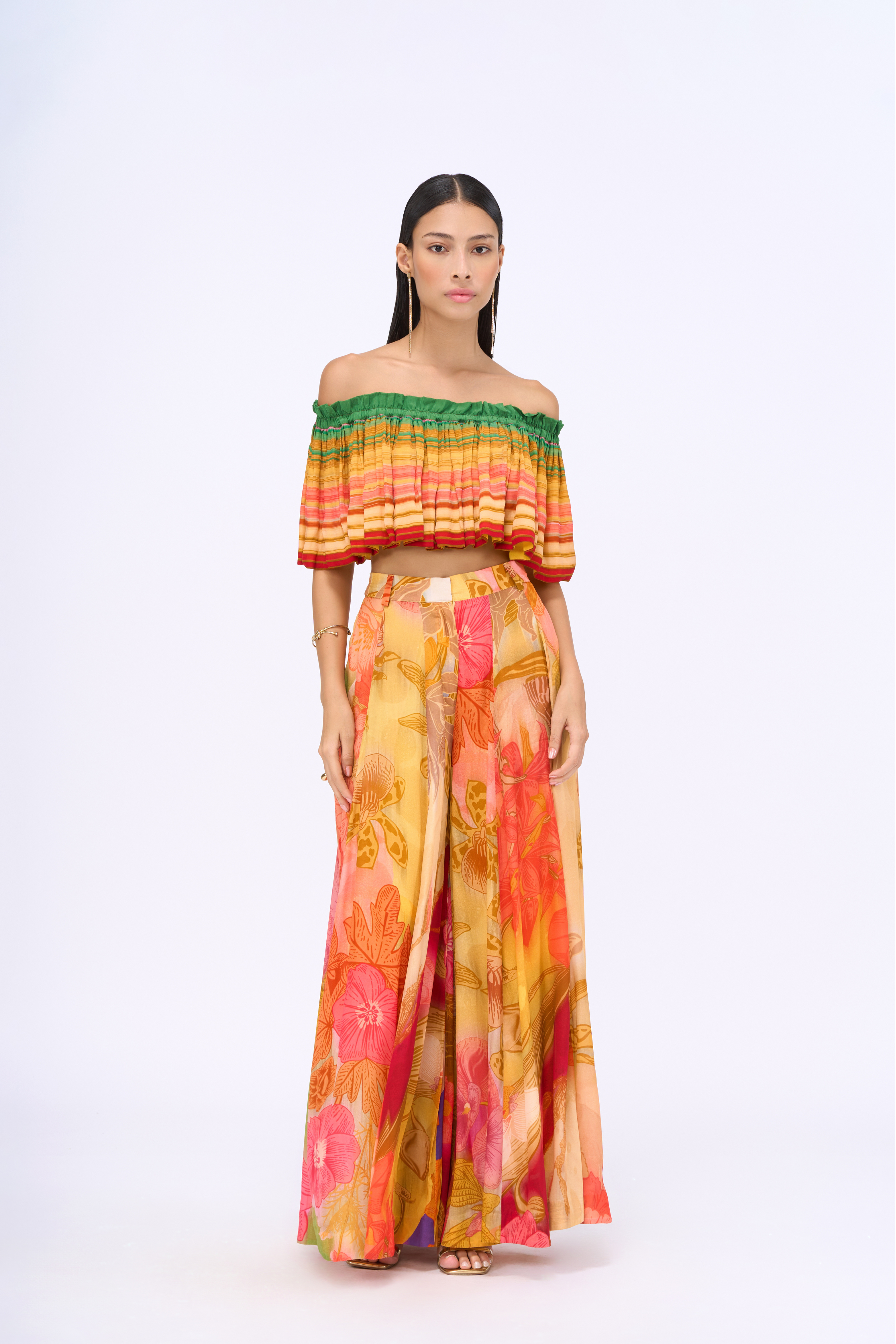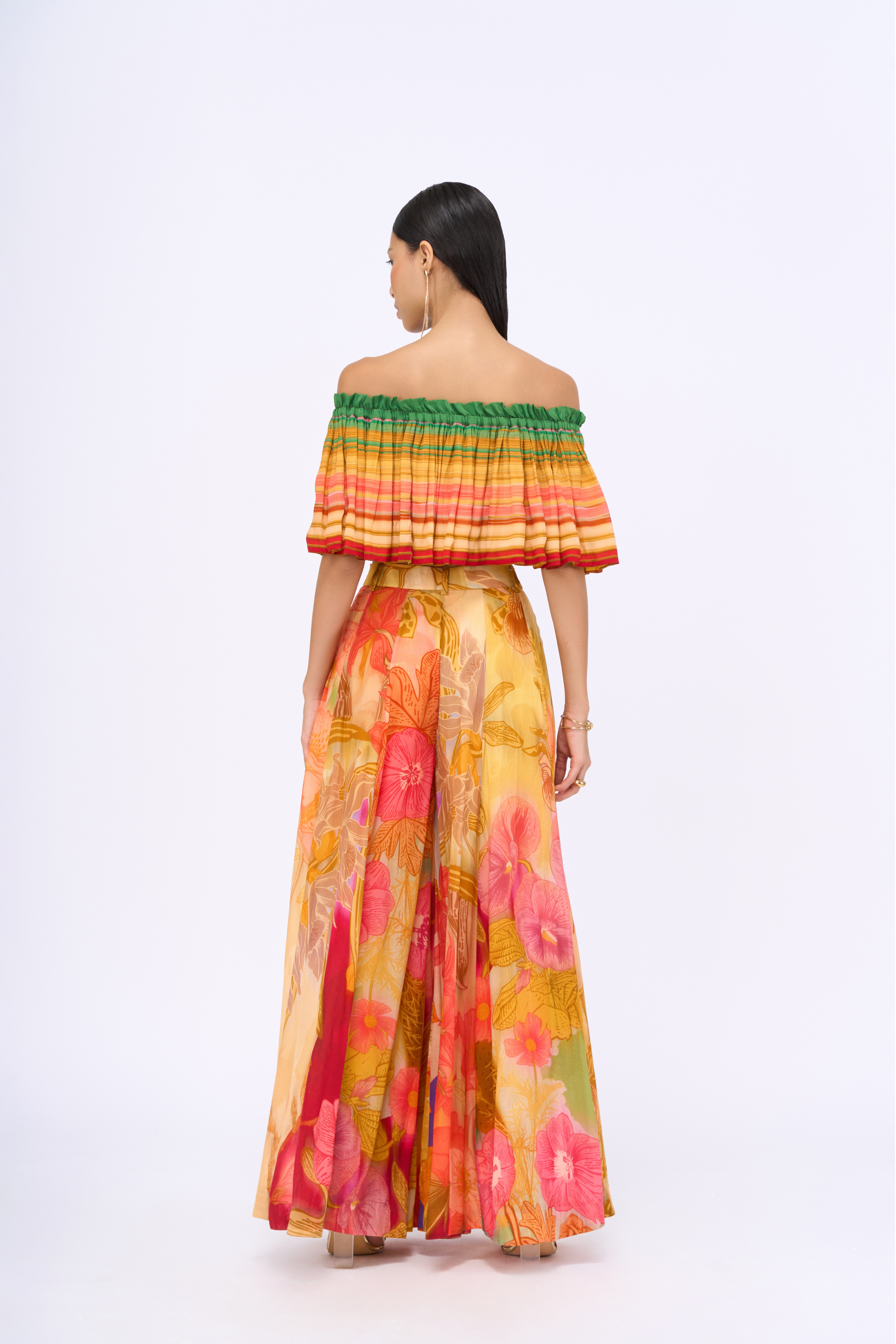 Product Description Stripes off shoulder flared top with wide leg pleated pants co-ord set.