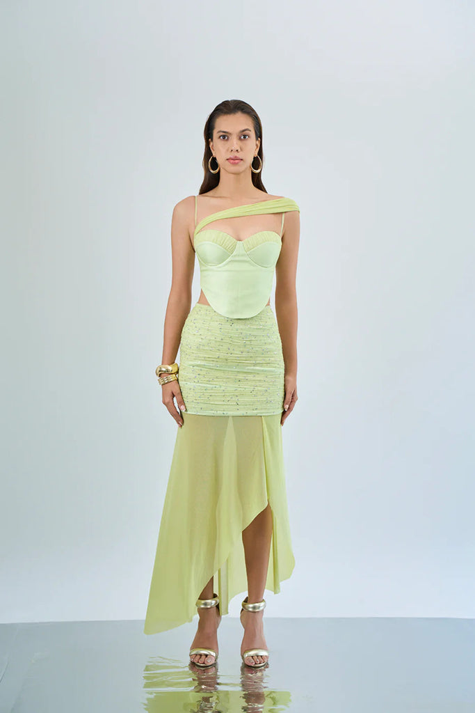 A Skirt featuring, a fully embellished mini base that hugs the hips, layered with a sheer, asymmetric overlay that flirts with every step. It’s light, fluid, and unapologetically bold—perfect for cocktails, rooftop nights, or any moment you want to steal the spotlight.