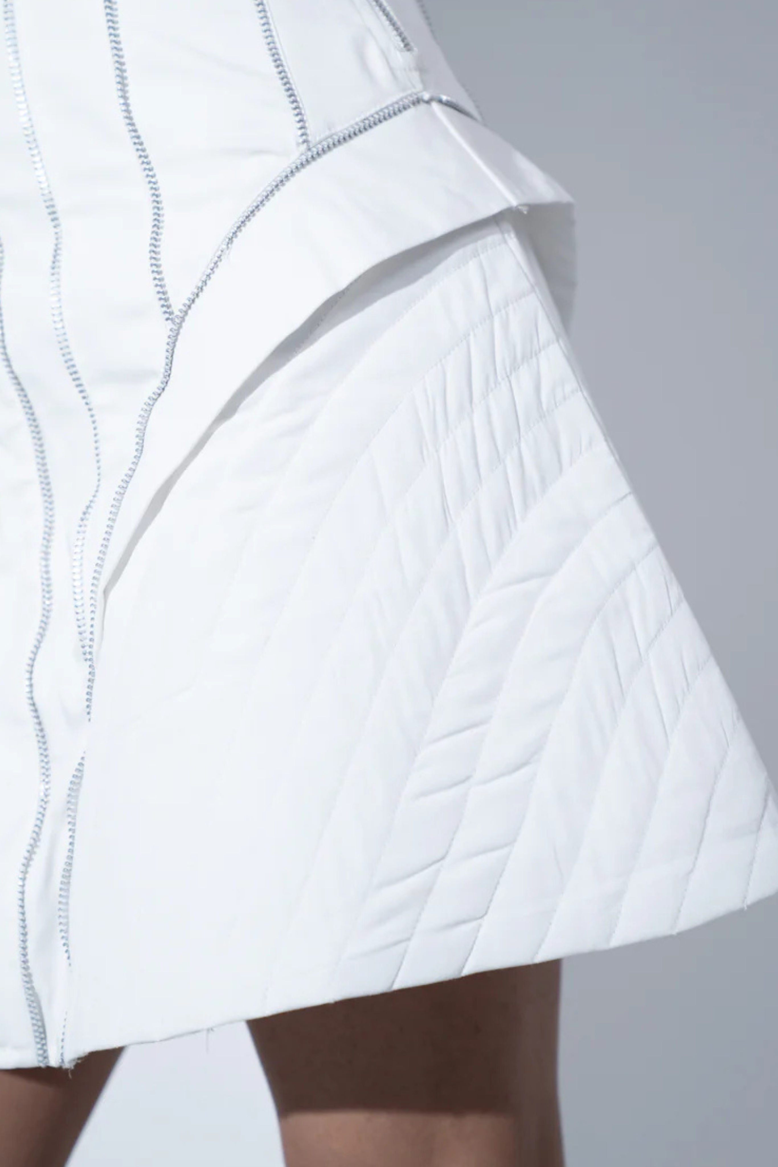 Crafted from breathable cotton poplin lycra, this white dress combines structure with ease. Thoughtfully placed panels are accentuated by metallic silver zippers — subtle yet striking, symbolising strength and precision. Curved arcs along the sides enhance the silhouette, adding a sculptural edge.