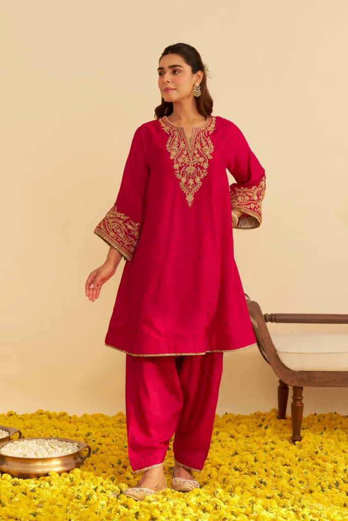 It features a zero neckline with a slit and three-quarter bell sleeves, finished with traditional Kiran detailing for added elegance. The ensemble is paired with a classic Dogri salwar, bringing together a perfect blend of tradition and style. The entire outfit is completed with a contrasting Banarasi fabric, enhancing its rich and timeless aesthetic.