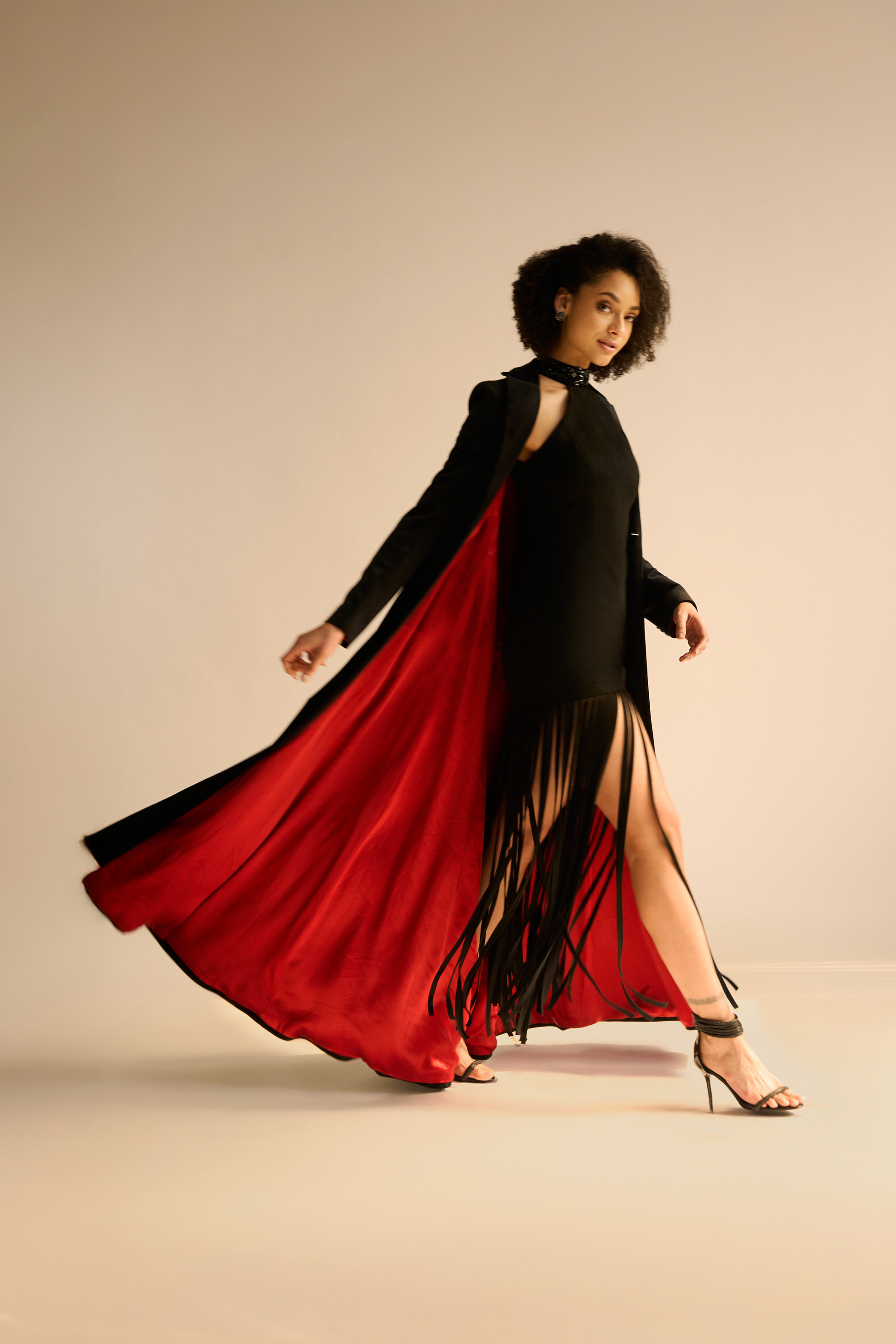 Featuring over the matrix dress is a long black velvet textured coat with a striking red satin lining, creating a dramatic visual contrast that commands attention as it flares open in motion. The coat elevates the entire ensemble, adding mystery and a touch of theatrical sophistication.
