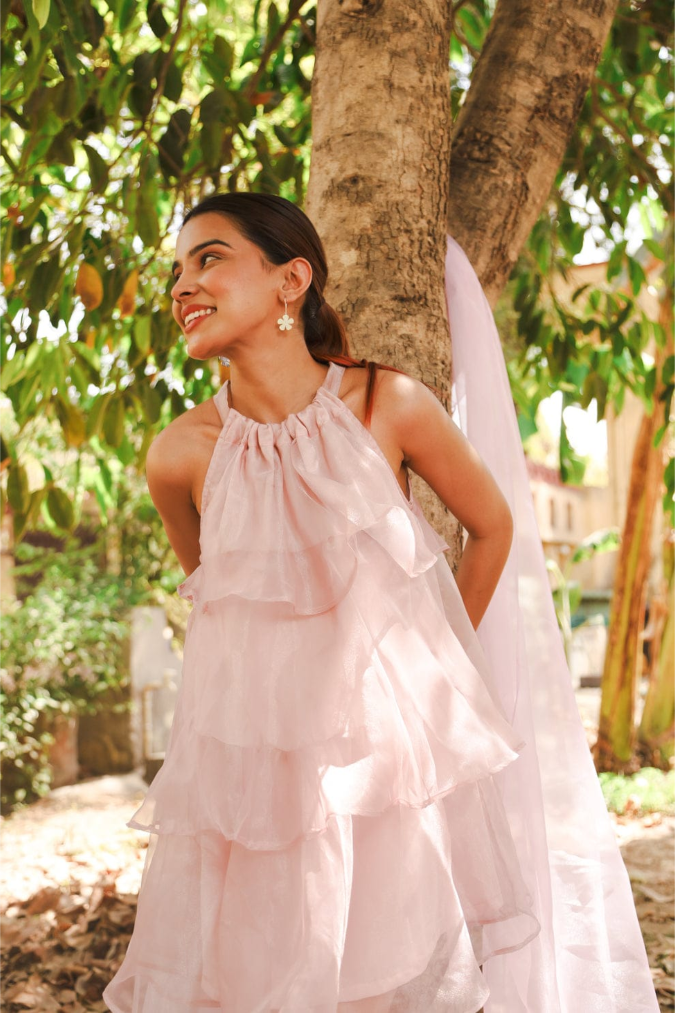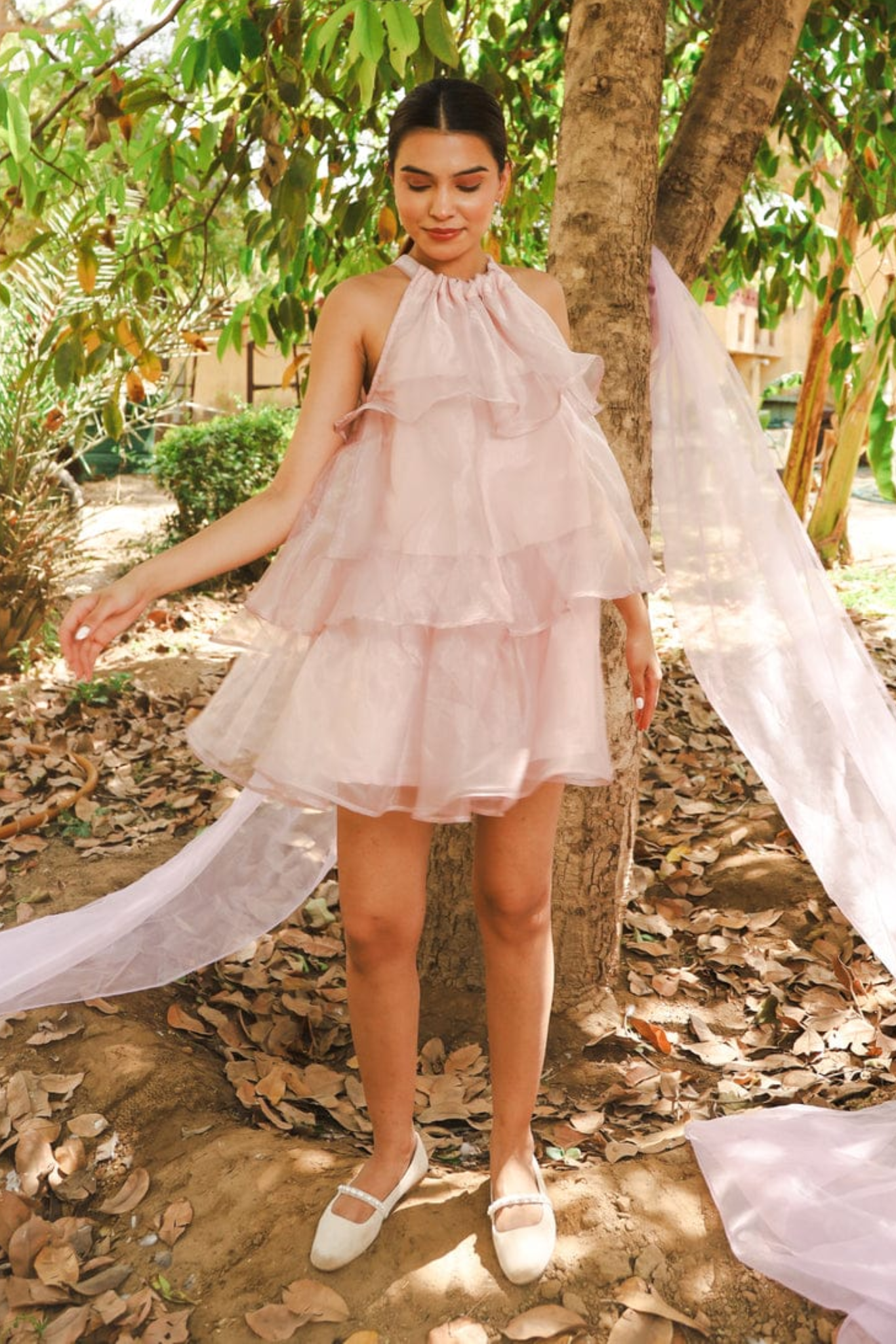 Flirty, feminine and summery. A dress made of our summer dreams. Organza tiered mini dress with tie back bow detail. In the most luscious summer tones.