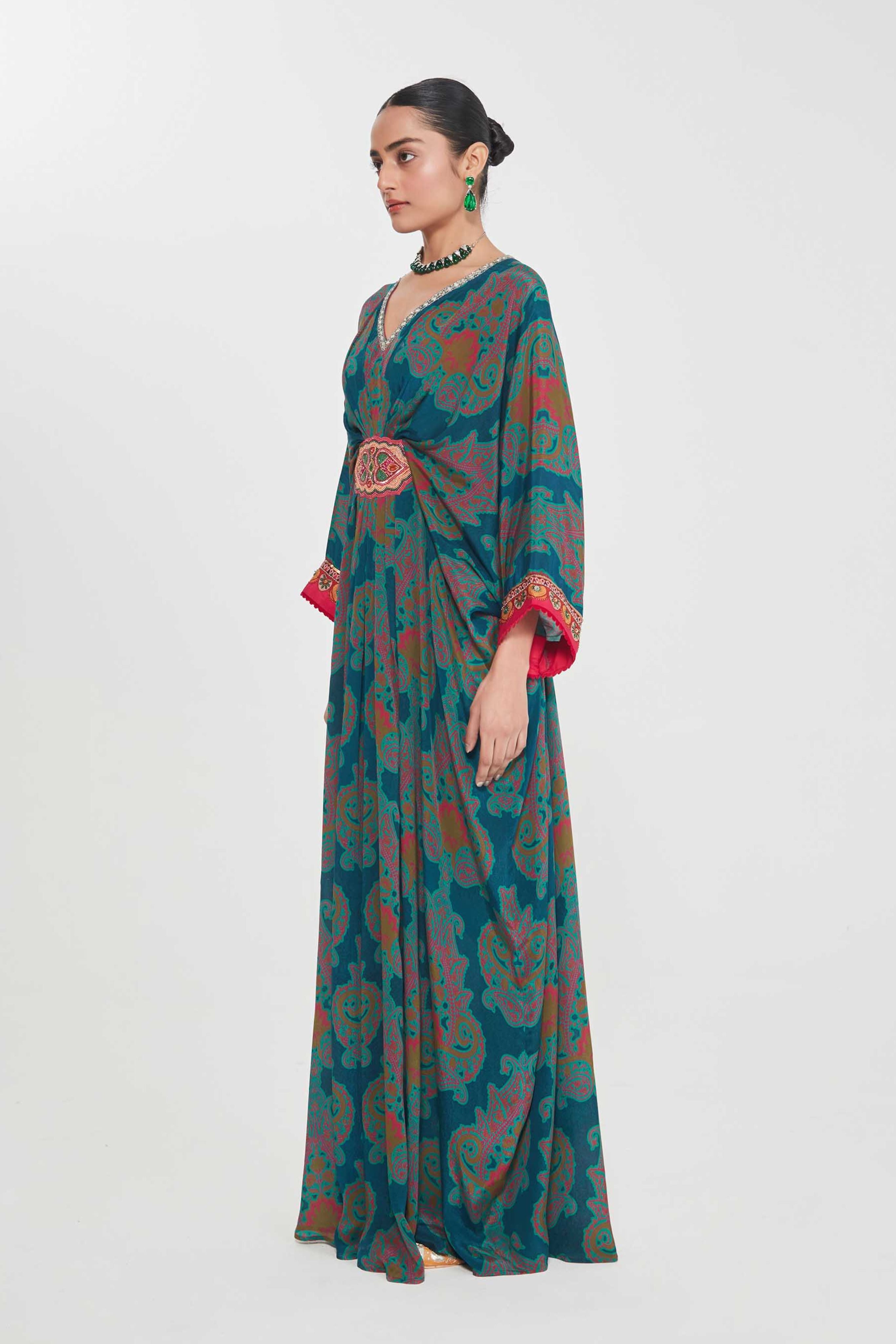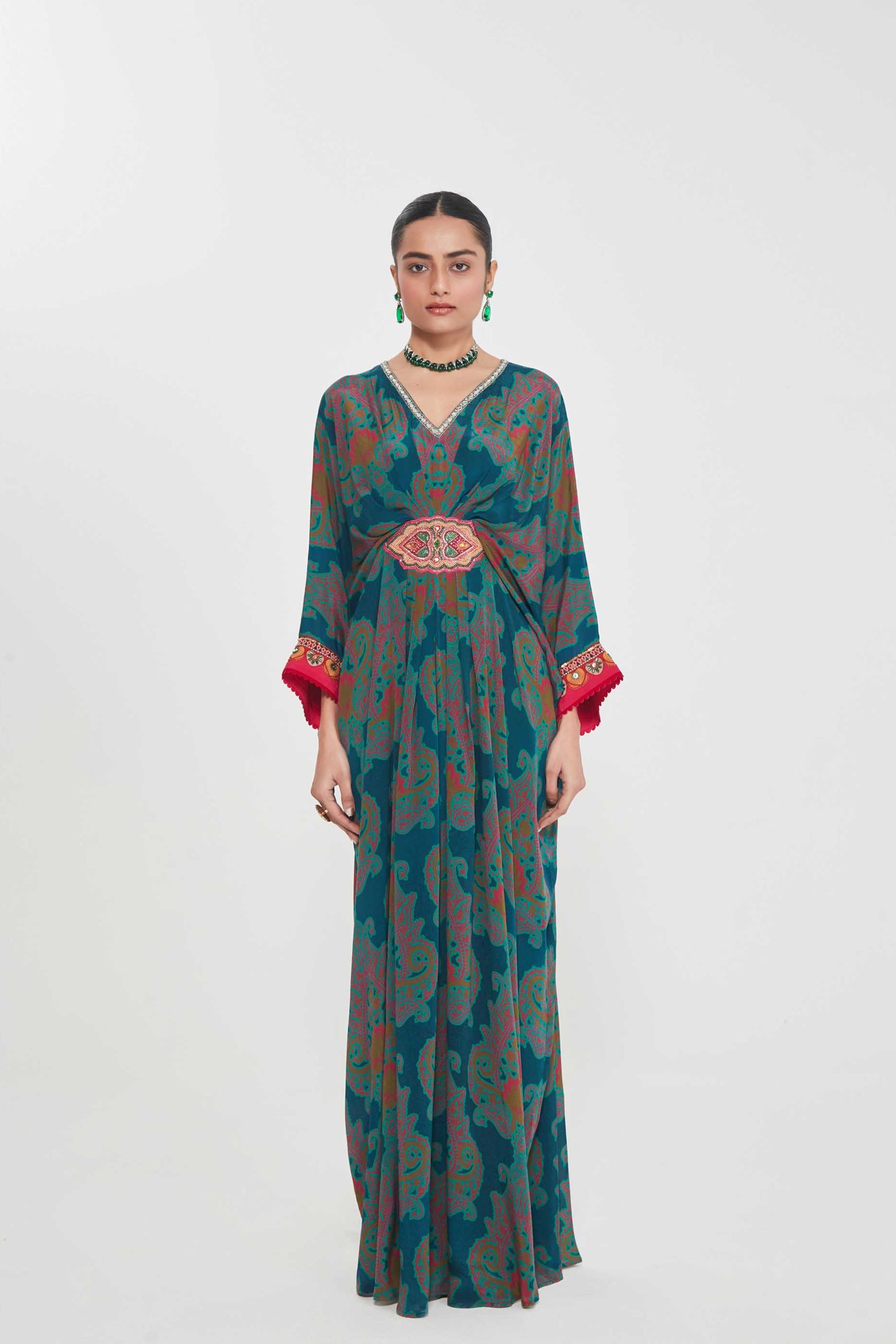 Description Midnight Blue Paisley Printed, Hand Embellished And Pleated Kaftan Featuring Trim, Tassels On Embroidered Belt Product Code