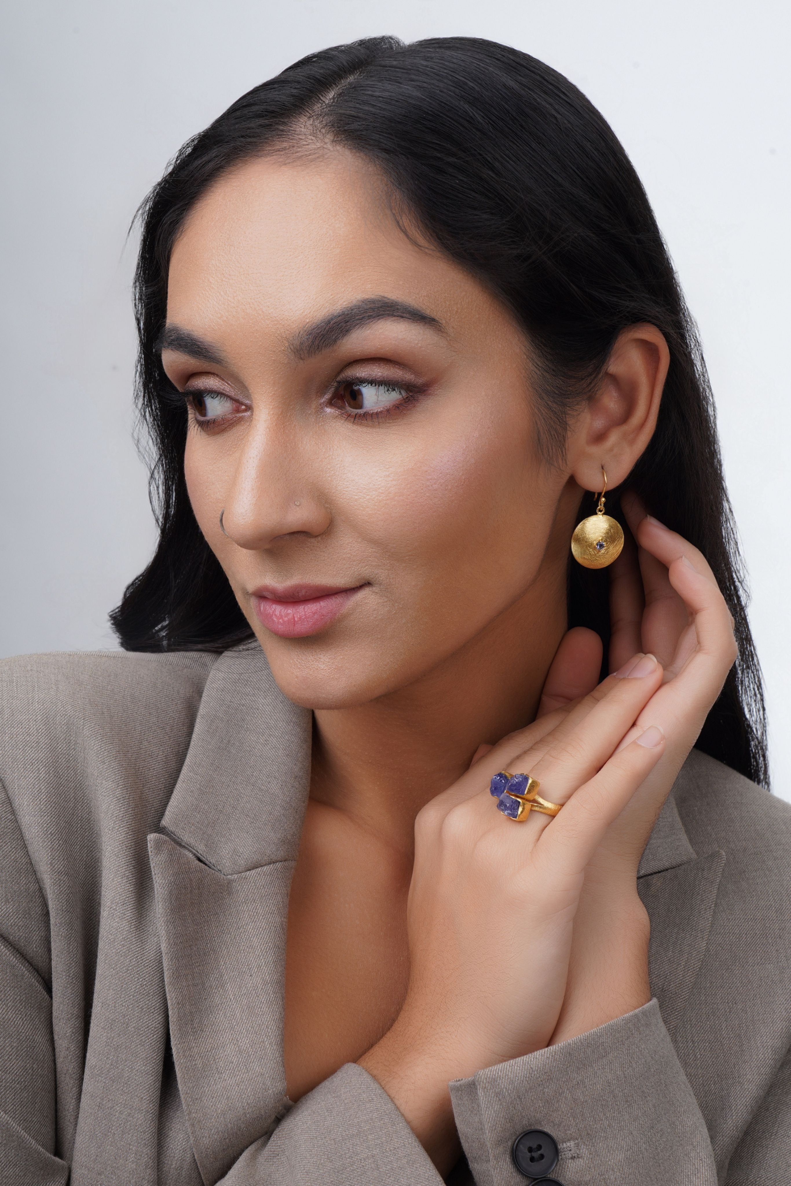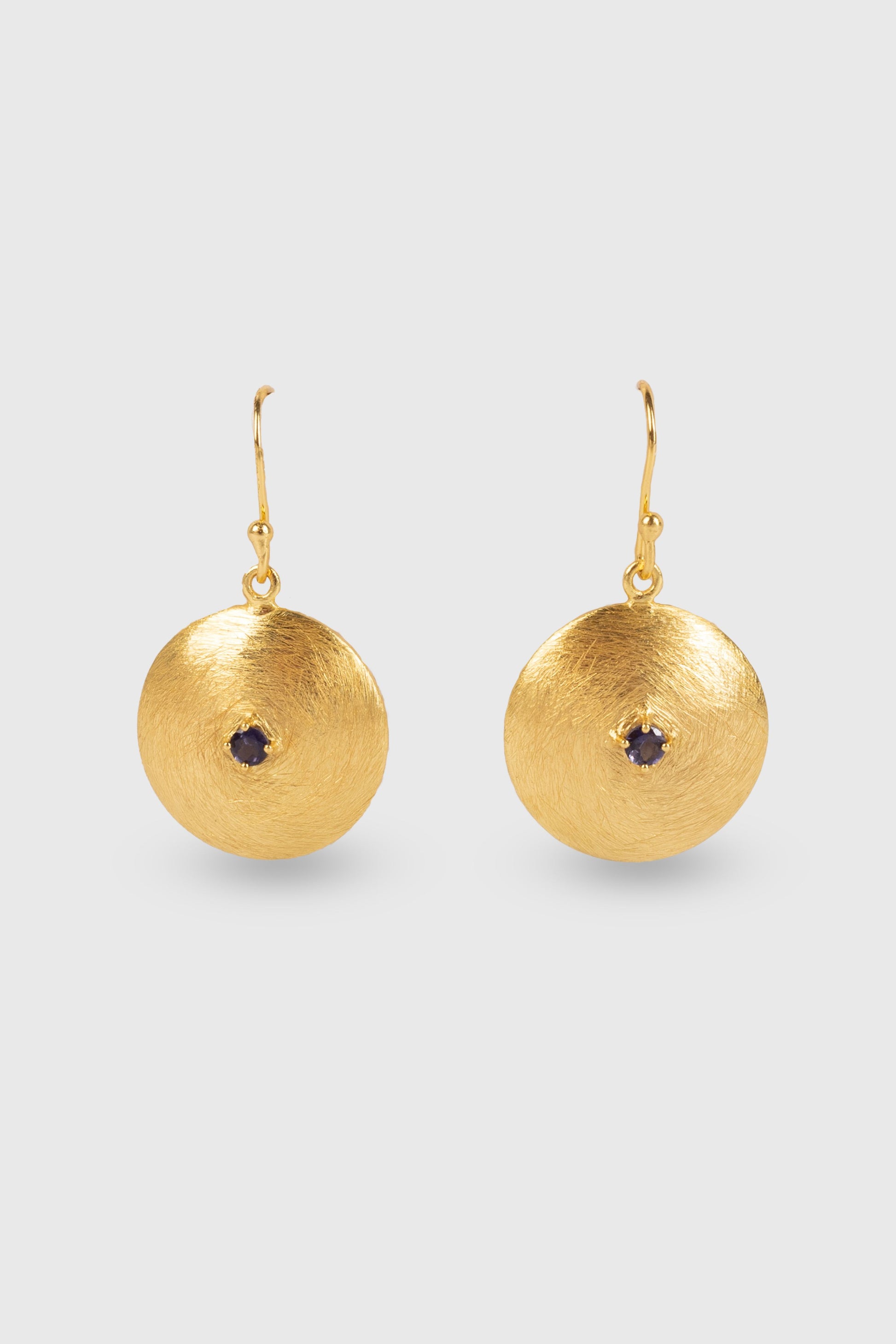 The Mesmer earrings are inspired by the crafts and architecture of the ancient Aegean World. The exquisite design features a Iolite set within a lavishly brushed gold sphere. These earrings will surely elevate your style