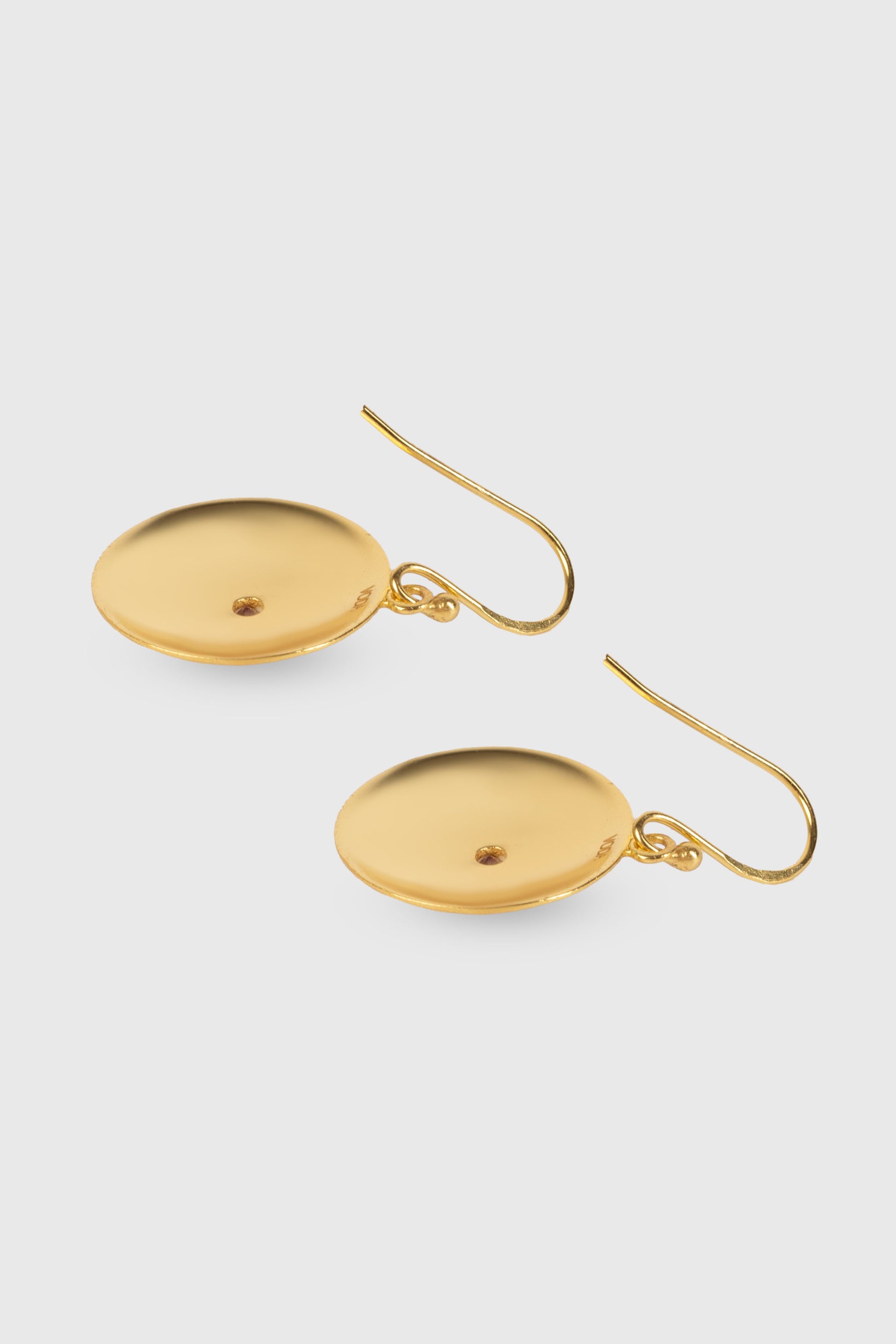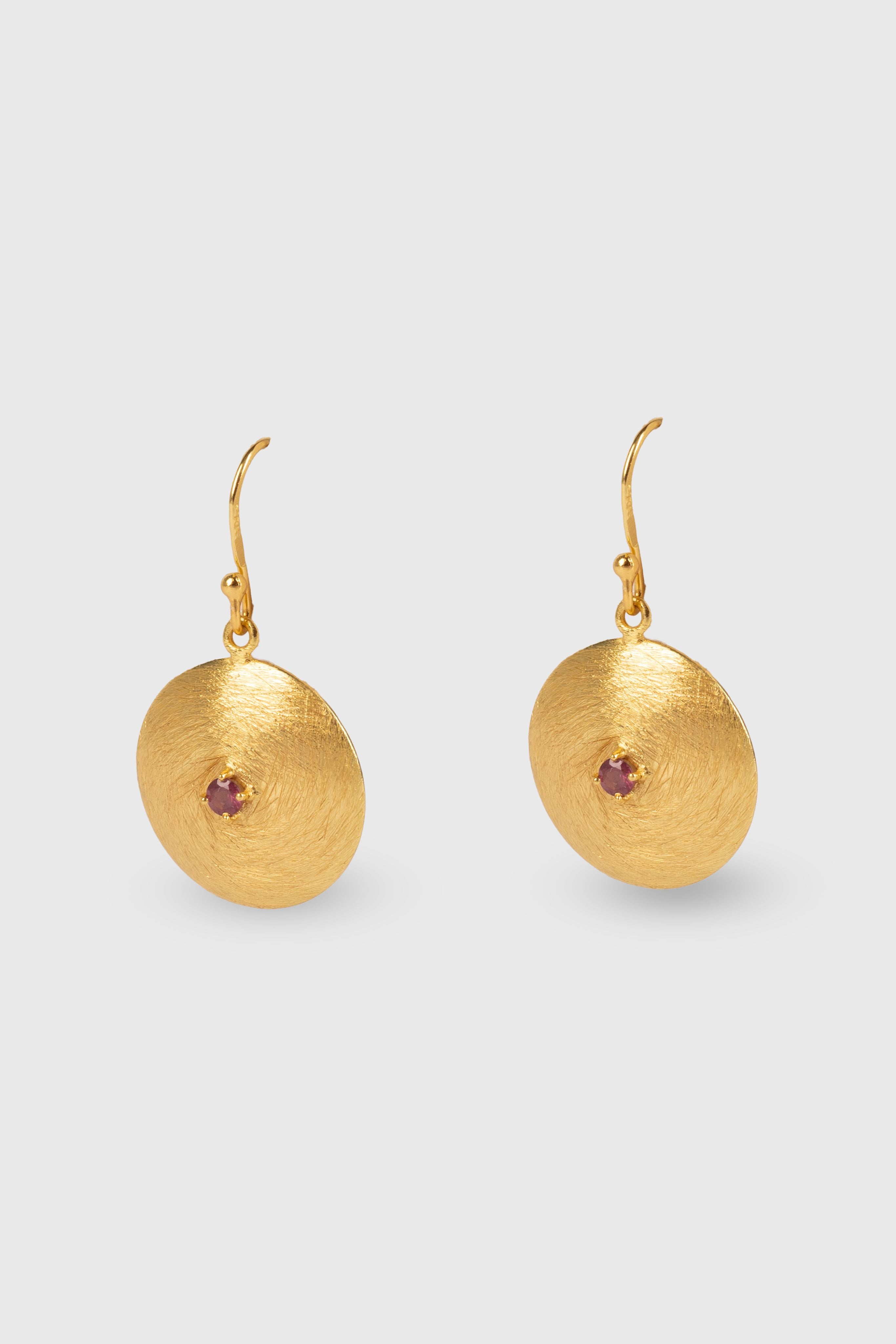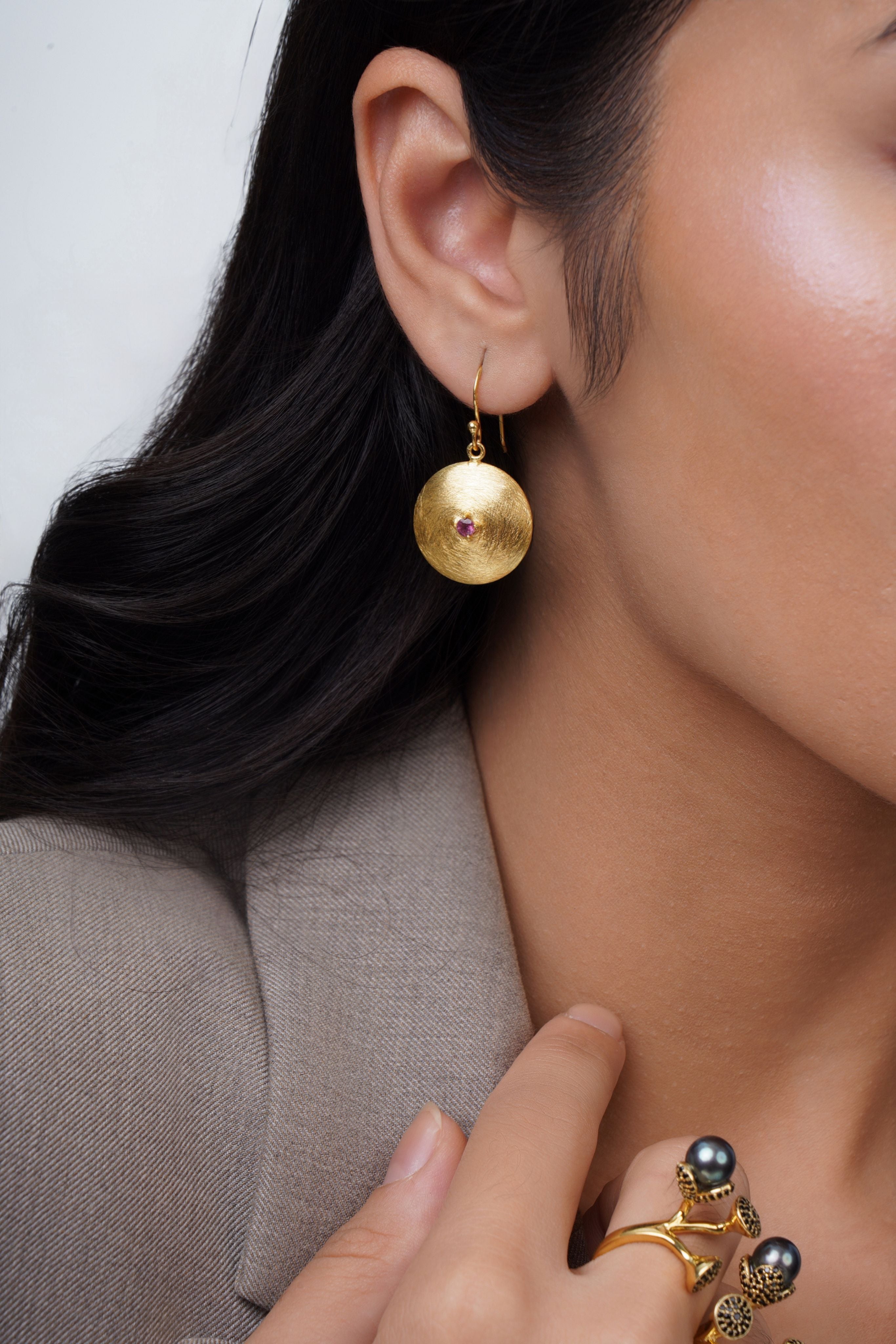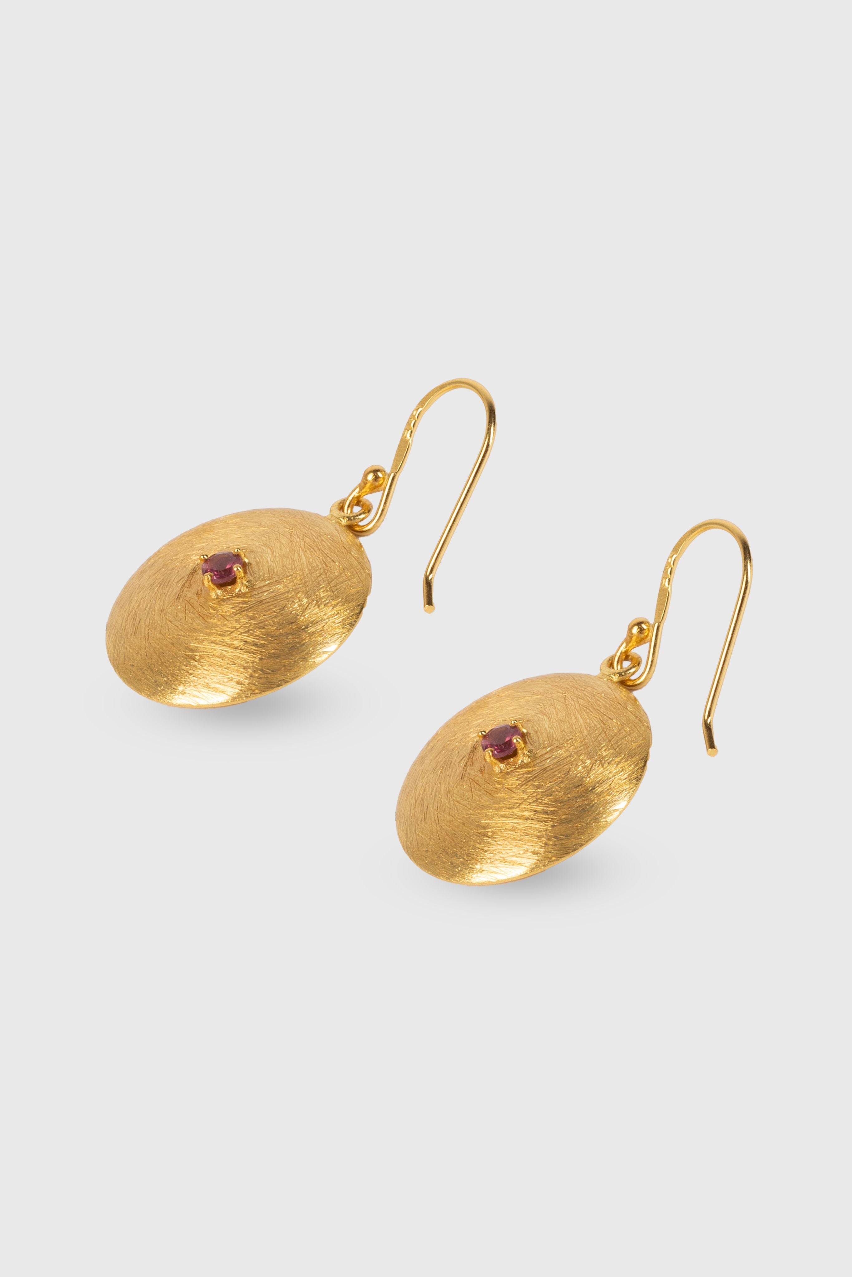 The Mesmer earrings are inspired by the crafts and architecture of the ancient Aegean World. The exquisite design features a Garnet set within a lavishly brushed gold sphere. These earrings will surely elevate your style.