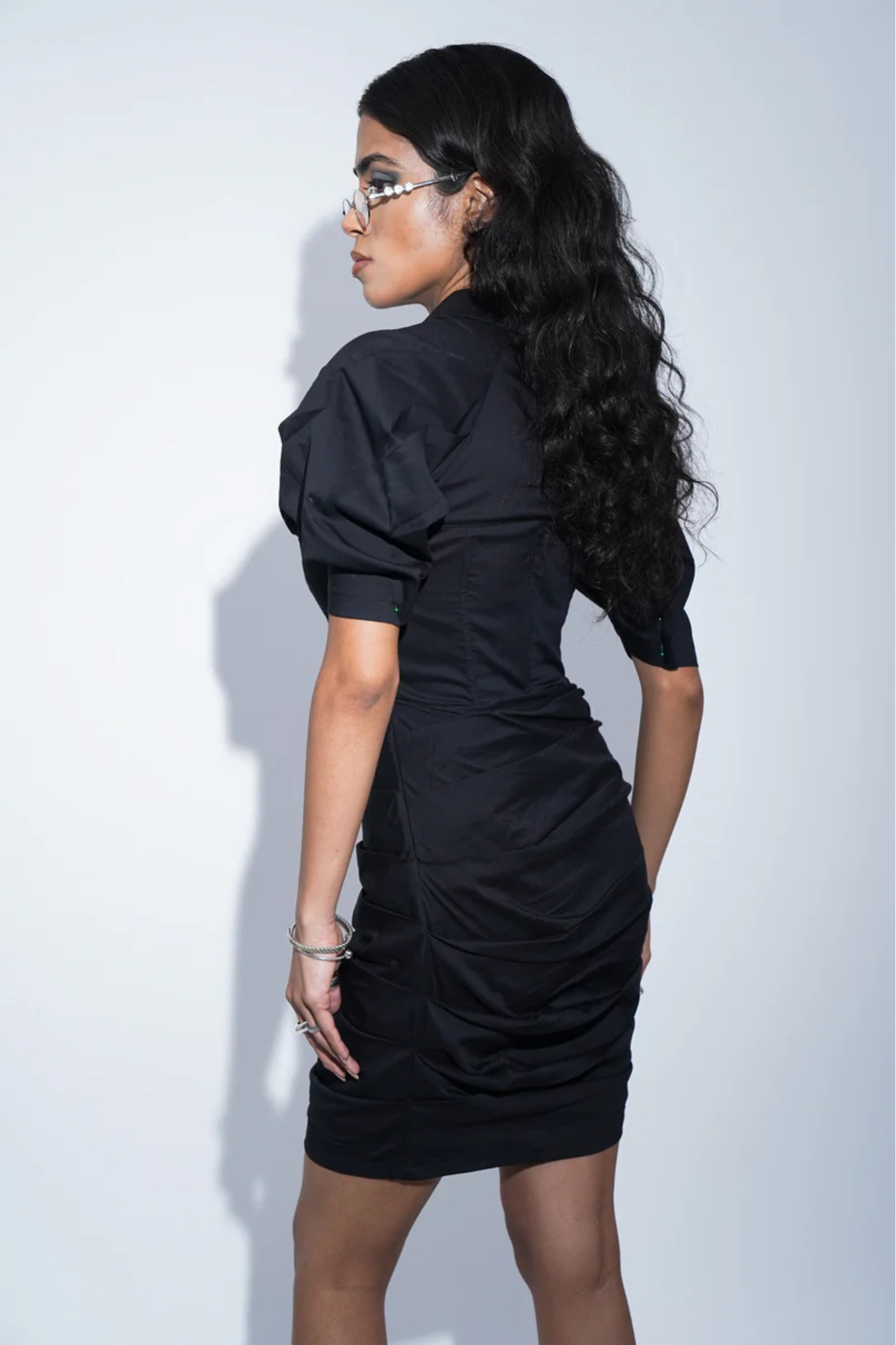 Crafted in a breathable cotton poplin lycra fabric, this mini dress features a v-neckline with classic collar. The bodice is panelled with boning to give structure and a snatched waist. It also features a pleated raglan sleeve and an asymmetric pleated skirt that drapes around the body like the flow of storm. It is fastened with a concealed zipper on the side.