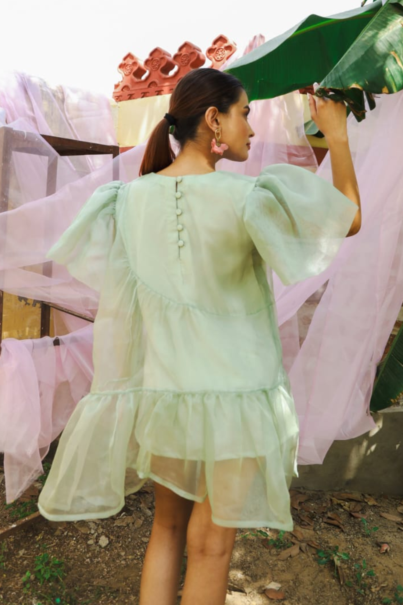 Mini panelled tier dress in silk organza with exaggerated butterfly sleeves. Handmade button closure detailing at the back. Summers never looked this delicious to us