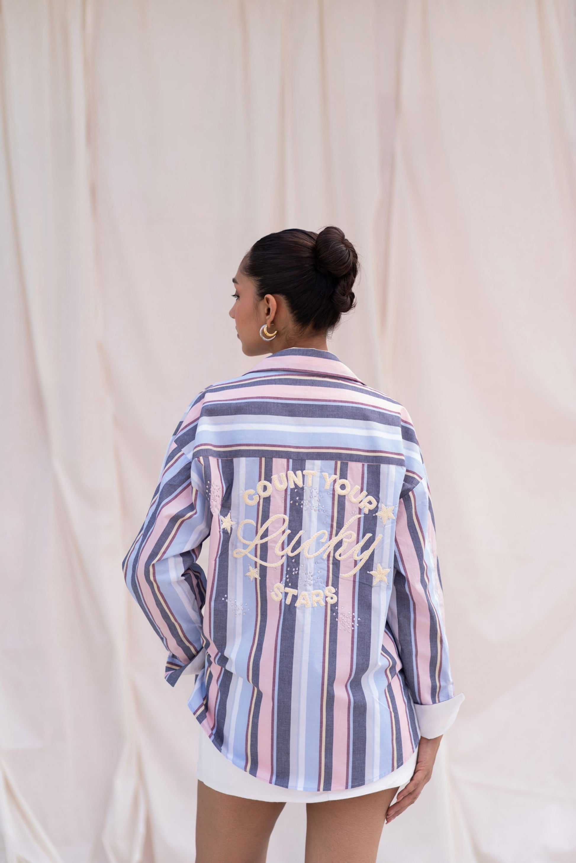 Brighten your wardrobe with this multicoloured striped shirt featuring delicate Count Your Lucky Stars embroidery on the back. Perfect for holiday styling, laid back escapes, or cool statement looks.