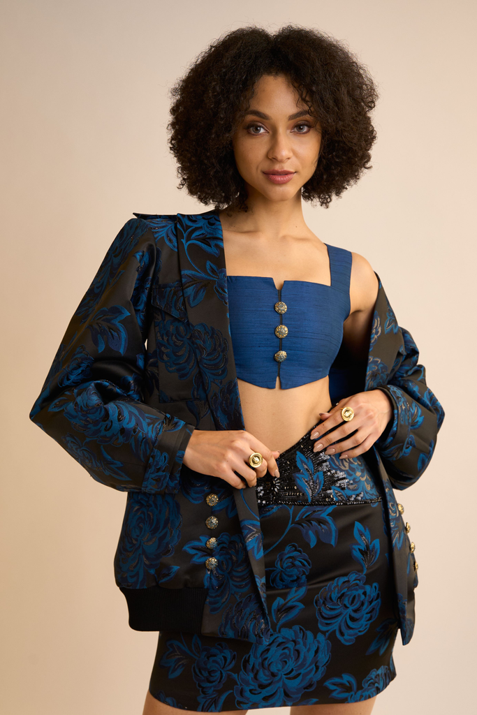A fashion forward outfit made by blending in the luxury of the elegant brocade & the edginess ofthe BOMBER JACKET elevating to give you a high end sophisticated look.