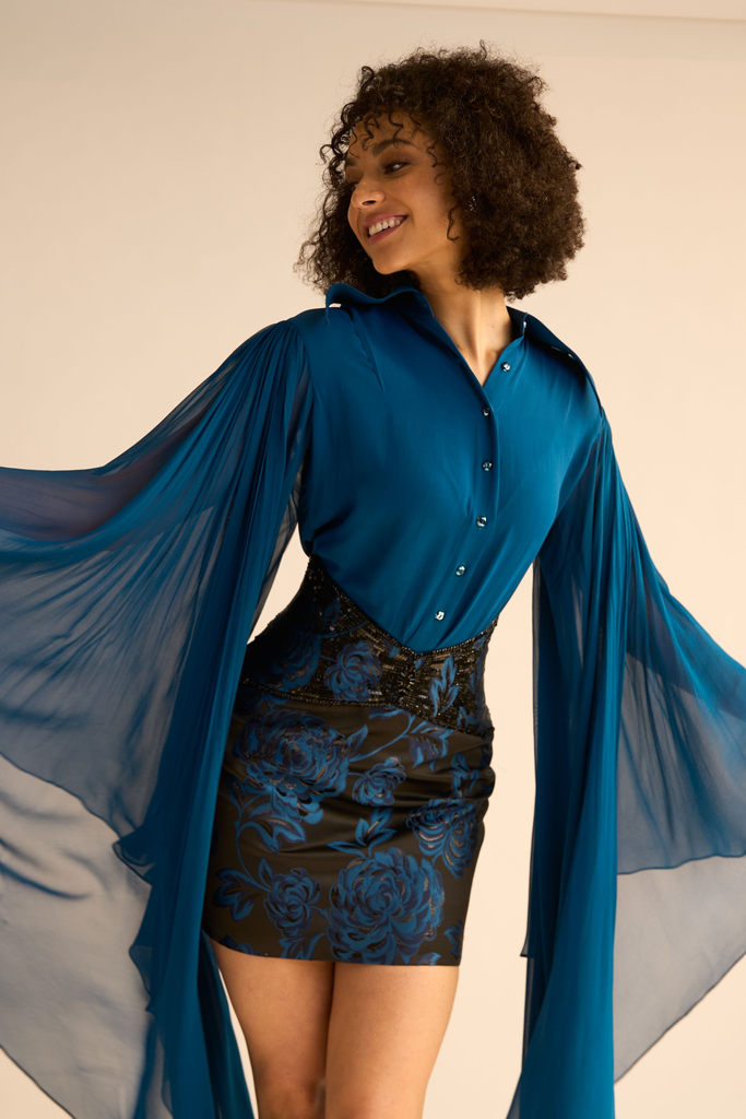 Top: Key Elements: The Chic knot, Bishop Sleeves, Swarovski red buttons.