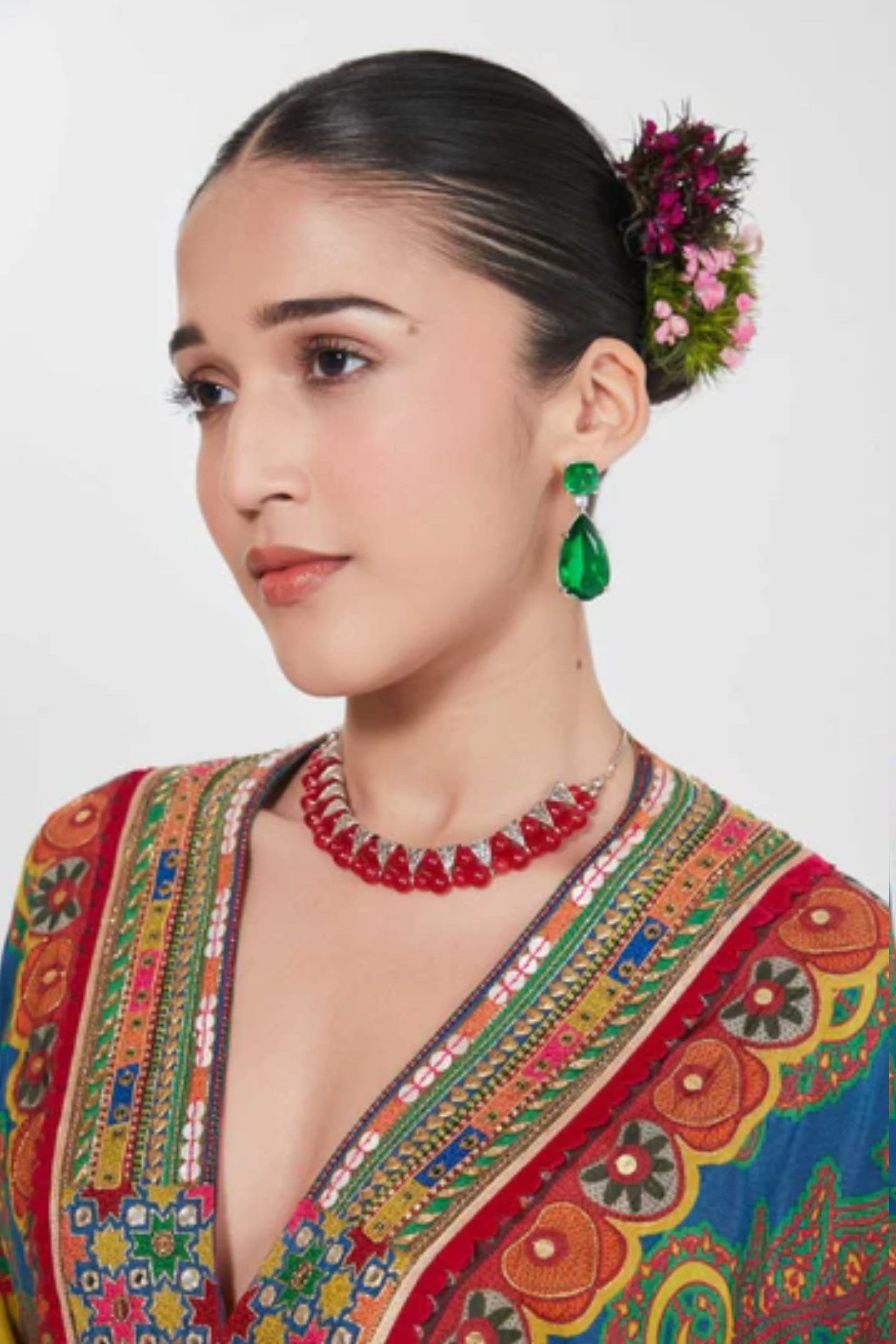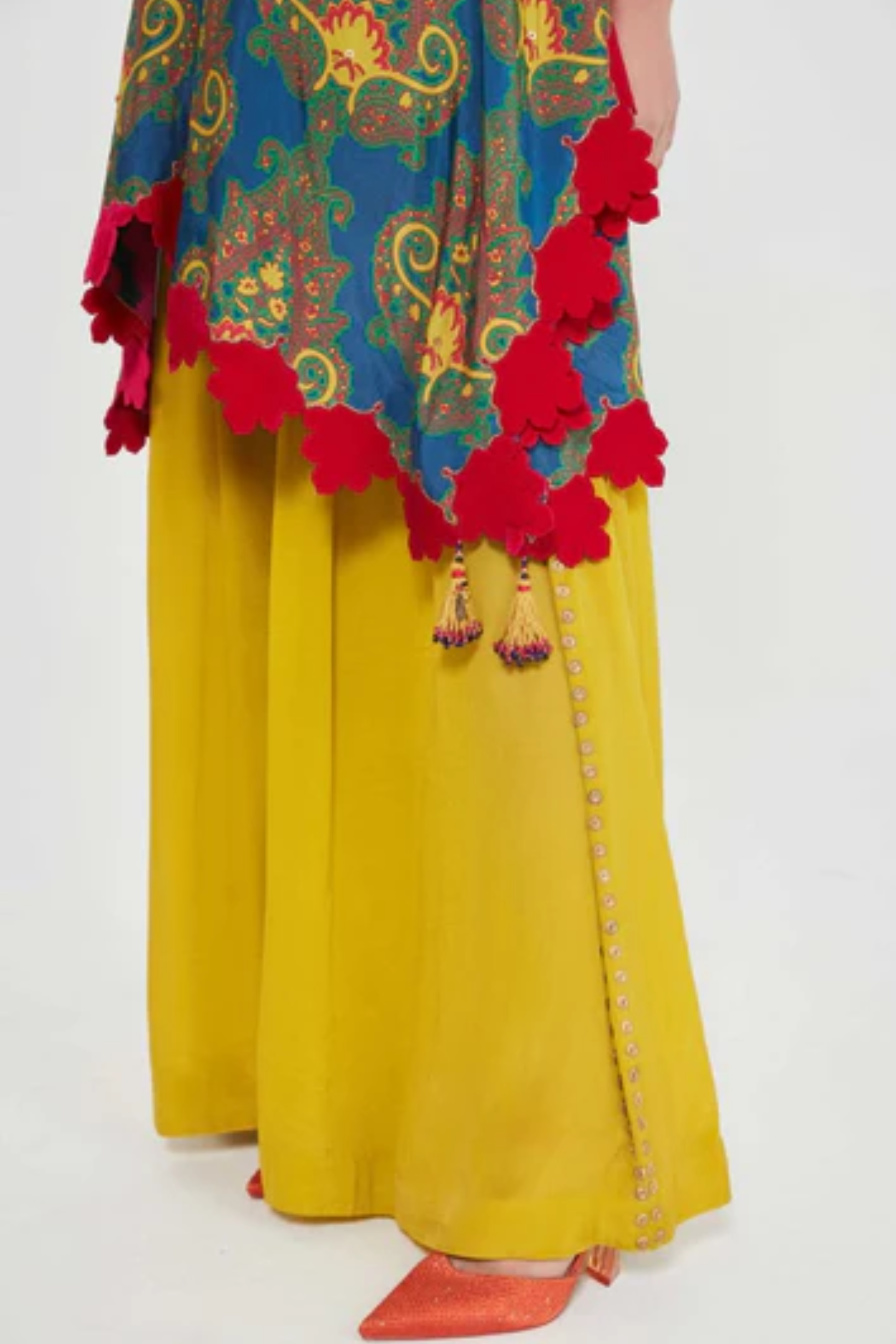 Paisley Print Prussian Blue Hand Embroidered, Mirror Work Kaftan Set, Signature Hamsa Hand Crafted Tassels, Velvet Cutout Trims Detailing At The Hamline, Paired With Yellow Pleated Pants With Metallic Details At Side. Product Code