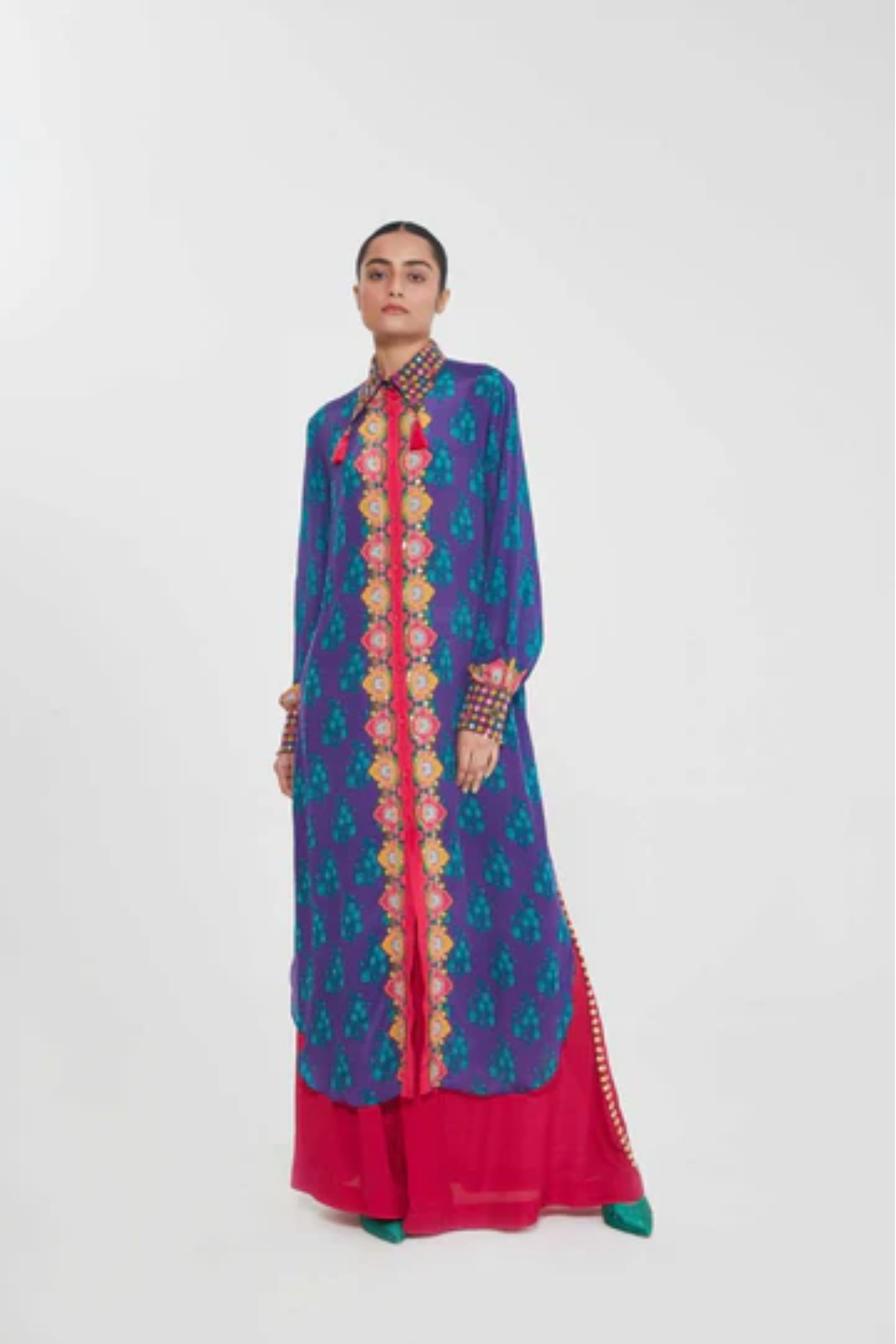 Tunic Set Description Midnight Blue Printed Tunic Set Featuring Intricate Hand Embroidered And Tassel Details Paired With Red Hand Embellished Pleated Pants. Product Code