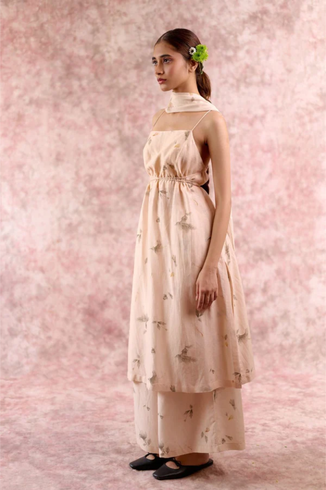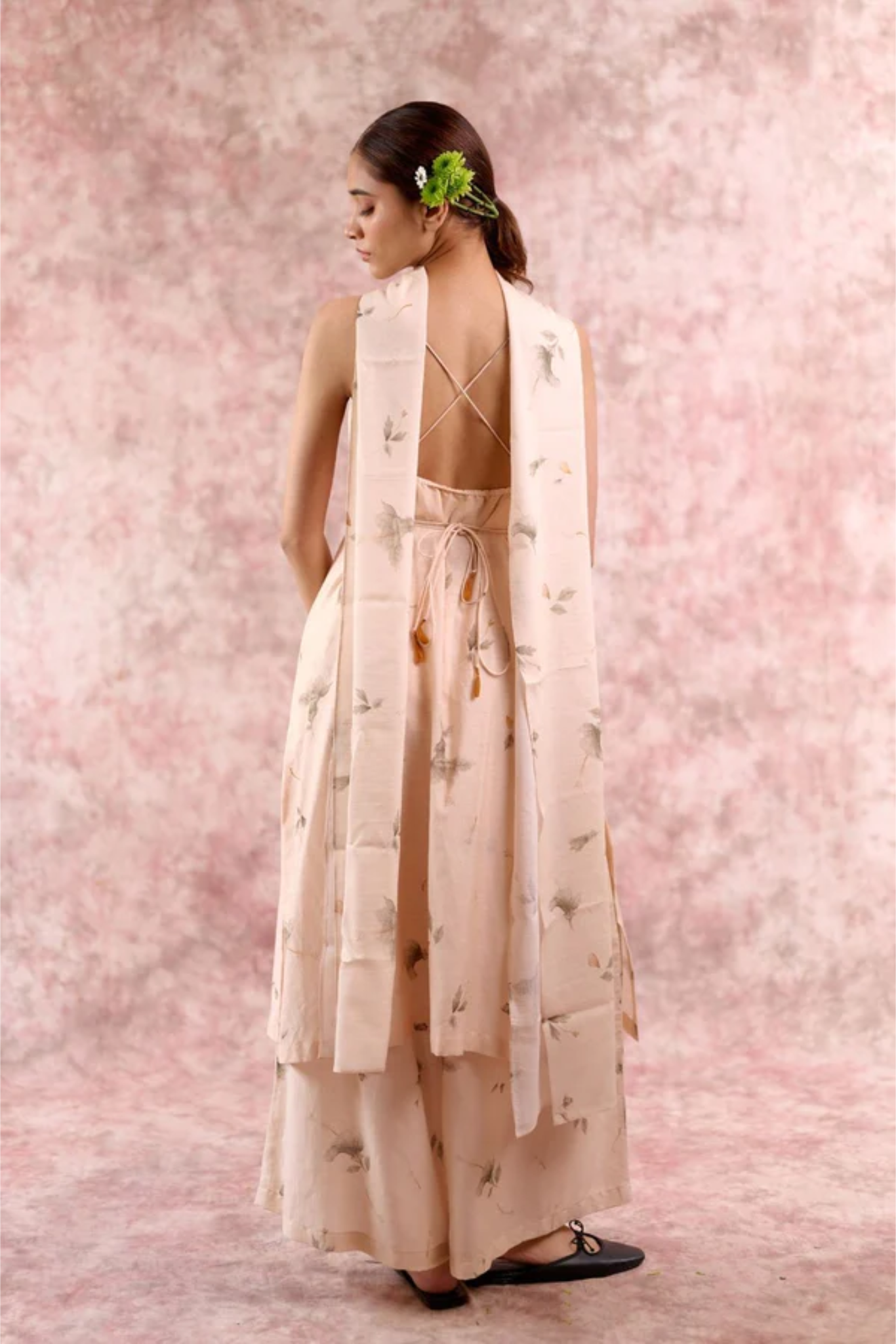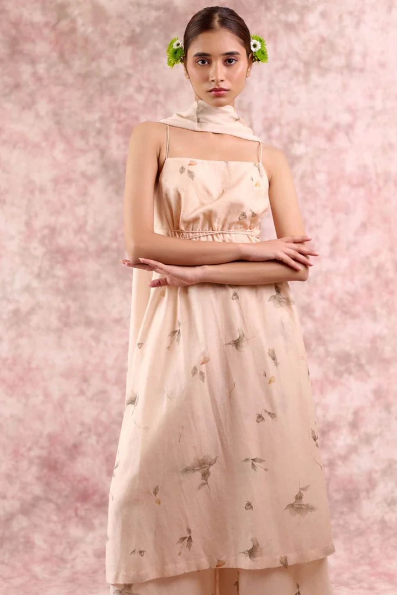 A statement festive piece in luxurious bemberg linen georgettr, designed to flow effortlessly with every movement. This tunic features delicate shoulder straps, a deep back with cross-string detailing, and an adjustable drawstring waist for a custom fit. The elegant side slit adds fluidity, while the rich beige colour with floral print enhances its timeless sophistication. Lightweight yet festive, this tunic transitions seamlessly from intimate gatherings to grand celebrations.