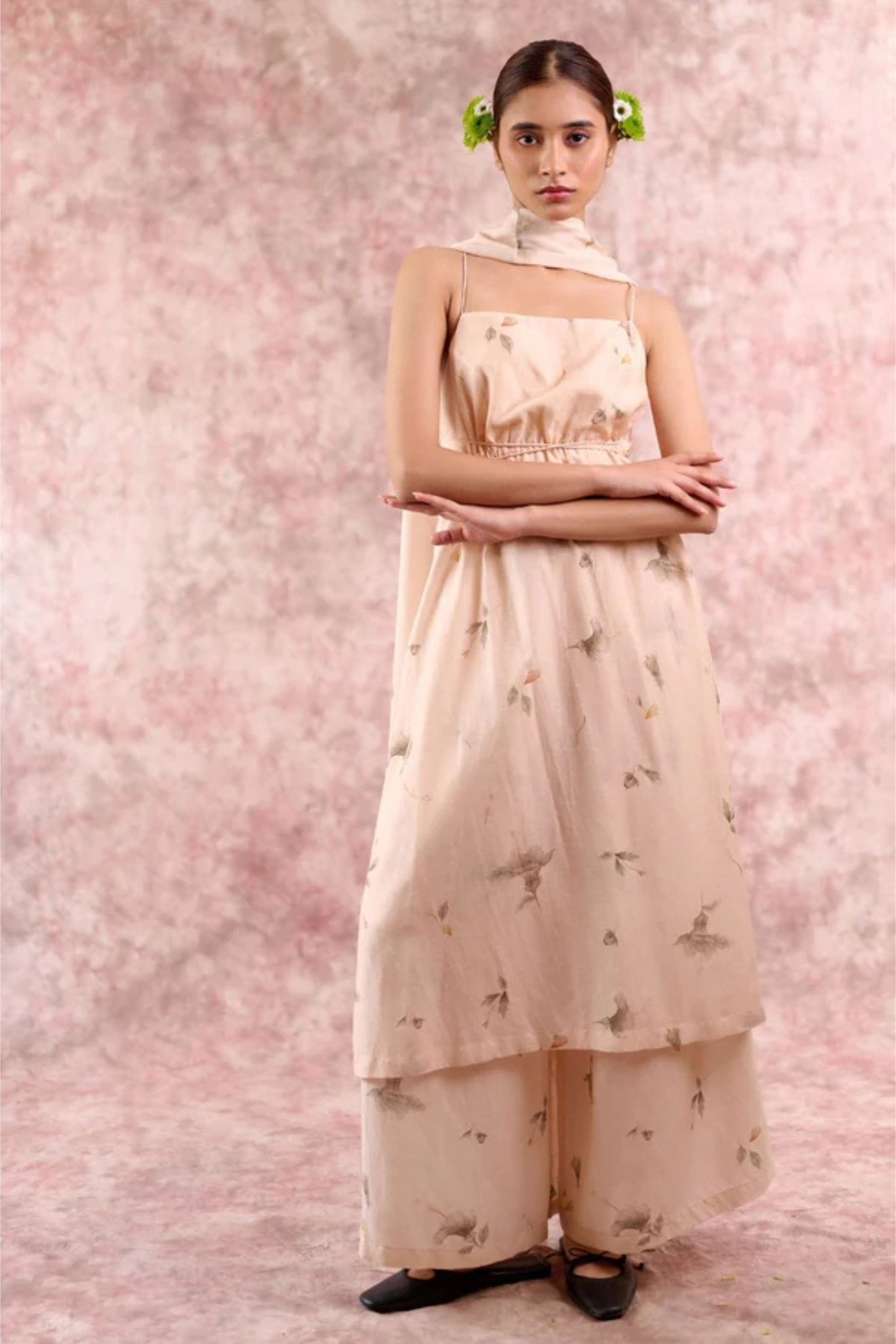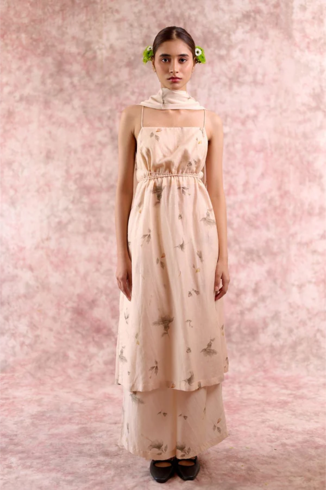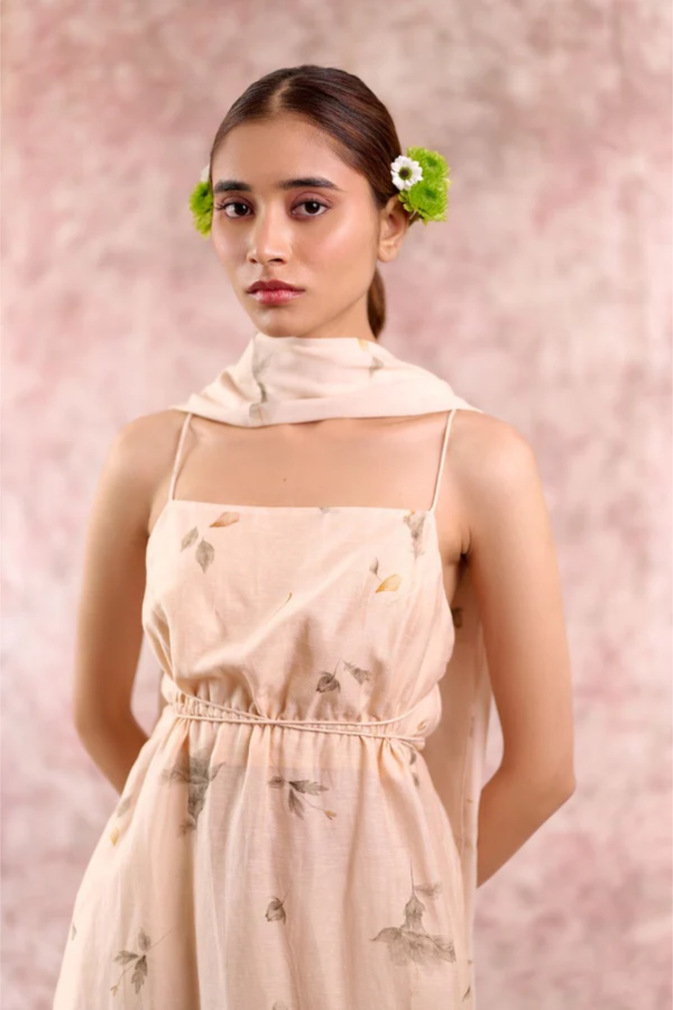 A statement festive piece in luxurious bemberg linen georgettr, designed to flow effortlessly with every movement. This tunic features delicate shoulder straps, a deep back with cross-string detailing, and an adjustable drawstring waist for a custom fit. The elegant side slit adds fluidity, while the rich beige colour with floral print enhances its timeless sophistication. Lightweight yet festive, this tunic transitions seamlessly from intimate gatherings to grand celebrations.