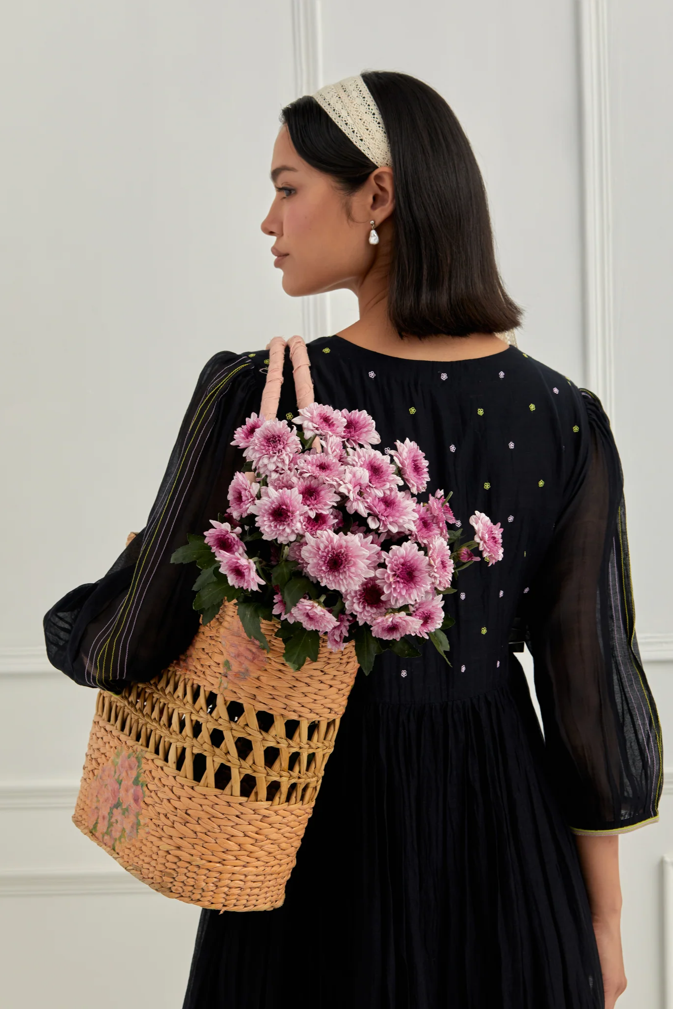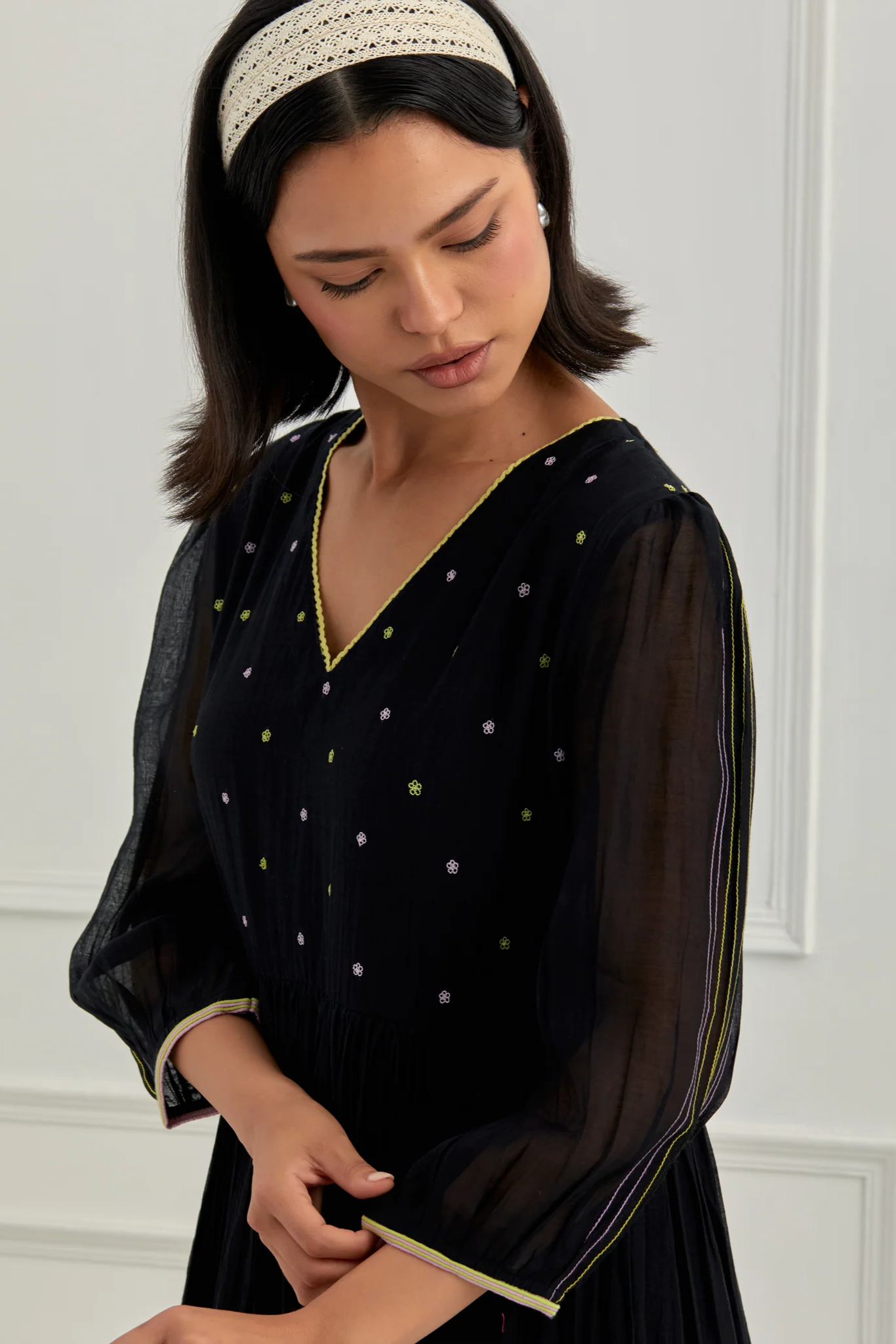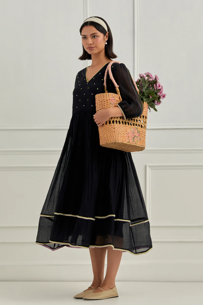 Crafted in deep midnight black, this elegant dress is embroidered with floral motifs across the body — delicate, yet defined. The sleeves are elevated with intricate thread detailing, offering texture and refinement that’s both modern and mindful.