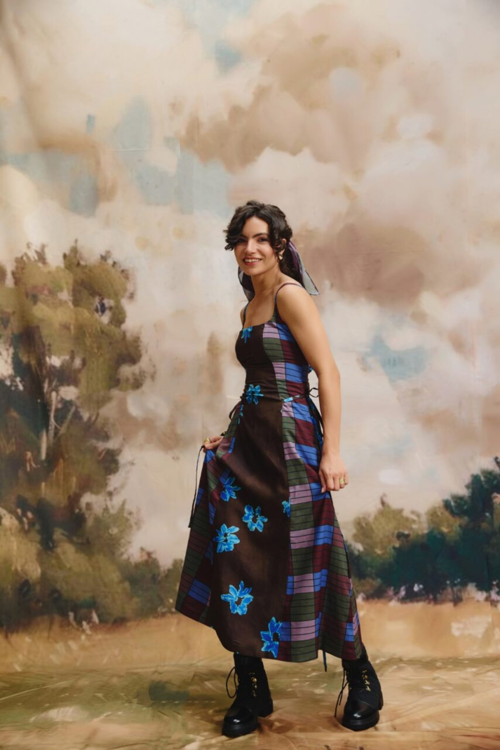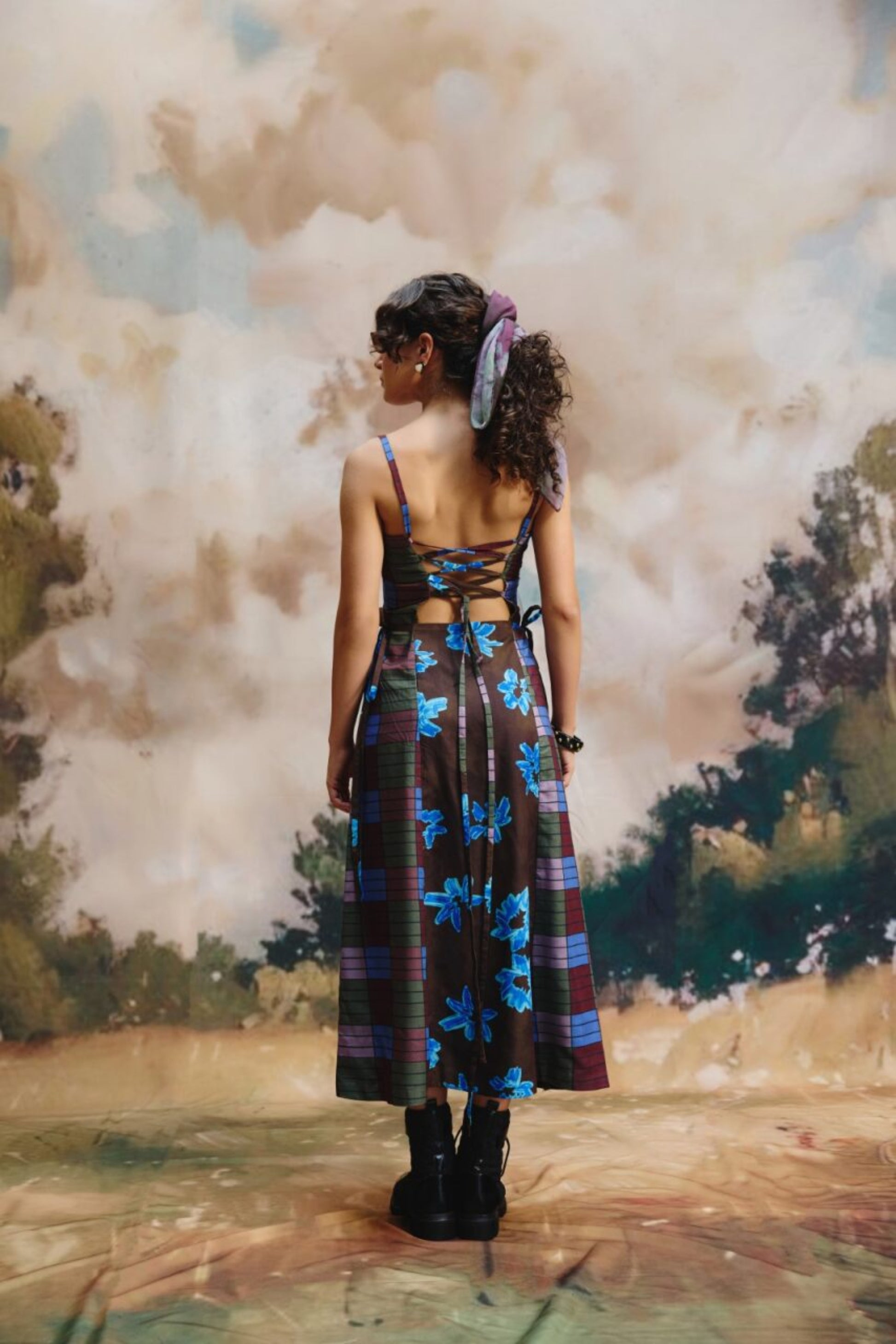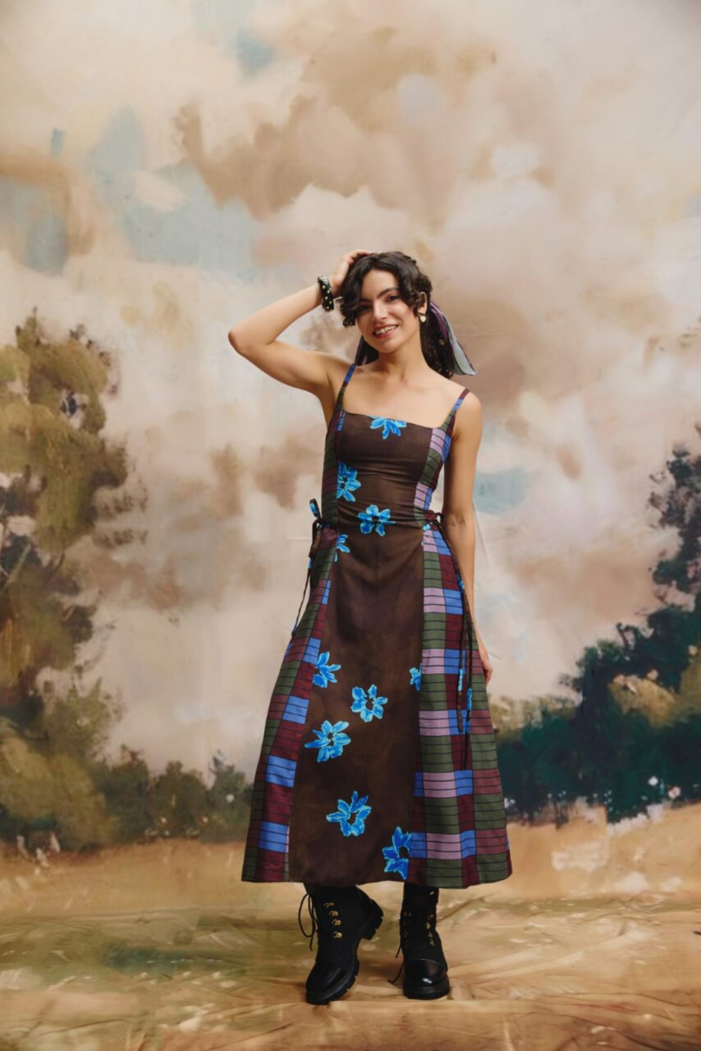 Product Description Crafted from a linen fabric, this sleeveless midi dress features thin straps and a flared skirt. The brown base with blue floral accents and plaid details on the sides adds a unique charm, perfect for casual outings or stylish gatherings.