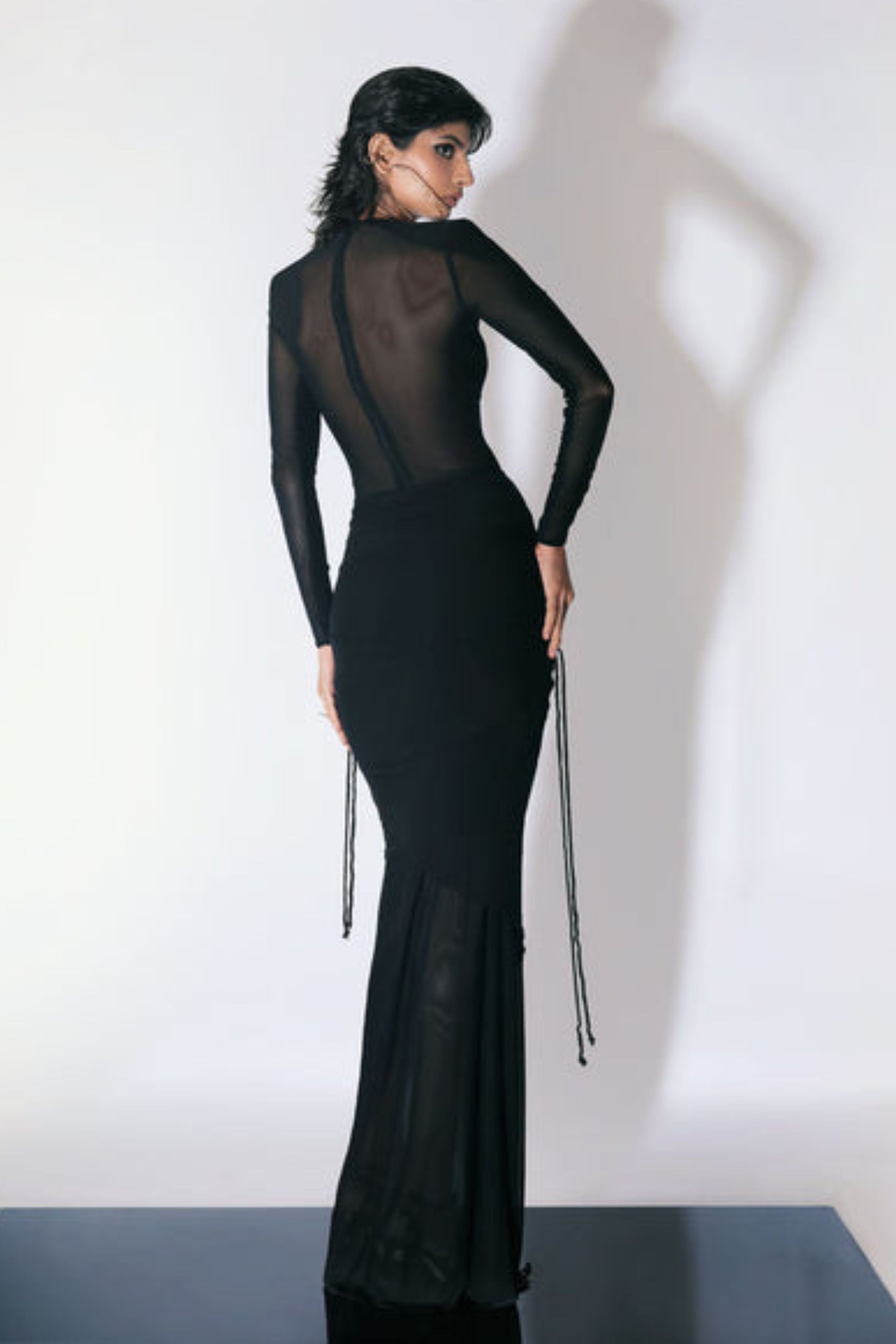 Stretchable mesh bodysuit with shoulder pads and breast patches