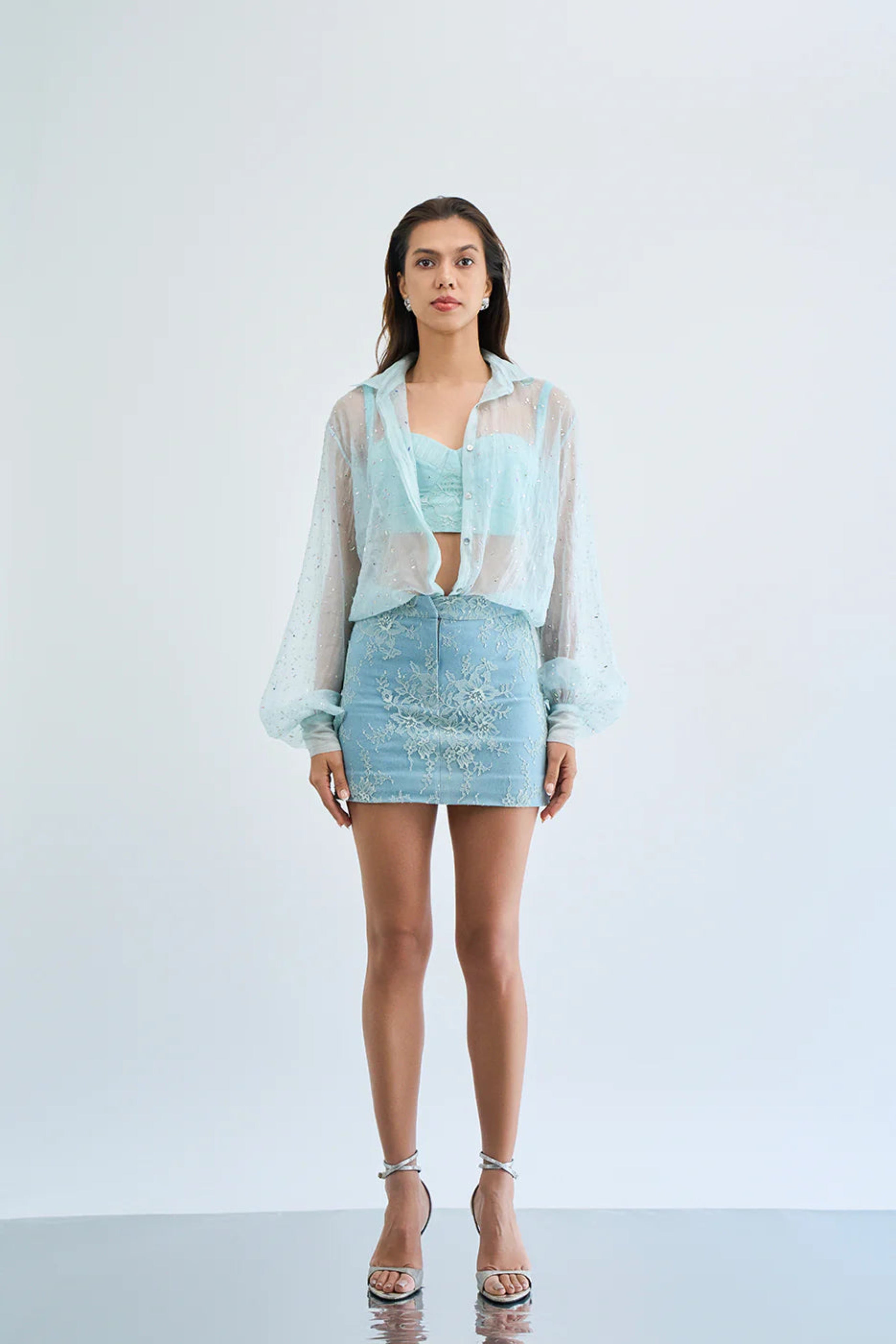 A dreamy sheer shirt that floats over your skin like sea foam. With soft balloon sleeves and a delicate dotted iridescent rhinestone texture, it layers effortlessly over a bustier or slip dress, adding depth, romance, and just a hint of mystery to any outfit.
