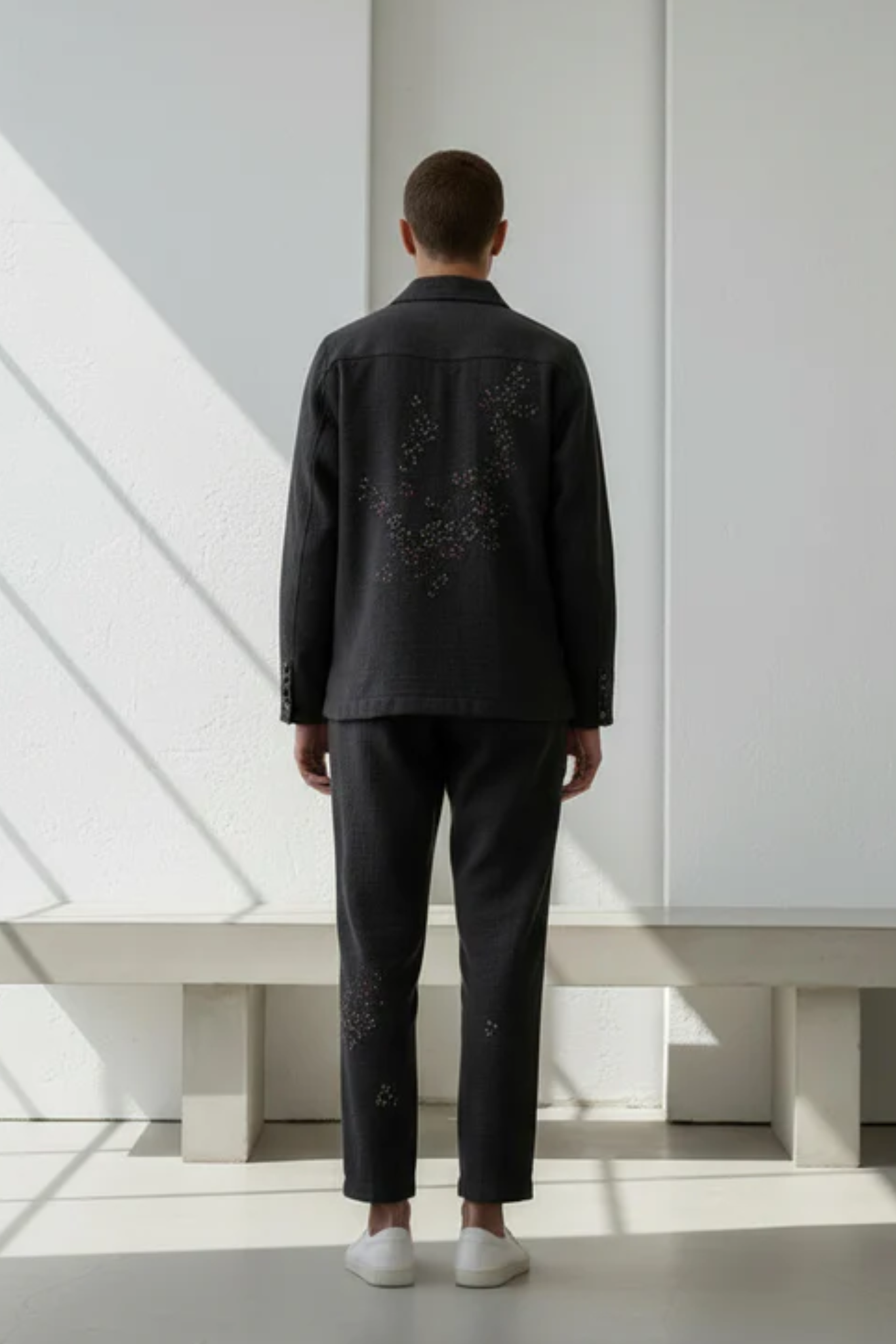 A versatile and timeless layer, this regular-fit jacket is crafted in gray Kala cotton and thoughtfully enhanced with hand embroidery for subtle, artisanal detailing. Designed with patch pockets, it combines functionality with refined style, making it perfect for casual outings or layering over wardrobe staples.