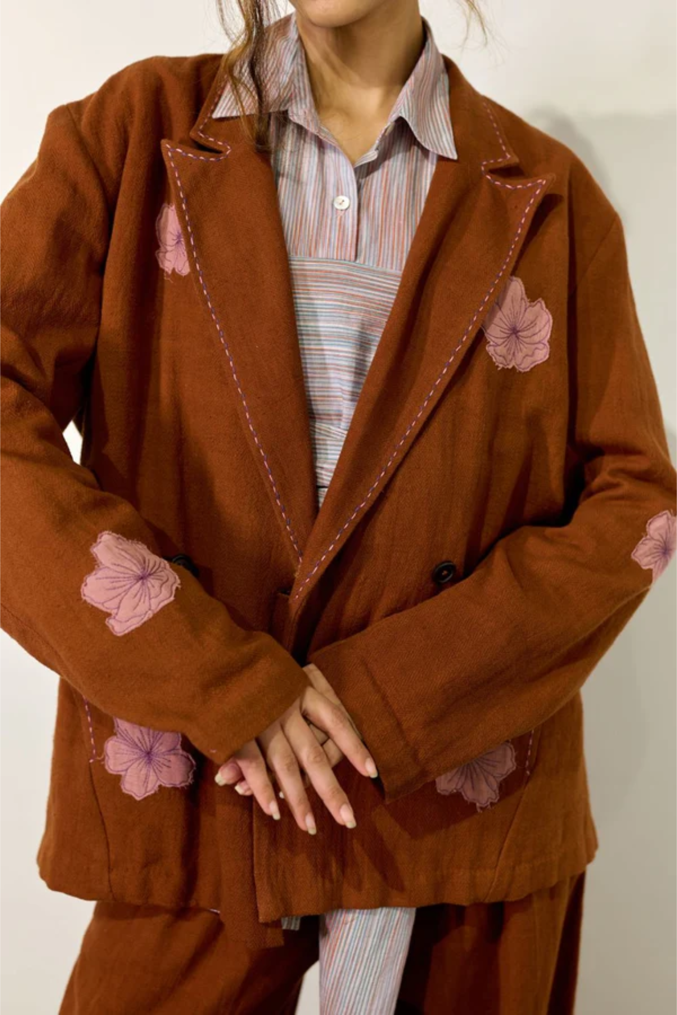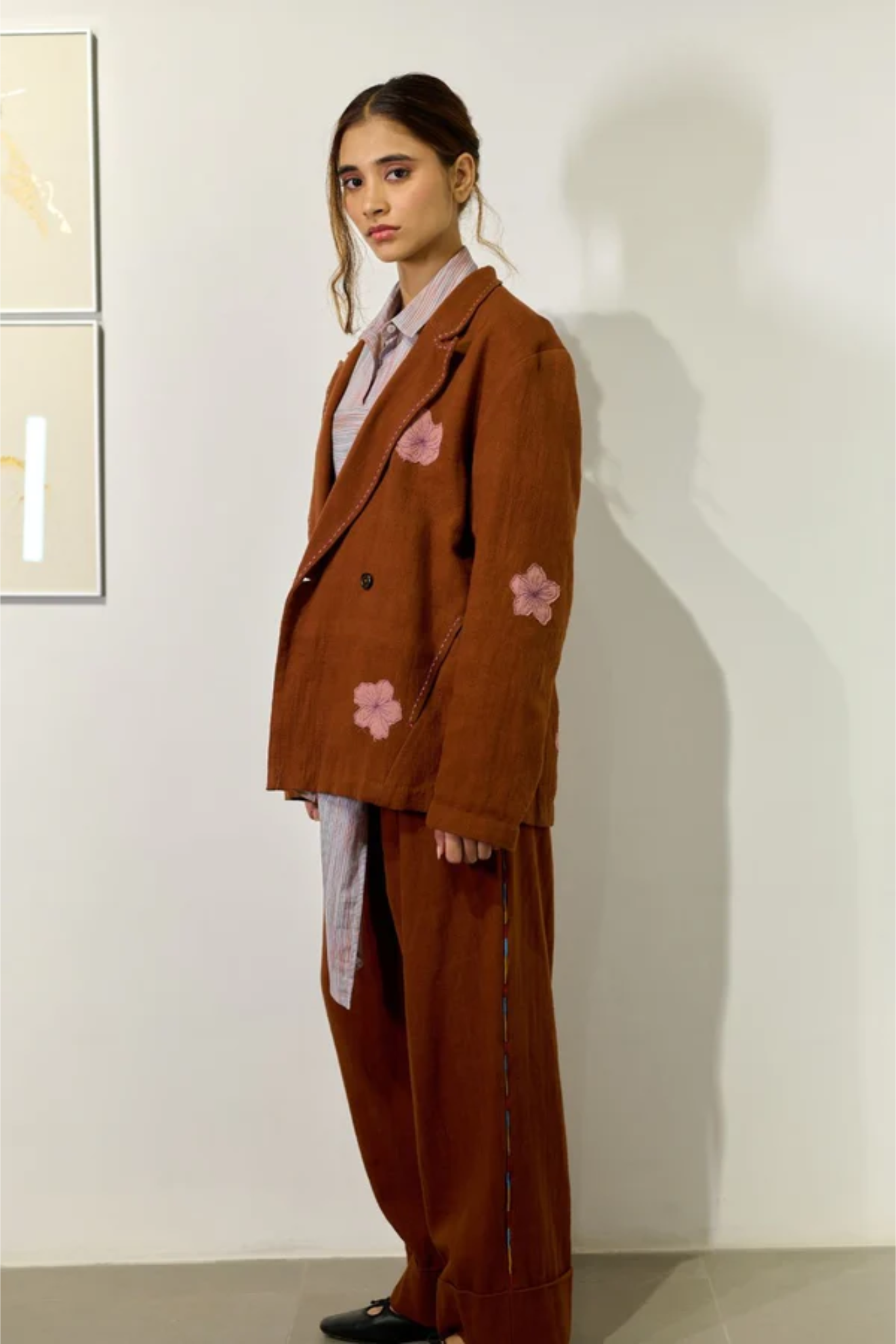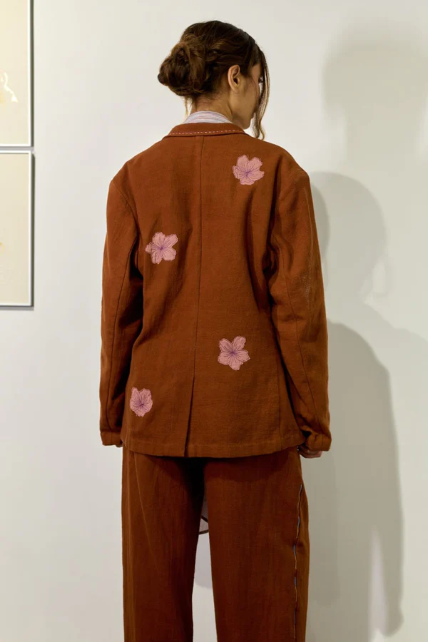 A thoughtfully designed co-ord set crafted in Kala cotton, naturally dyed in rich brown. The set features a relaxed embroidered jacket paired with regular-fit pants, blending comfort with understated sophistication. The jacket is detailed with appliqué floral embroidery and delicate threadwork along the collar, lapel, and pockets—adding an artisanal charm to its easy silhouette. The pants complement the look with subtle embroidery accents and a cuffed hem, offering effortless versatility for both casual outings and refined everyday wear.