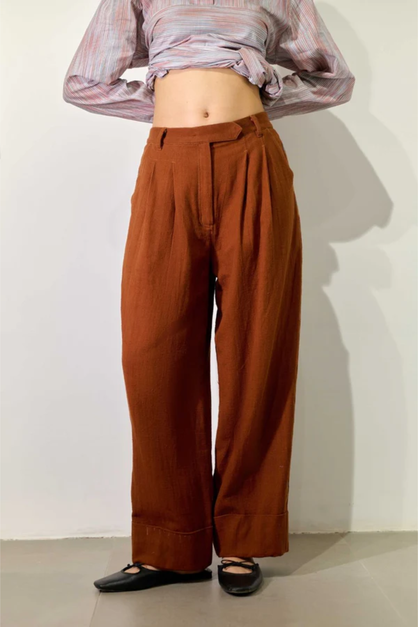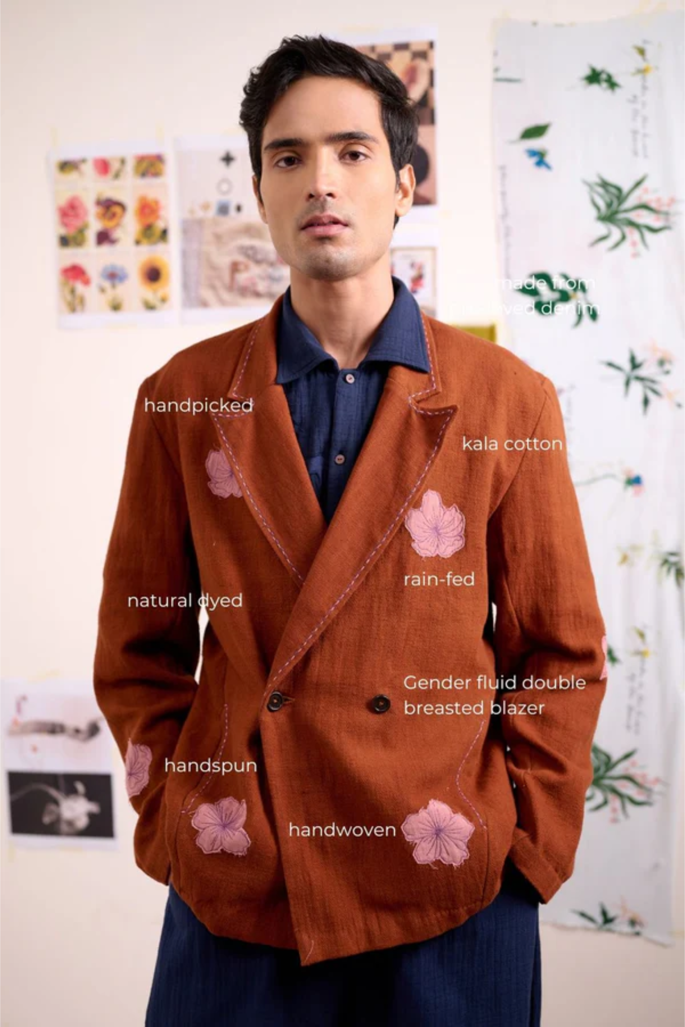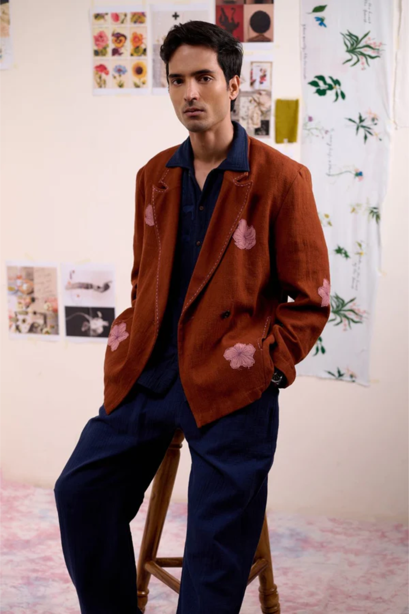 A thoughtfully designed co-ord set crafted in Kala cotton, naturally dyed in rich brown. The set features a relaxed embroidered jacket paired with regular-fit pants, blending comfort with understated sophistication. The jacket is detailed with appliqué floral embroidery and delicate threadwork along the collar, lapel, and pockets—adding an artisanal charm to its easy silhouette. The pants complement the look with subtle embroidery accents and a cuffed hem, offering effortless versatility for both casual outings and refined everyday wear.