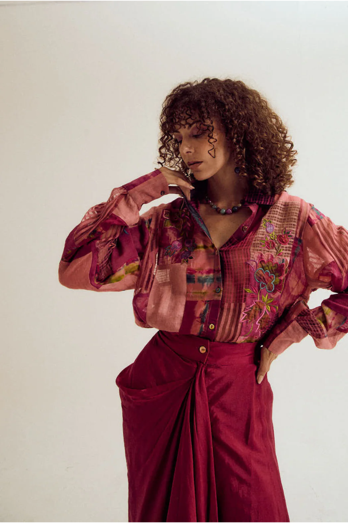 An elegant co-ord set featuring a front-open patchwork shirt in jute, linen, and habutai silk, adorned with floral patchwork embroidery. Paired with the Vinca skirt - an ombré-shaded uneven silhouette with a front belt, zipper closure, back elastic, and soft lining for comfort and fluid movement.