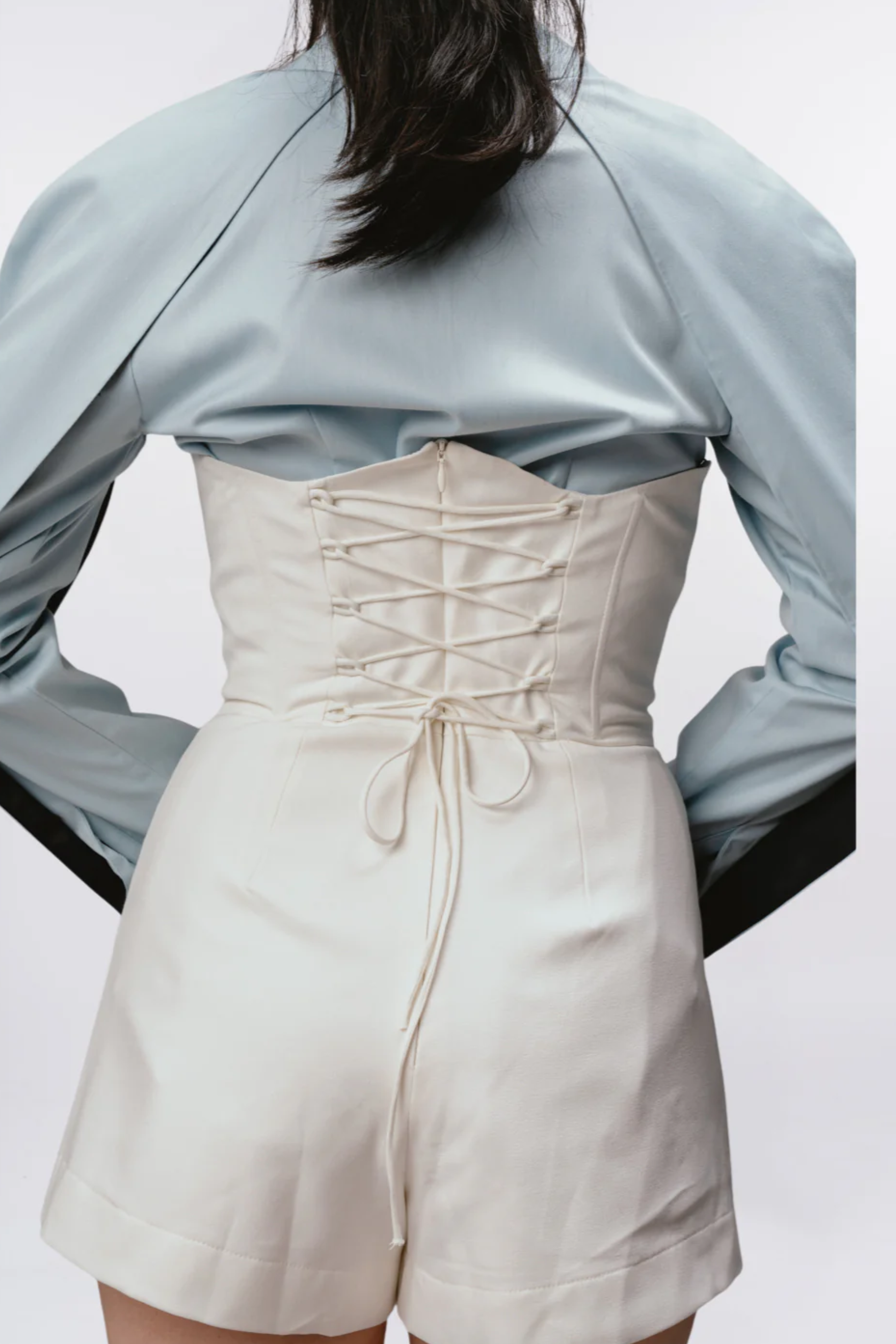 Shirt crafted in a soft powder blue fabric with a subtle sheen. Featuring exaggerated draped sleeves and a sharp collar, it brings a unique twist to a classic silhouette. The concealed front placket offers a clean, seamless finish, making it a versatile addition to both casual and elevated wardrobes. Product Code PTMUS095