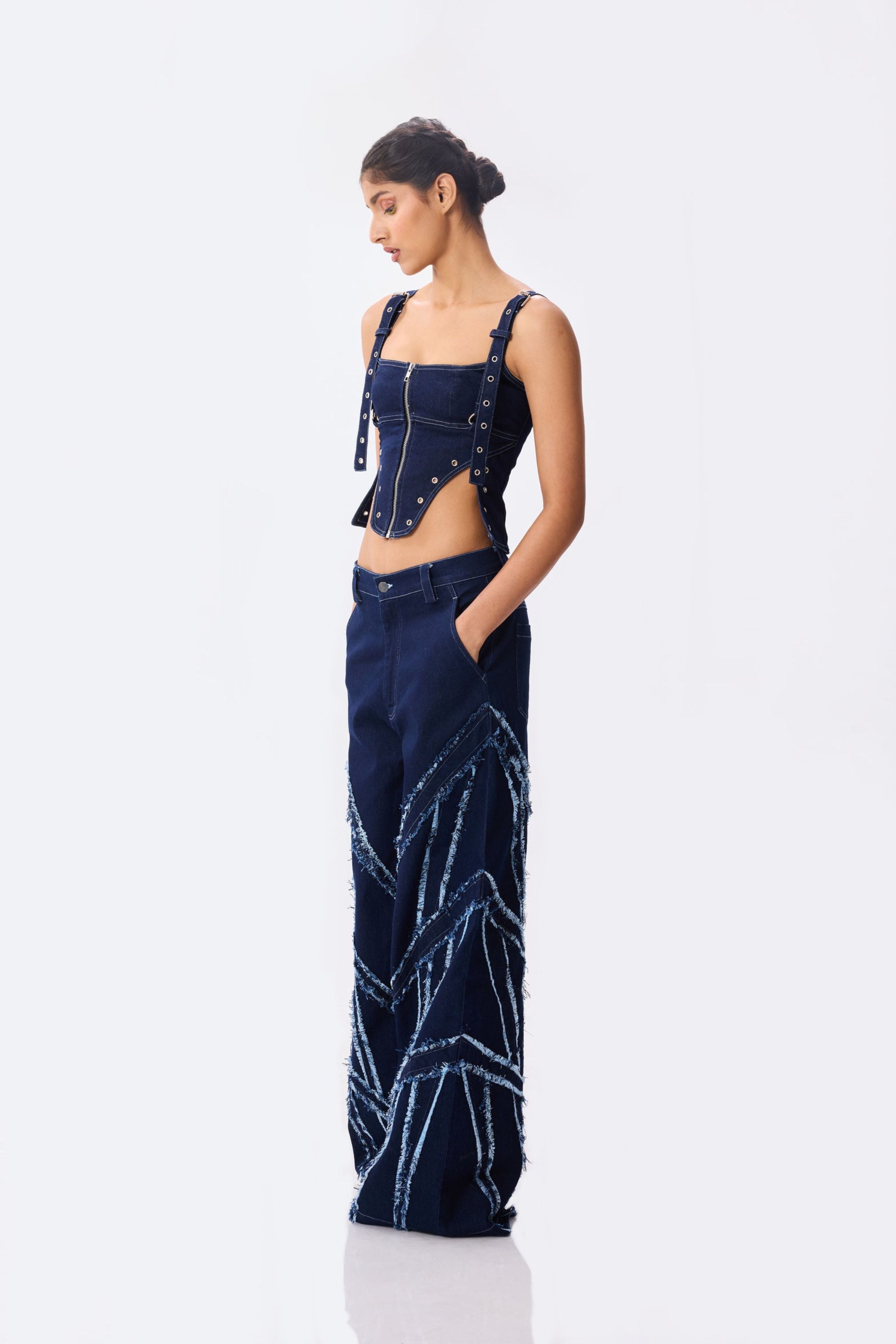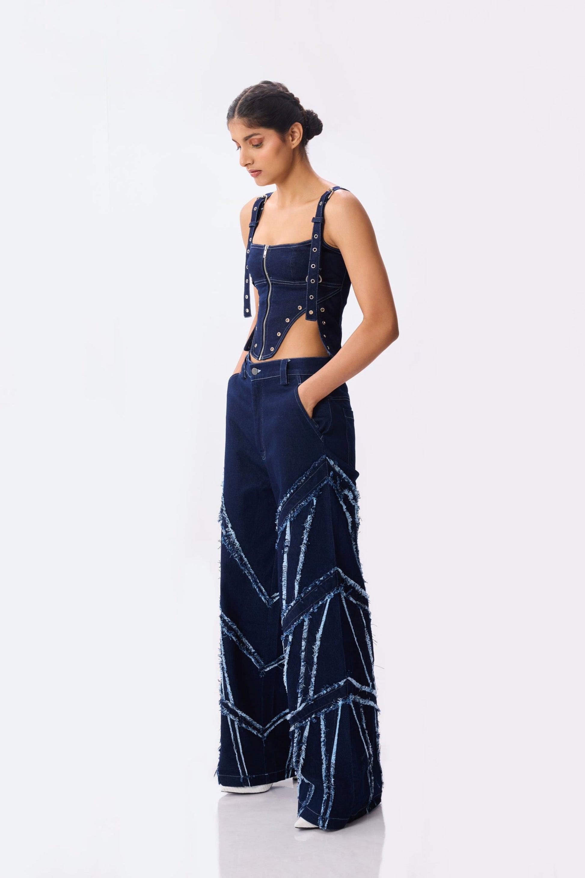 Made in premium raw denim fabric, this pair of jeans features unique panels of denims patched one on top of another to give an illusion, with raw edges and loose threads to give it a rugged look. Regular front zip closure and elasticated back for comfort, along with 4 pockets for added utility.