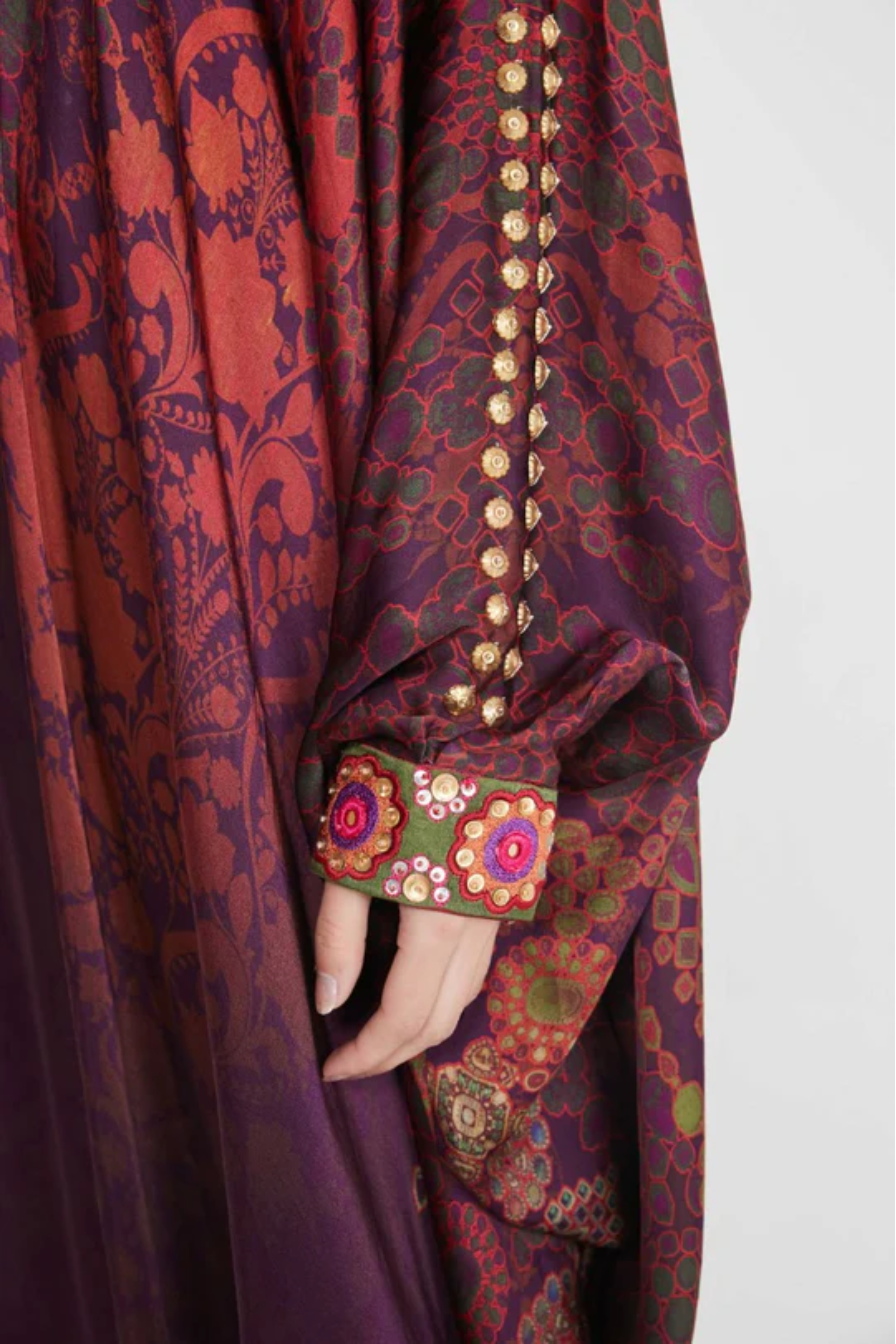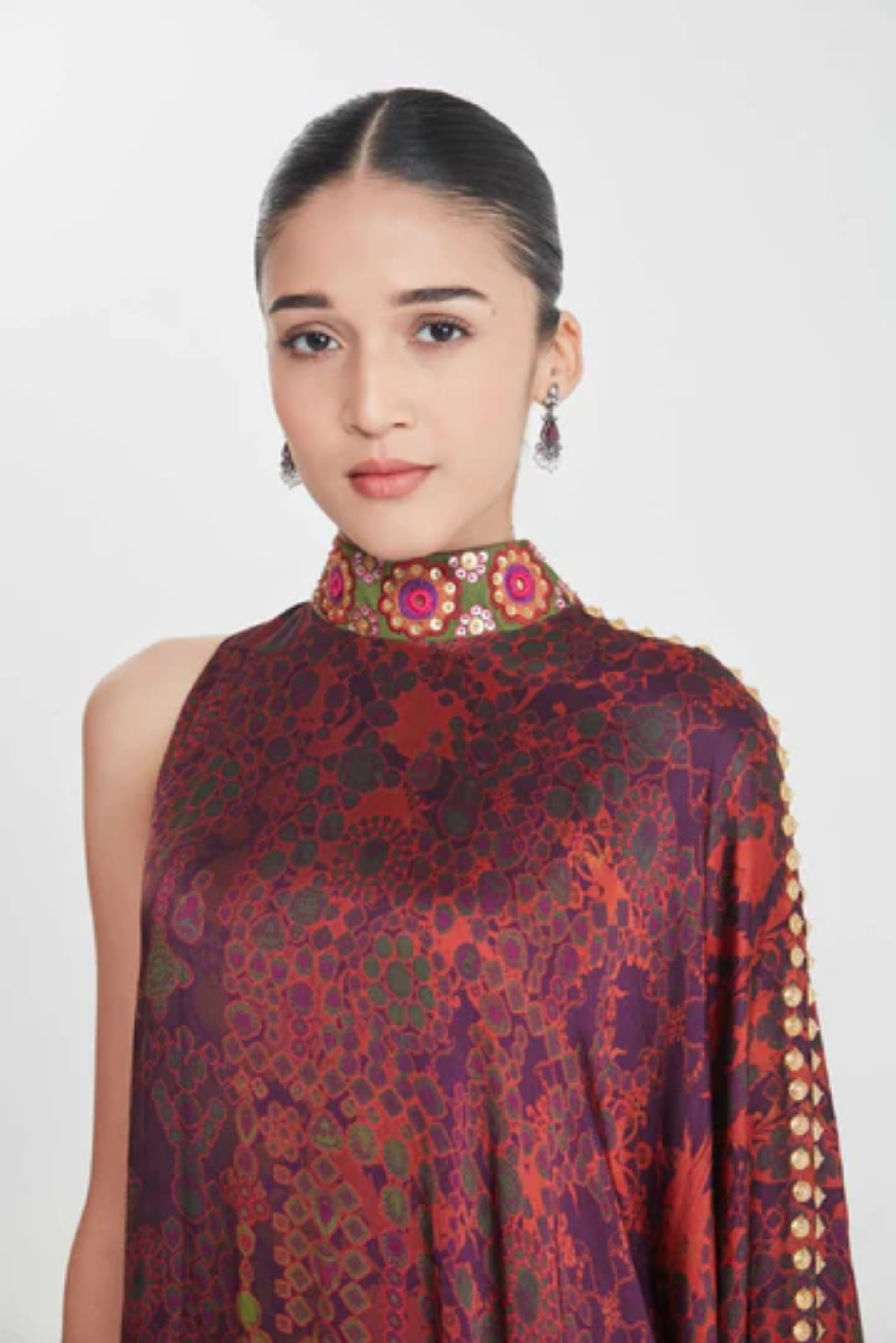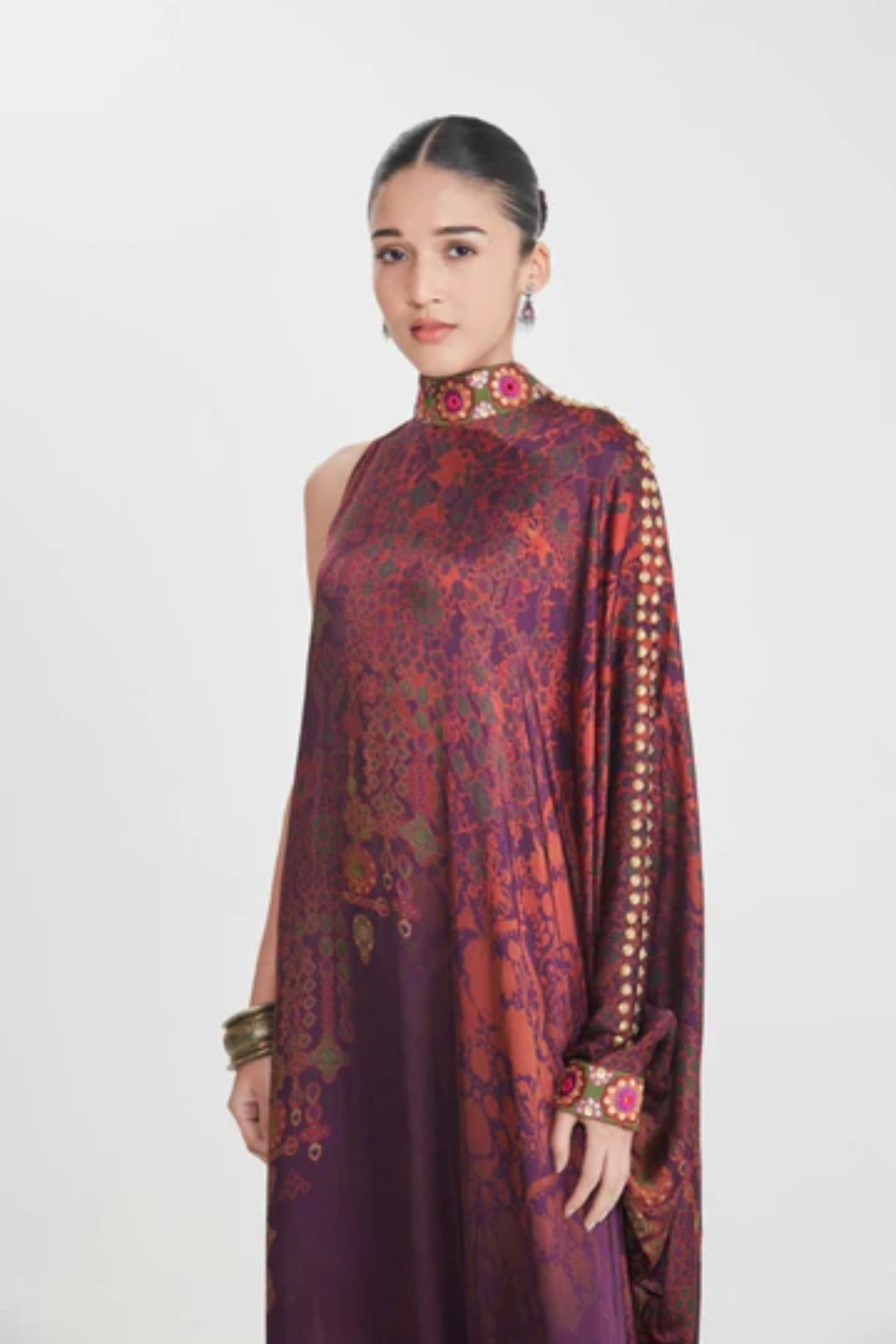 Description Moca Jewel Tone Printed, Hand Embellished One Shoulder Dress Featuring Mirror Work In The Collar, Cuff And Shoulder Embroidery Details Product Code