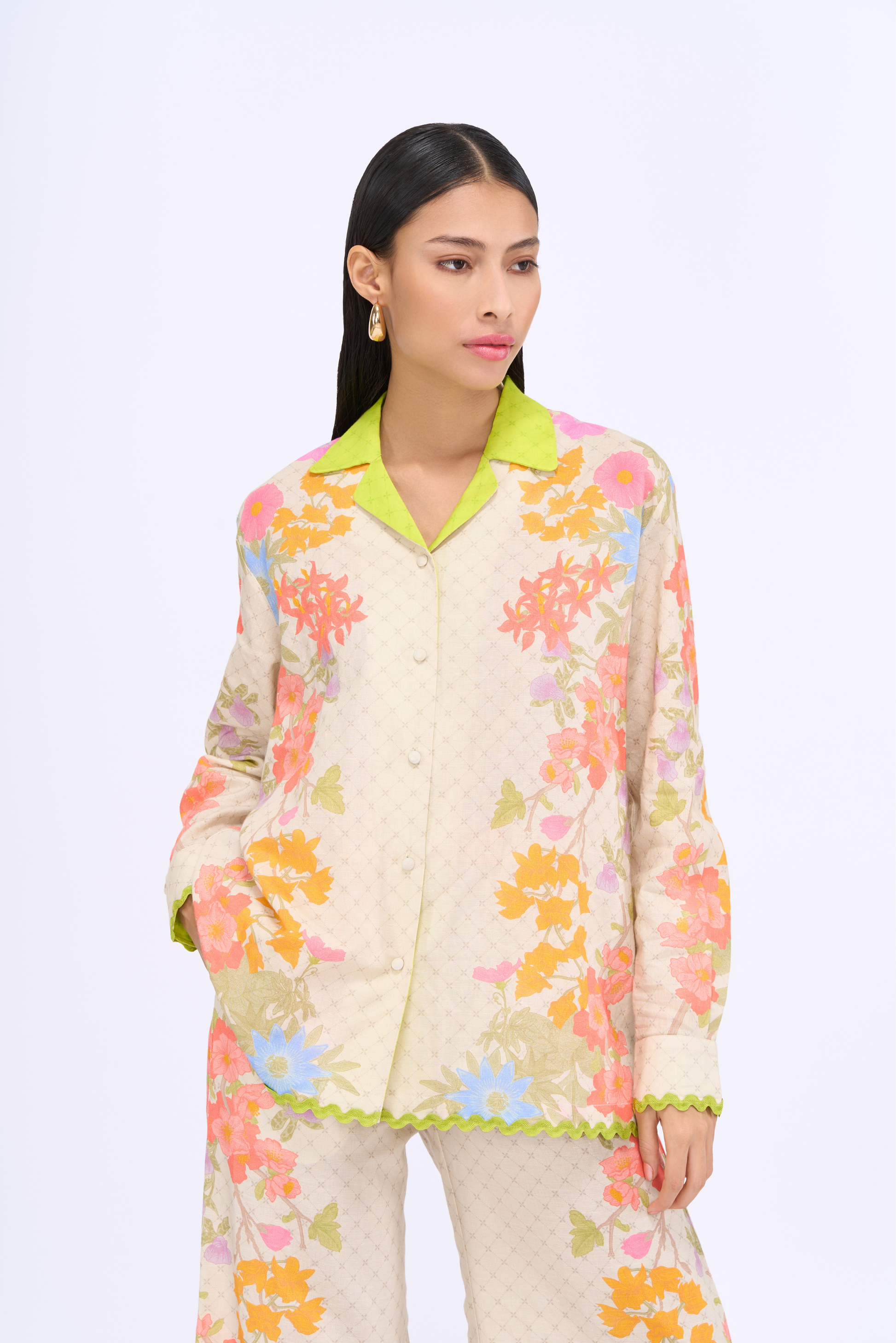 Product Description Floral placement printed cuban collar shirt with matching wide leg printed pant co-ord set.