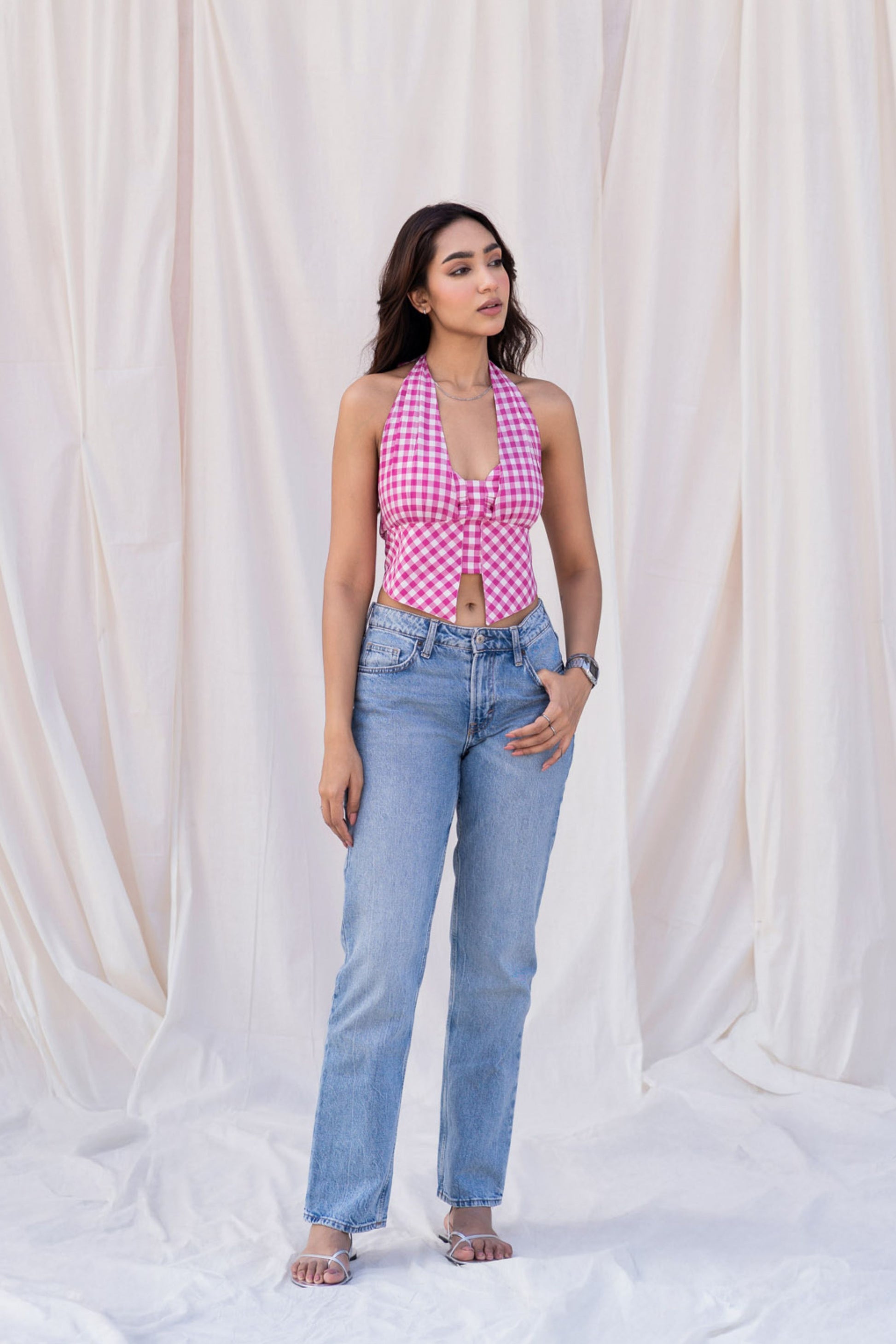 Make a statement in this Pink Gingham Halter Corset Top featuring a flattering fit and subtle slit detail at the bottom hem. Perfect for summer plans casual dates or holiday looks.