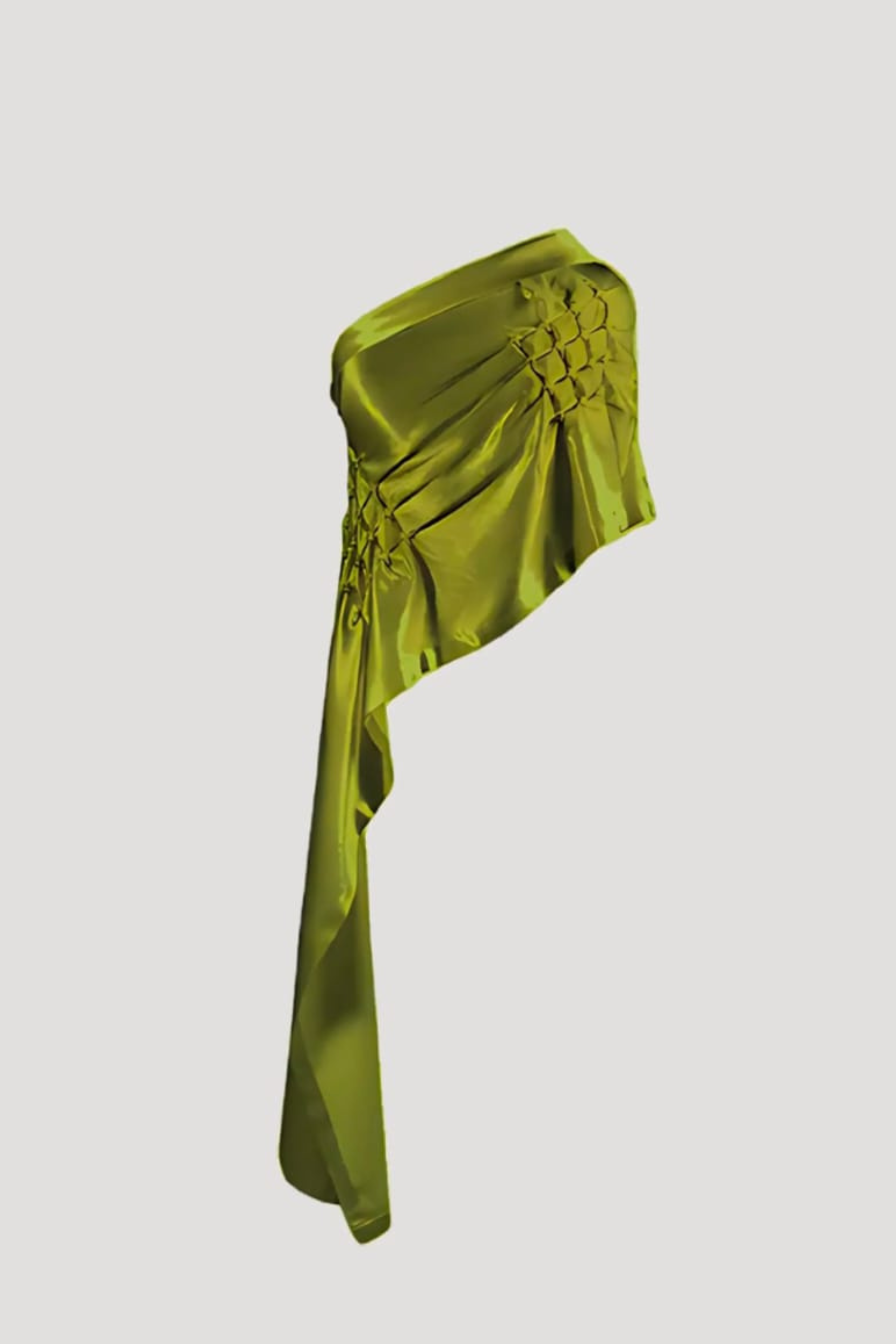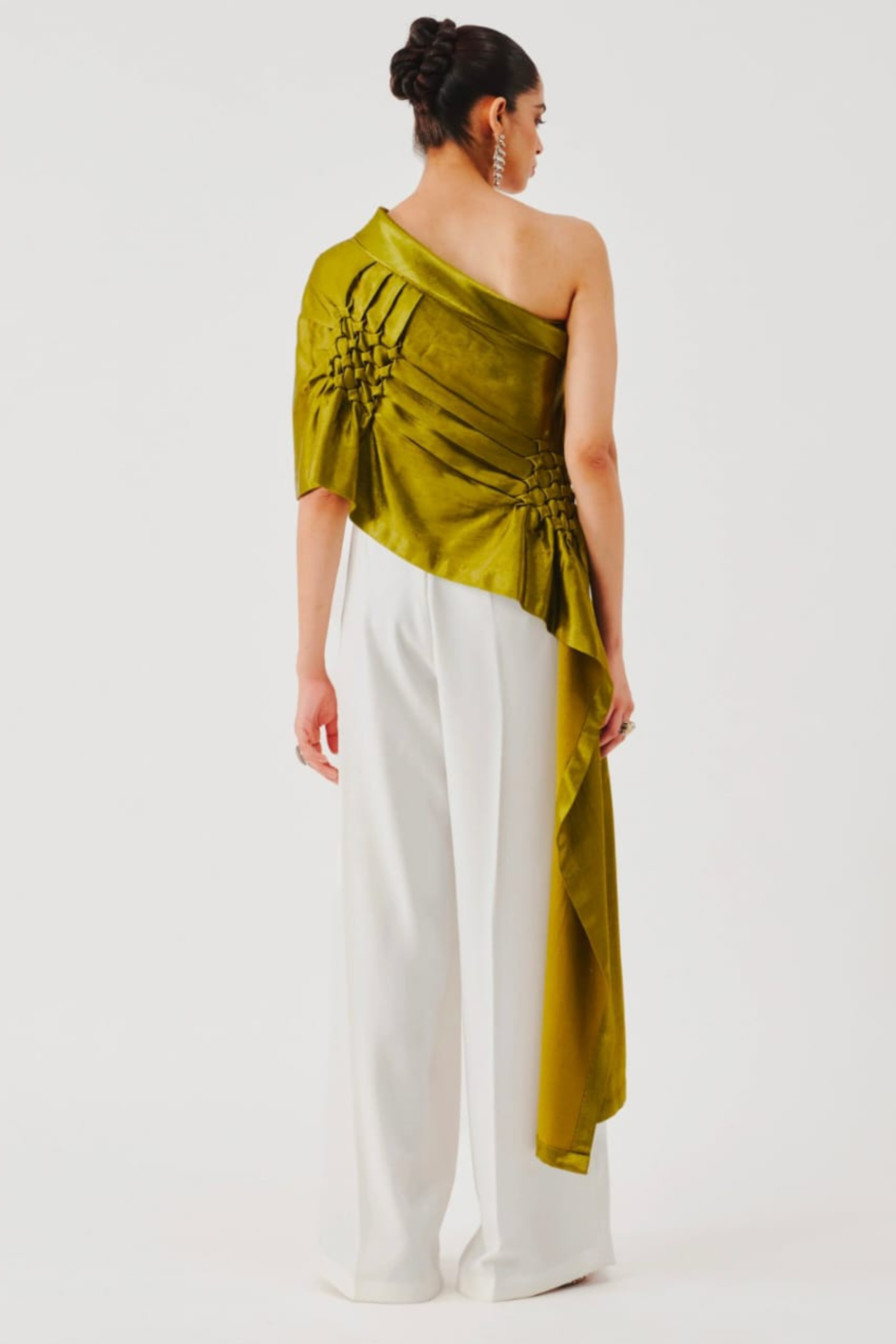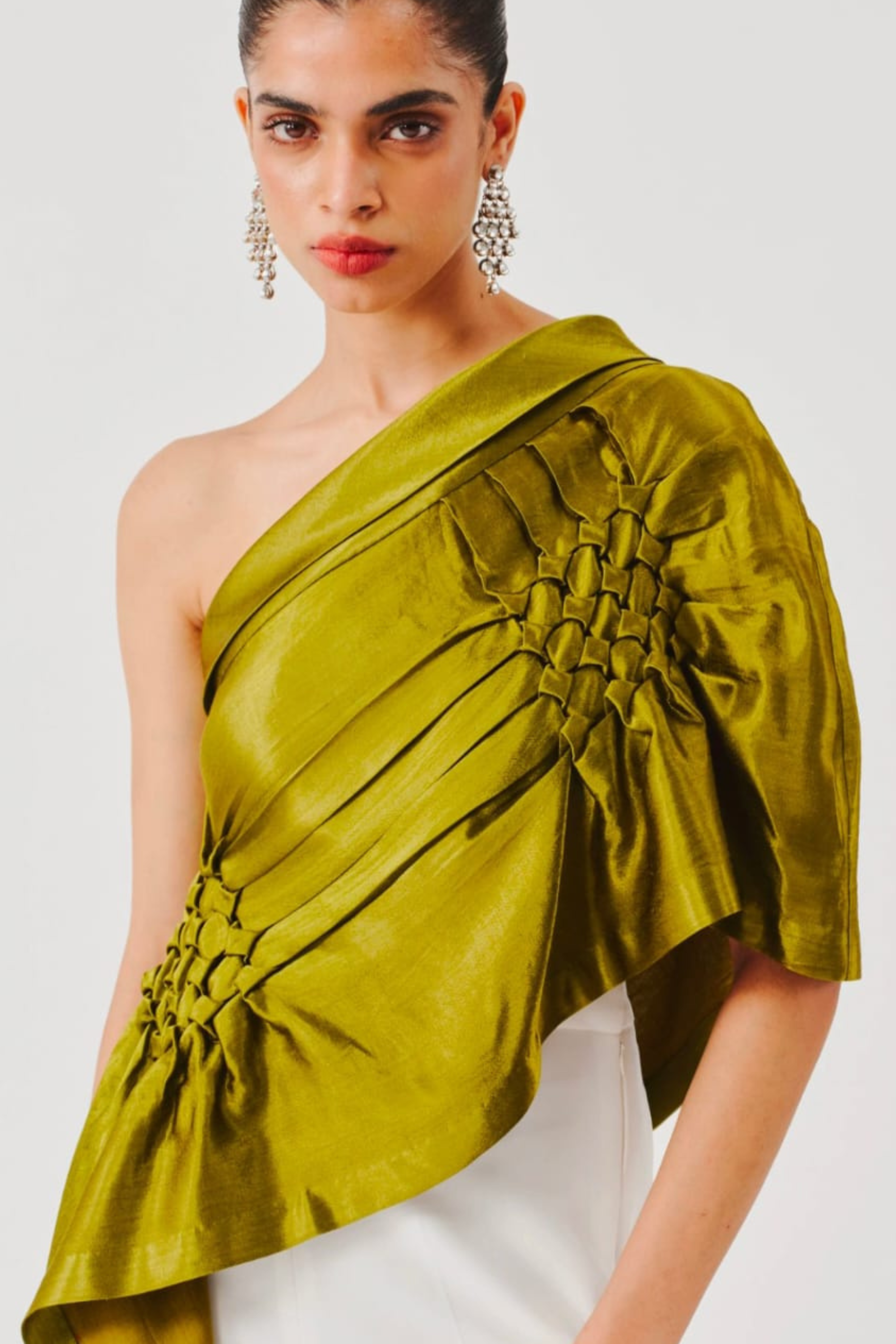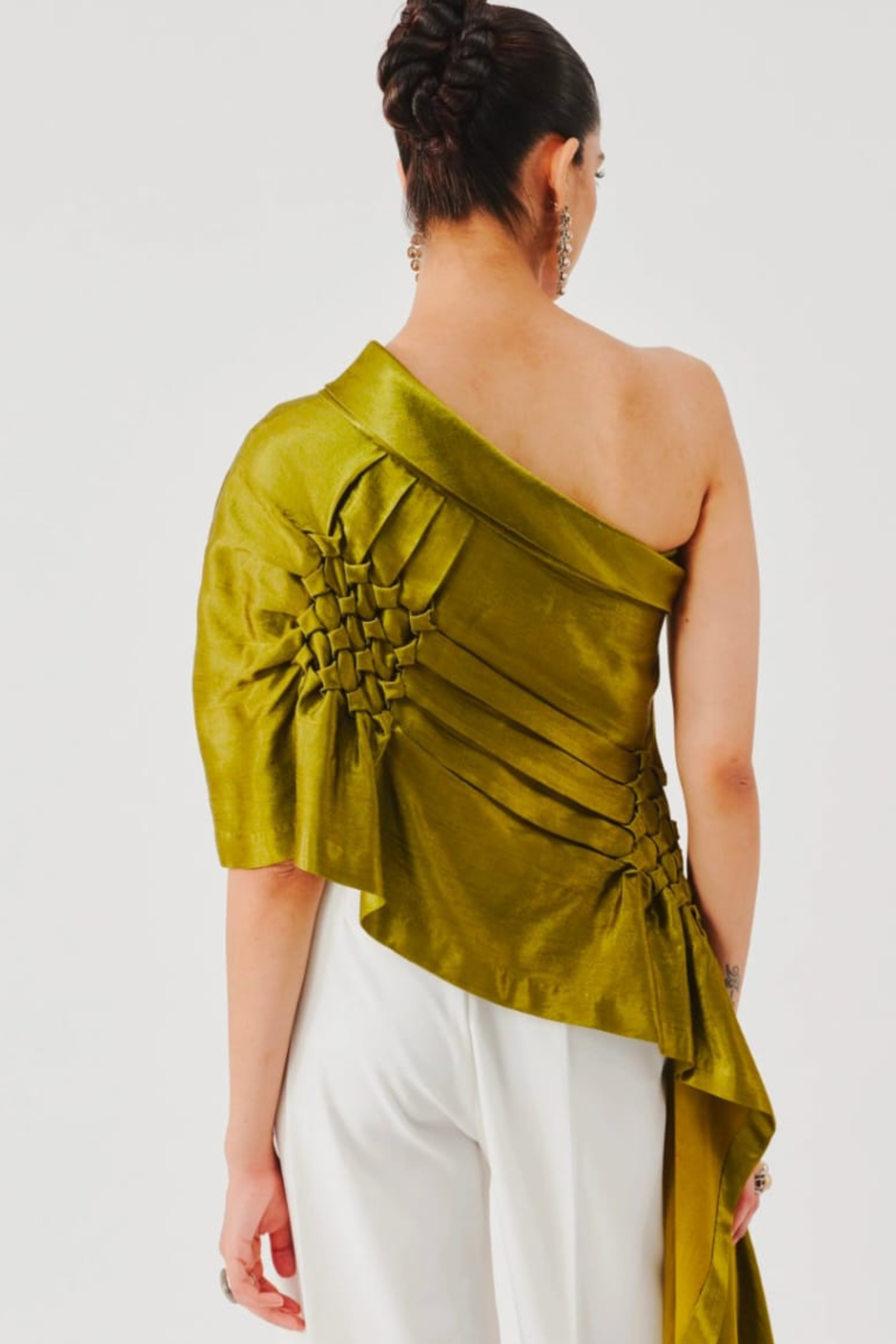 - Off-shoulder asymmetric top crafted from handmade vegan mashru