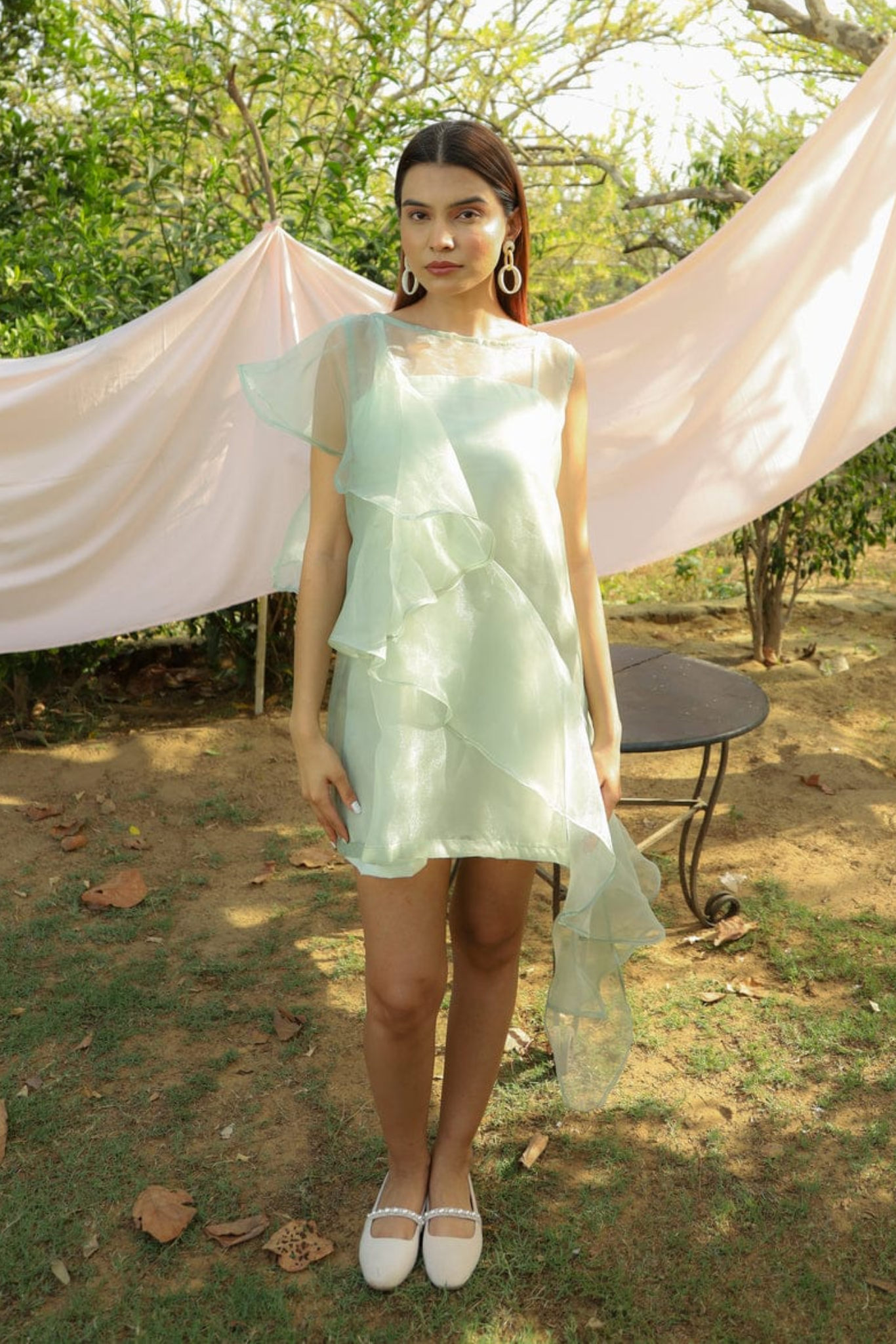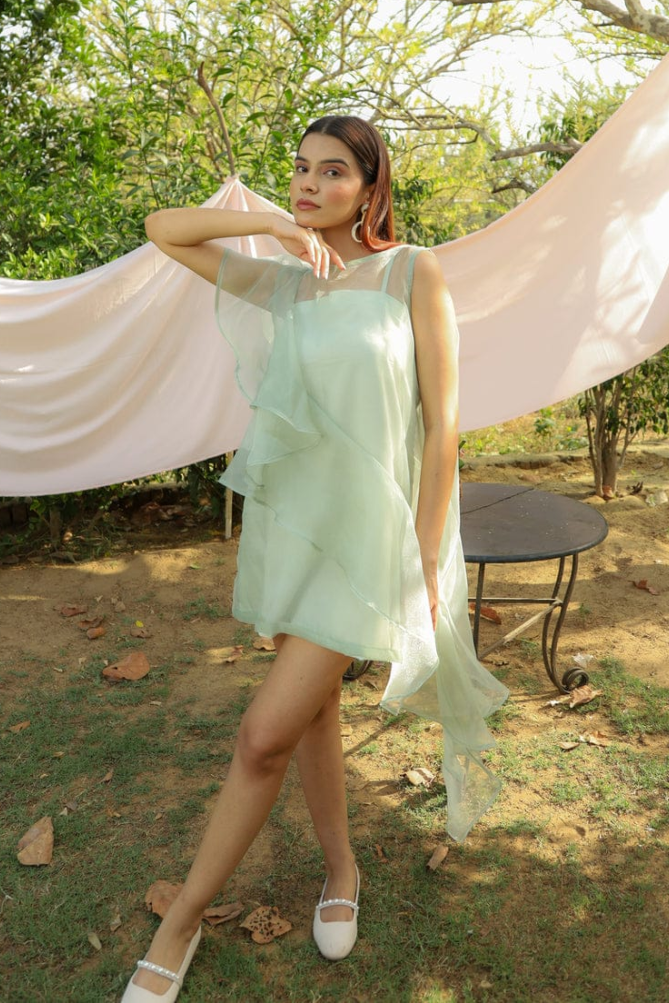 Pistachio organza shift dress- Shift style dress cut from the creamy organza that has a beautiful flounced details throughout the dress. Comes with a slip made in light crepe. Flirty, feminine the perfect dress to take you from Holiday to parties, to date nights.