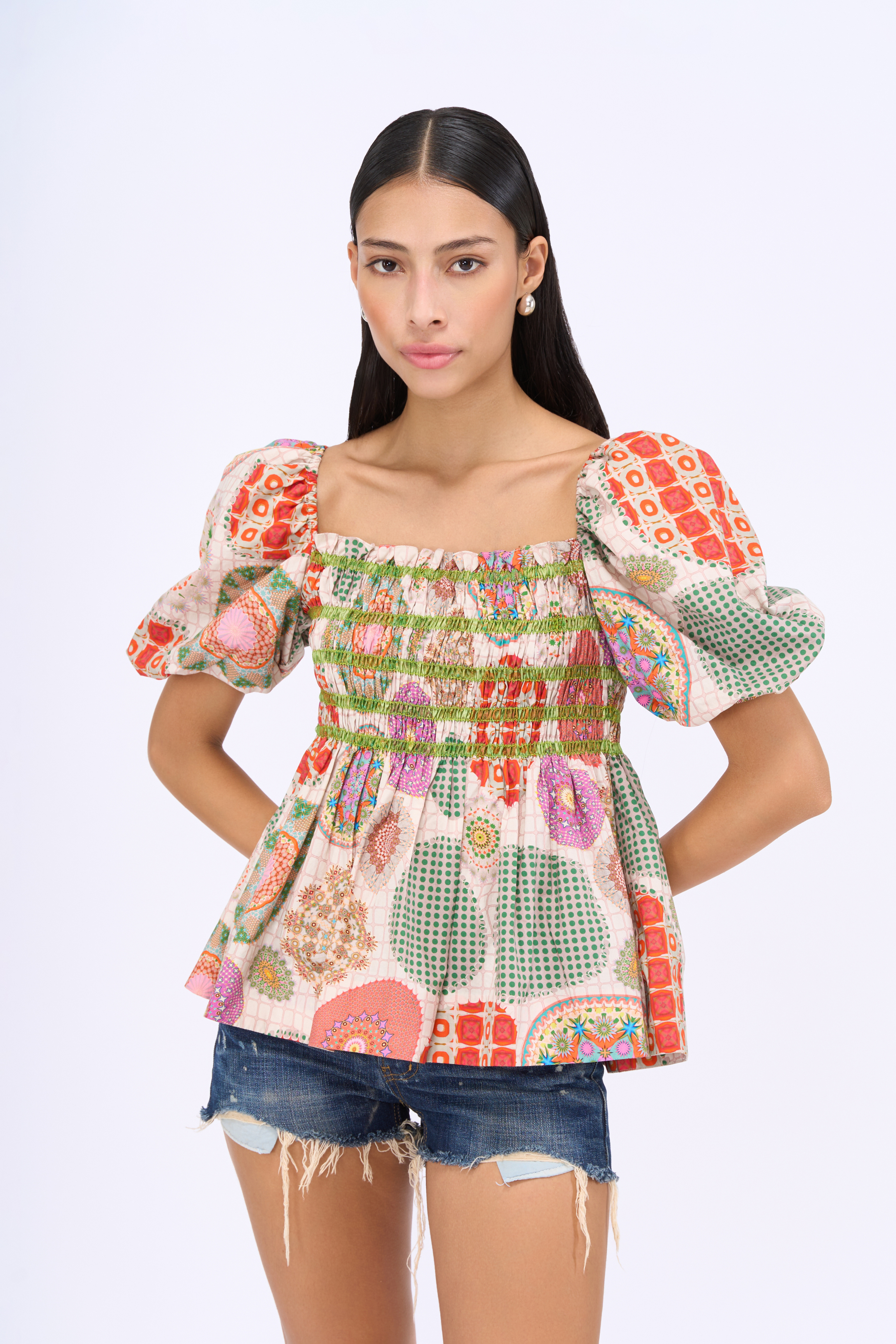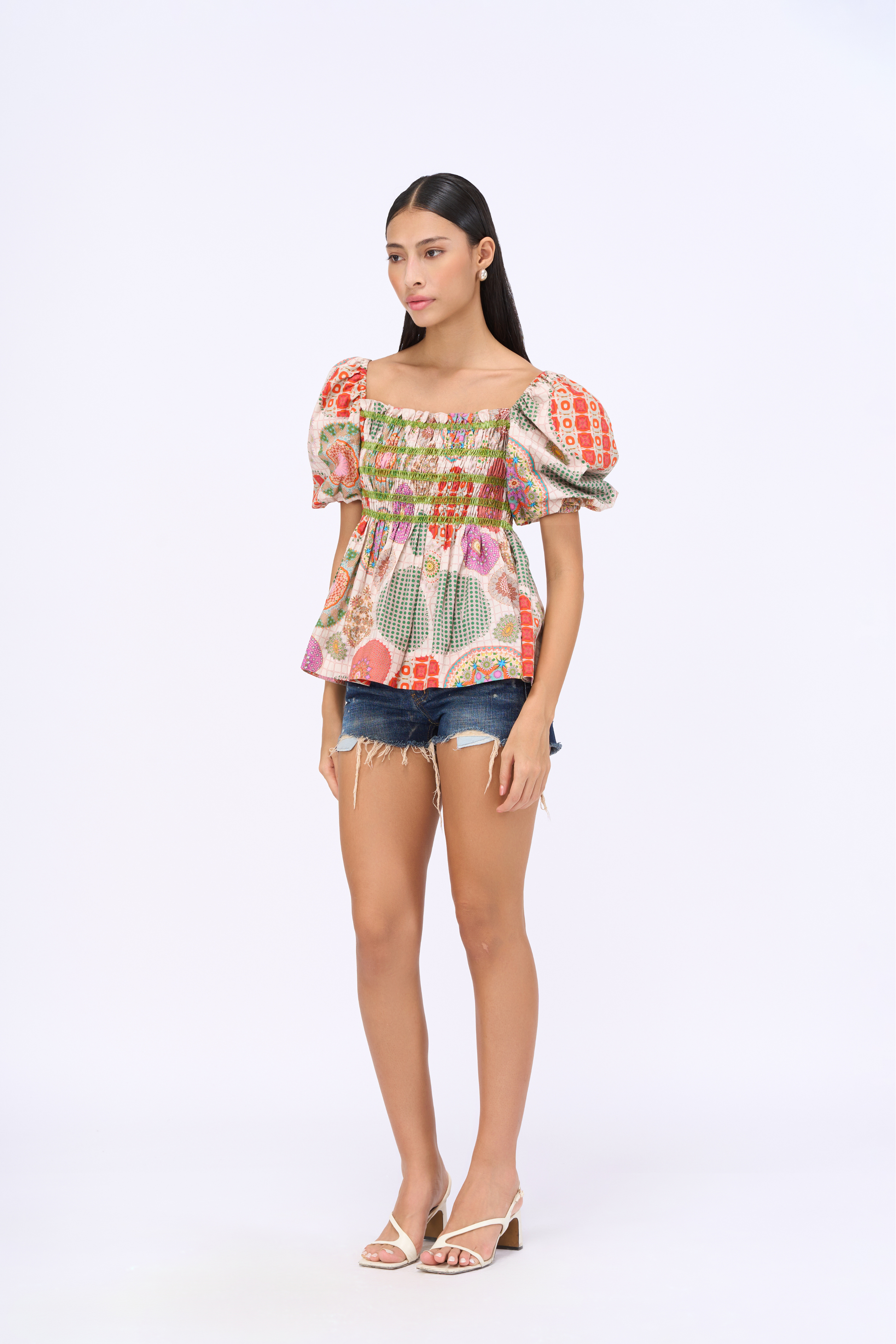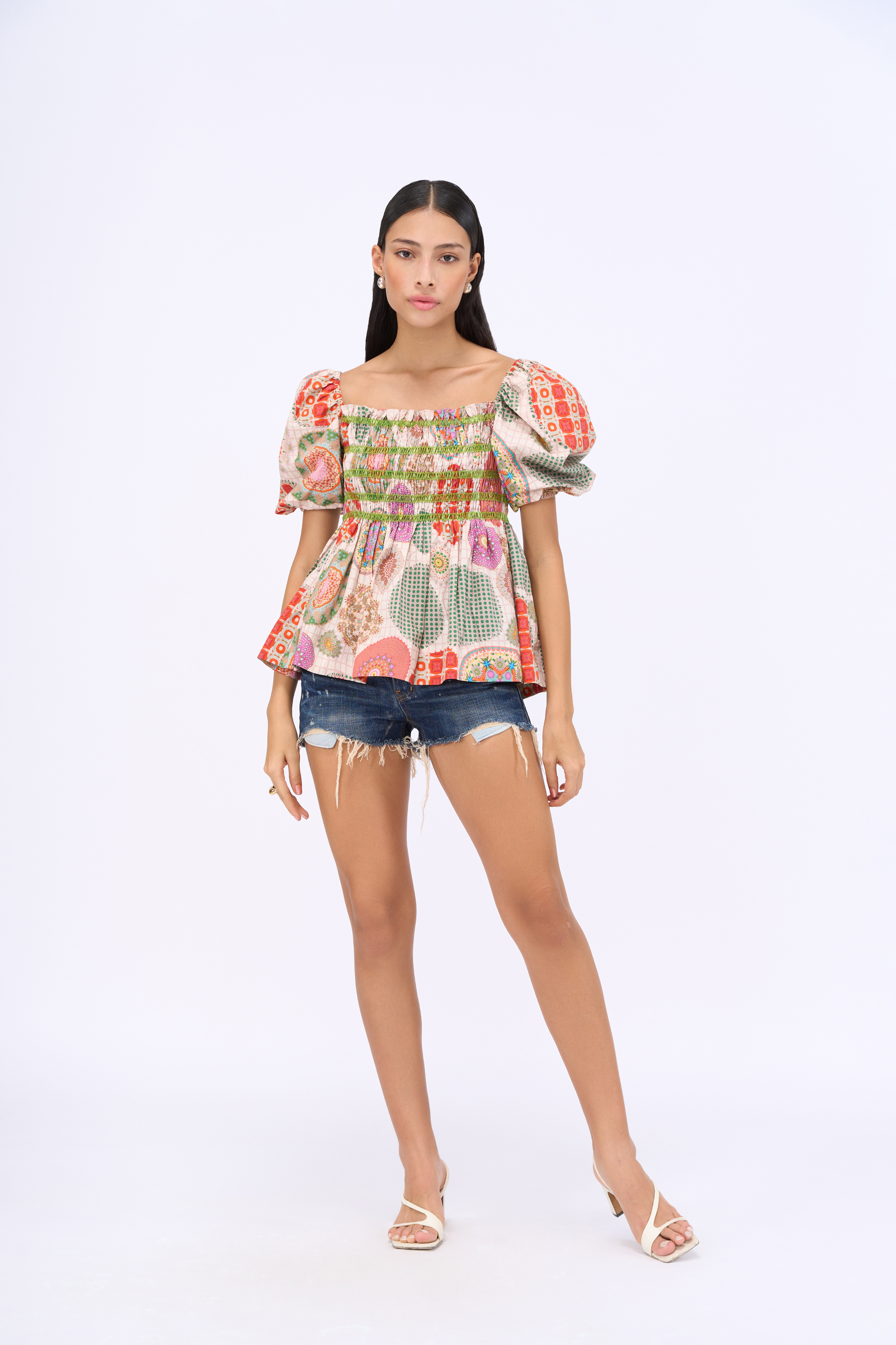 Multicolor kaleidoscopic print puff sleeve peplum style top with smocking and ribbon detailing.
