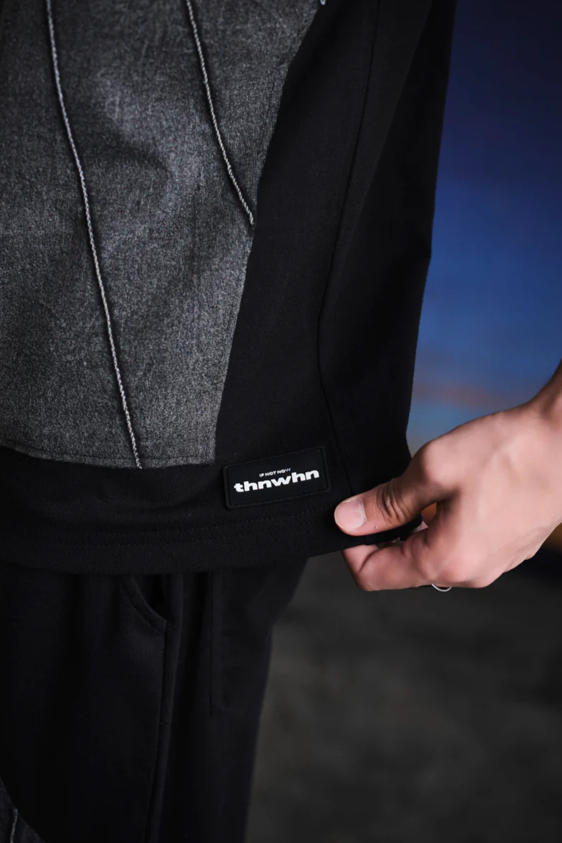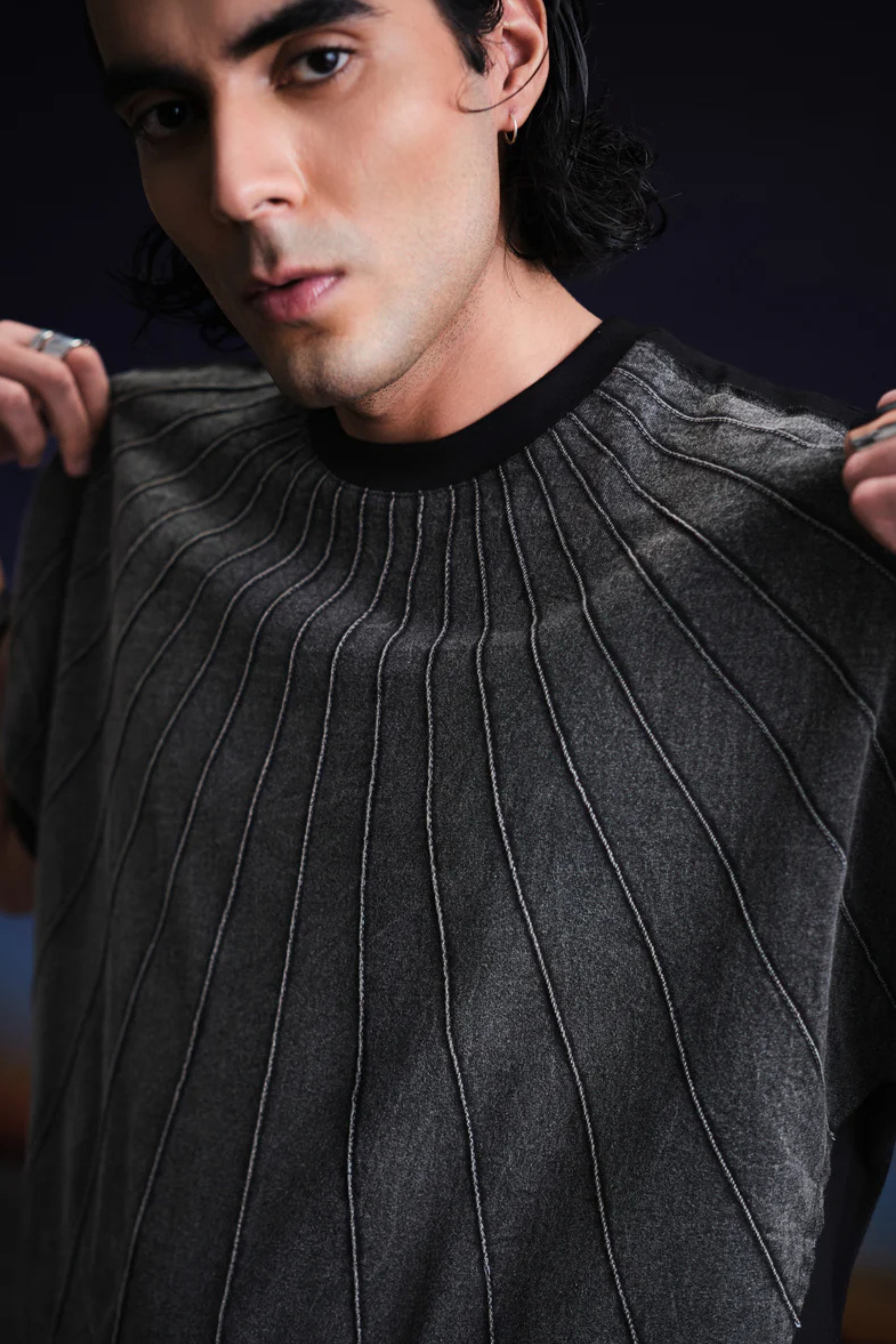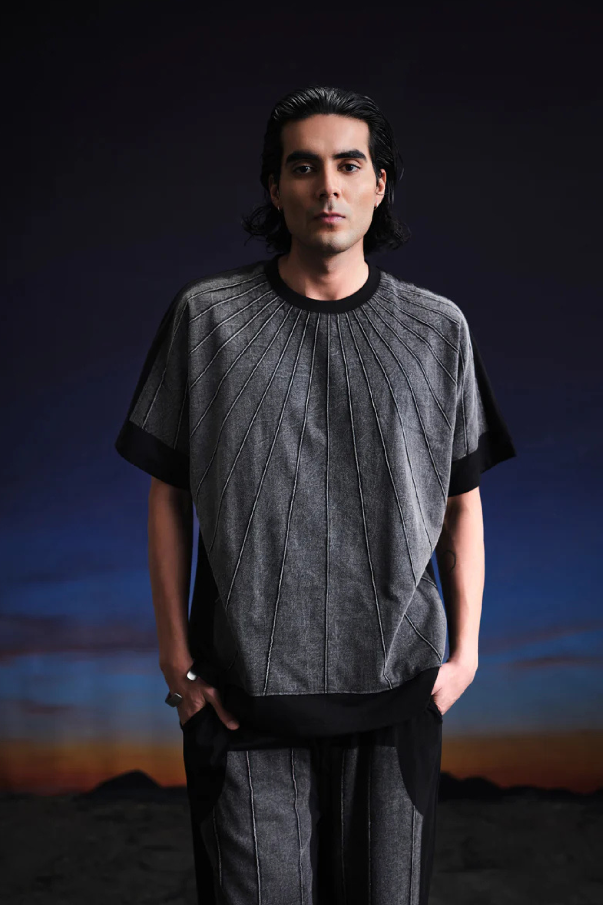 An acid washed panel of pin tucks placed in the form of rays emerging from the neck, is carefully patched on a black tee to construct this tee. The patch also showcases meticulously made pin tucks emanating like sun rays from the neckline. A boxy fit with drop shoulders and batwing sleeves form the silhouette and signature branding at hem completes the look. Product Code