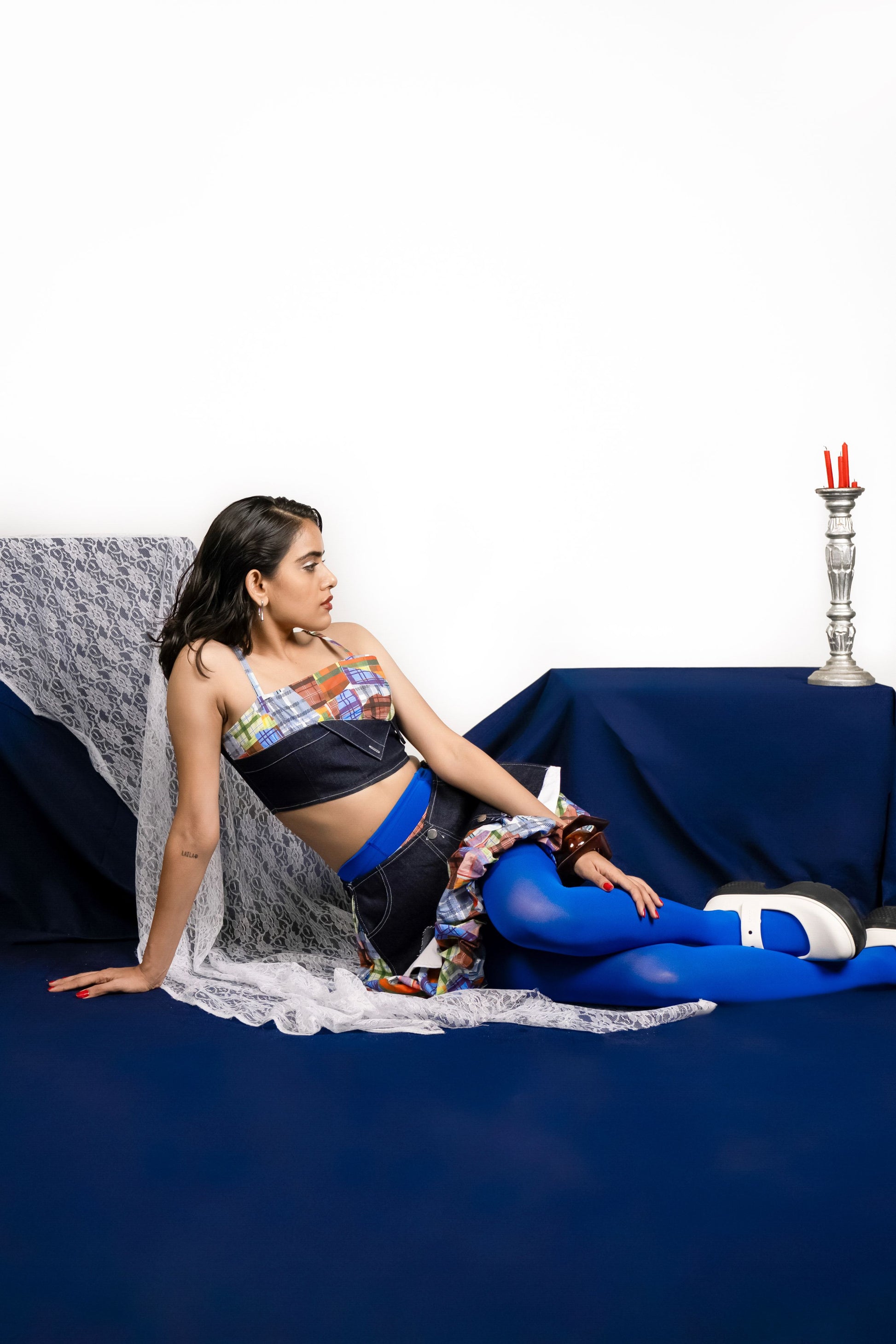 Thnwhn original print inspired from chaos in structure, with different checks coming together. This cropped top is crafted from denim and printed cotton poplin. Denim panel is inspired from an undone pant, with waist belt like panel going across the chest and opening just below the left bust with faux-buttonhole detail. Adjustable straps make the fit comfortable with zip on the side.