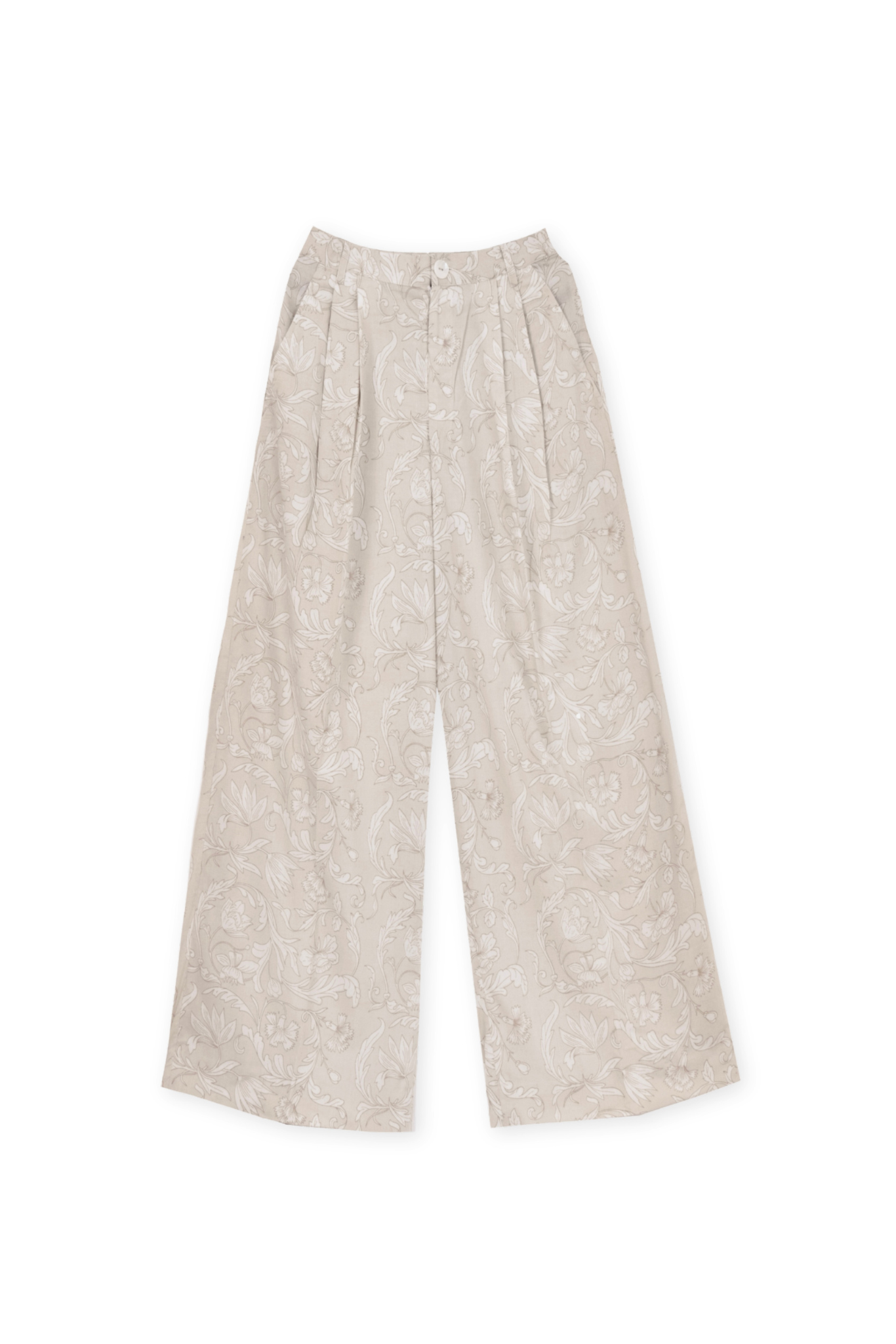 These wide-leg pants offer a seamless fusion of comfort and elegance. Crafted from airy, lightweight fabric, they drape beautifully, allowing for effortless movement. The relaxed fit is complemented by an elastic waistband at the back, ensuring both style and ease. A subtle floral pattern enhances their refined aesthetic, making them the perfect match for the coordinating shirt or a versatile standalone piece.