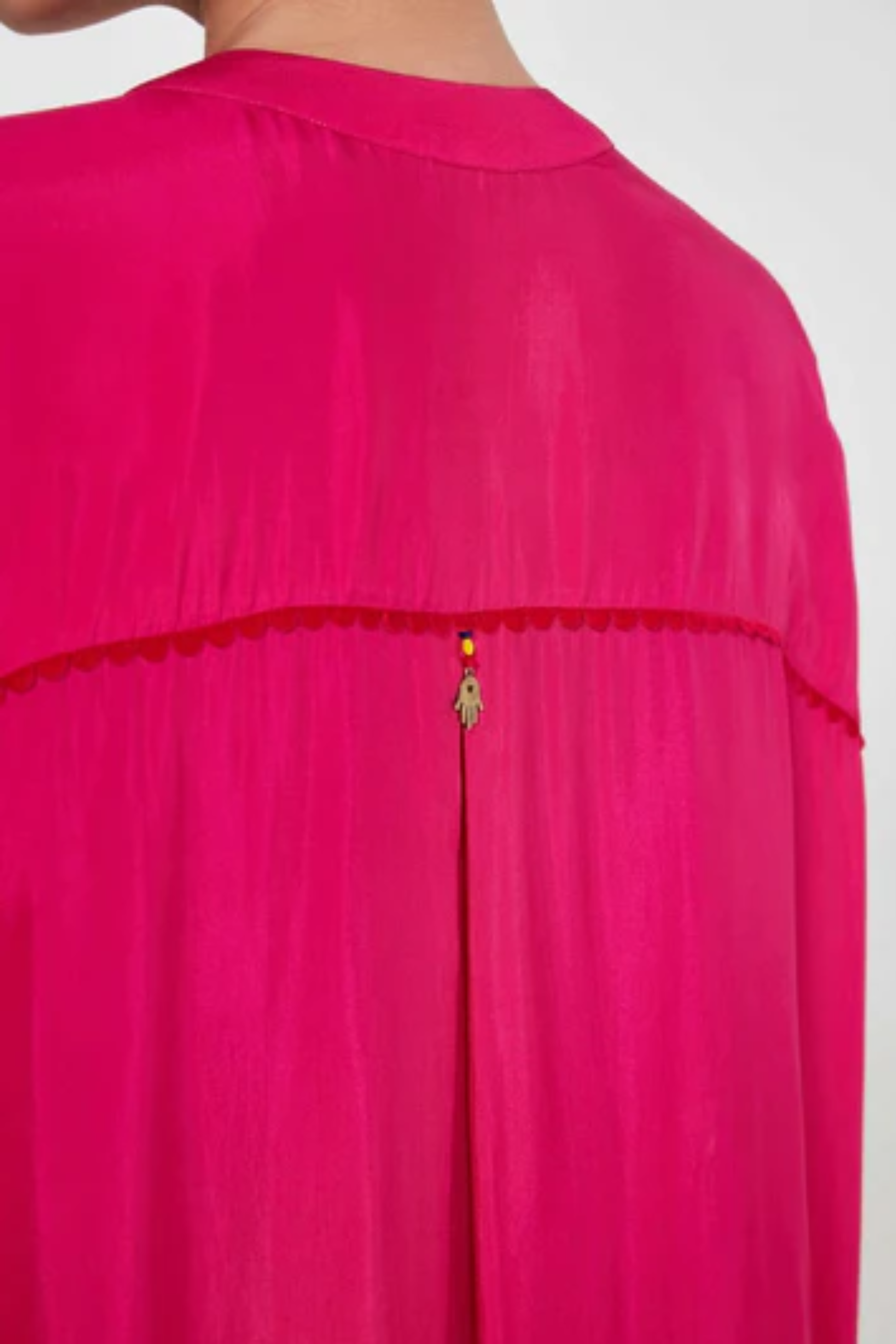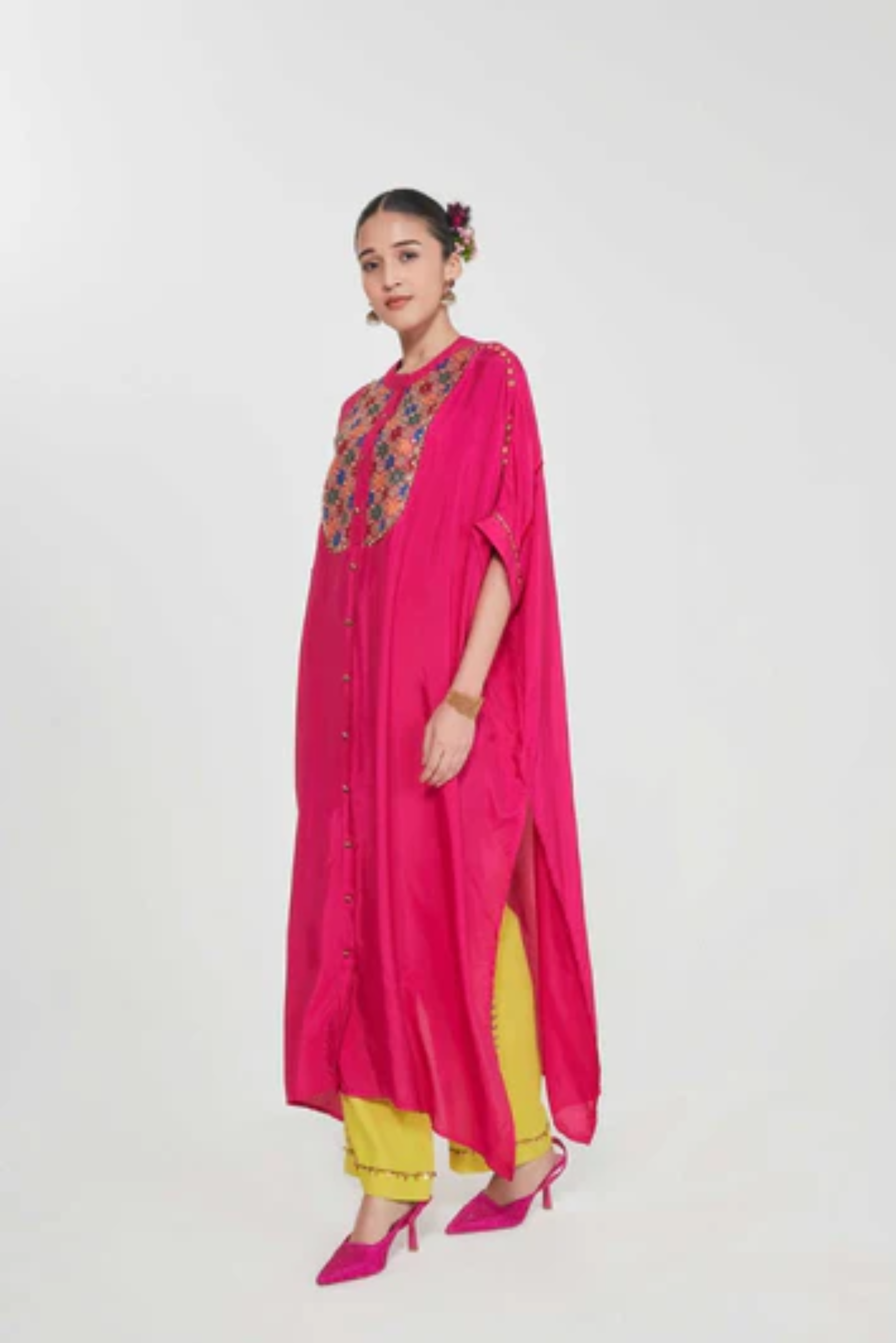 Description Rani Pink Free Size Kurta Featuring Hand Embroidery At Yoke And Sleeves, Paired With Yellow Blossom Twill Pants With Hand Embroidery Detailing.