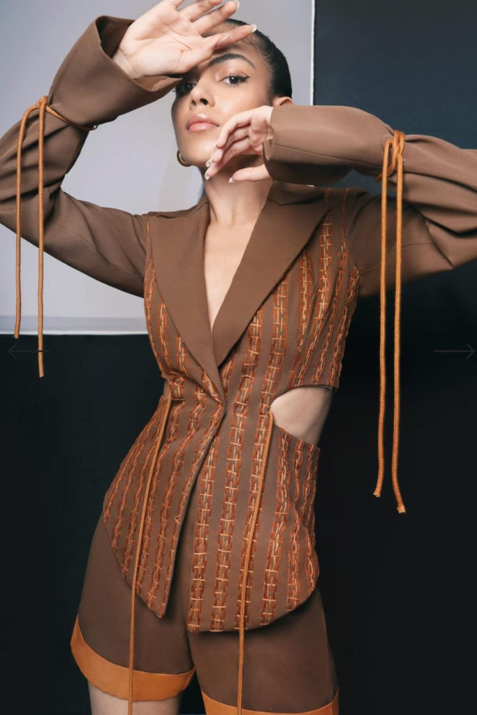 Blazer with cutouts, intricate handwork and tie-up details paired up with shorts